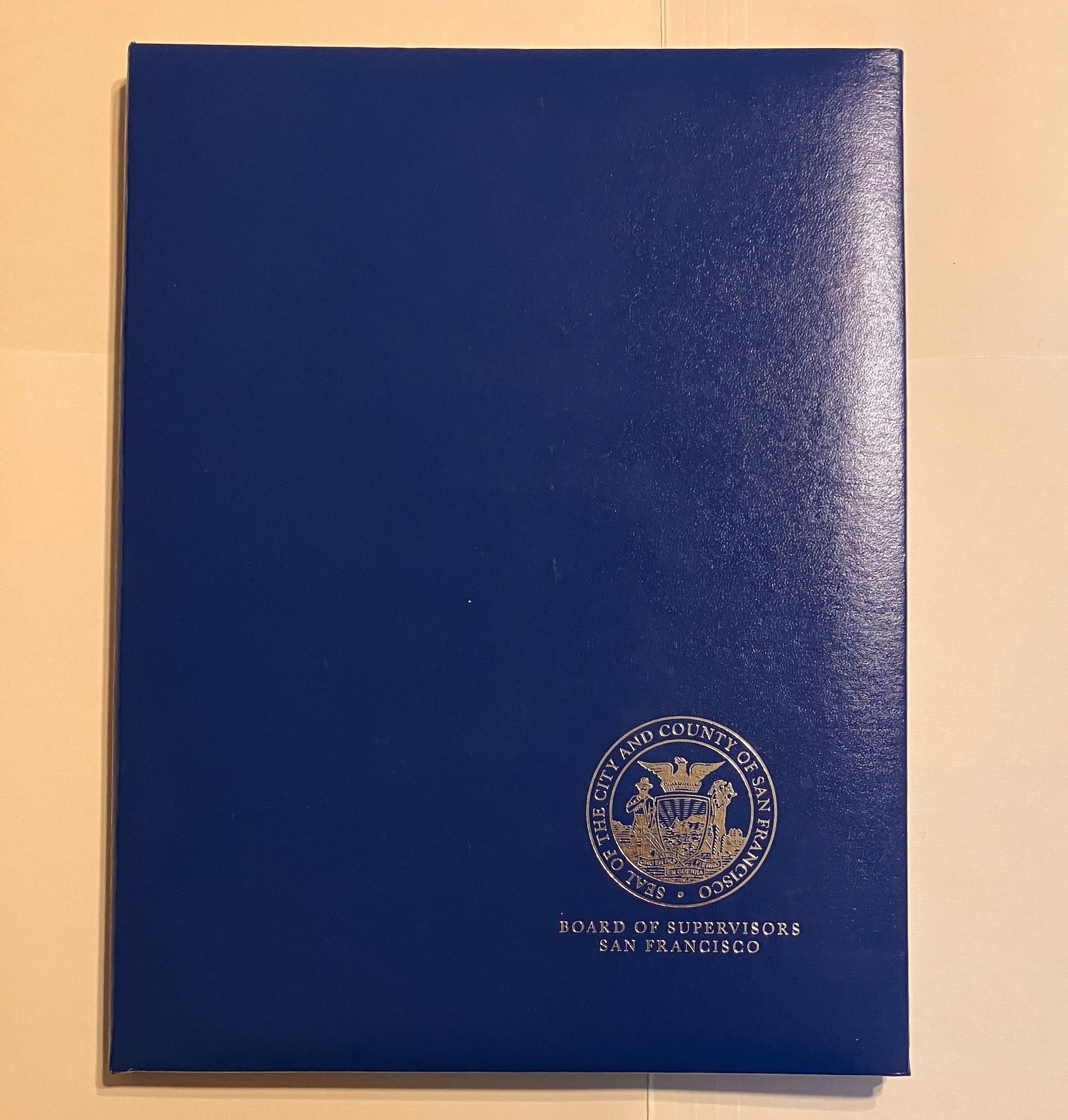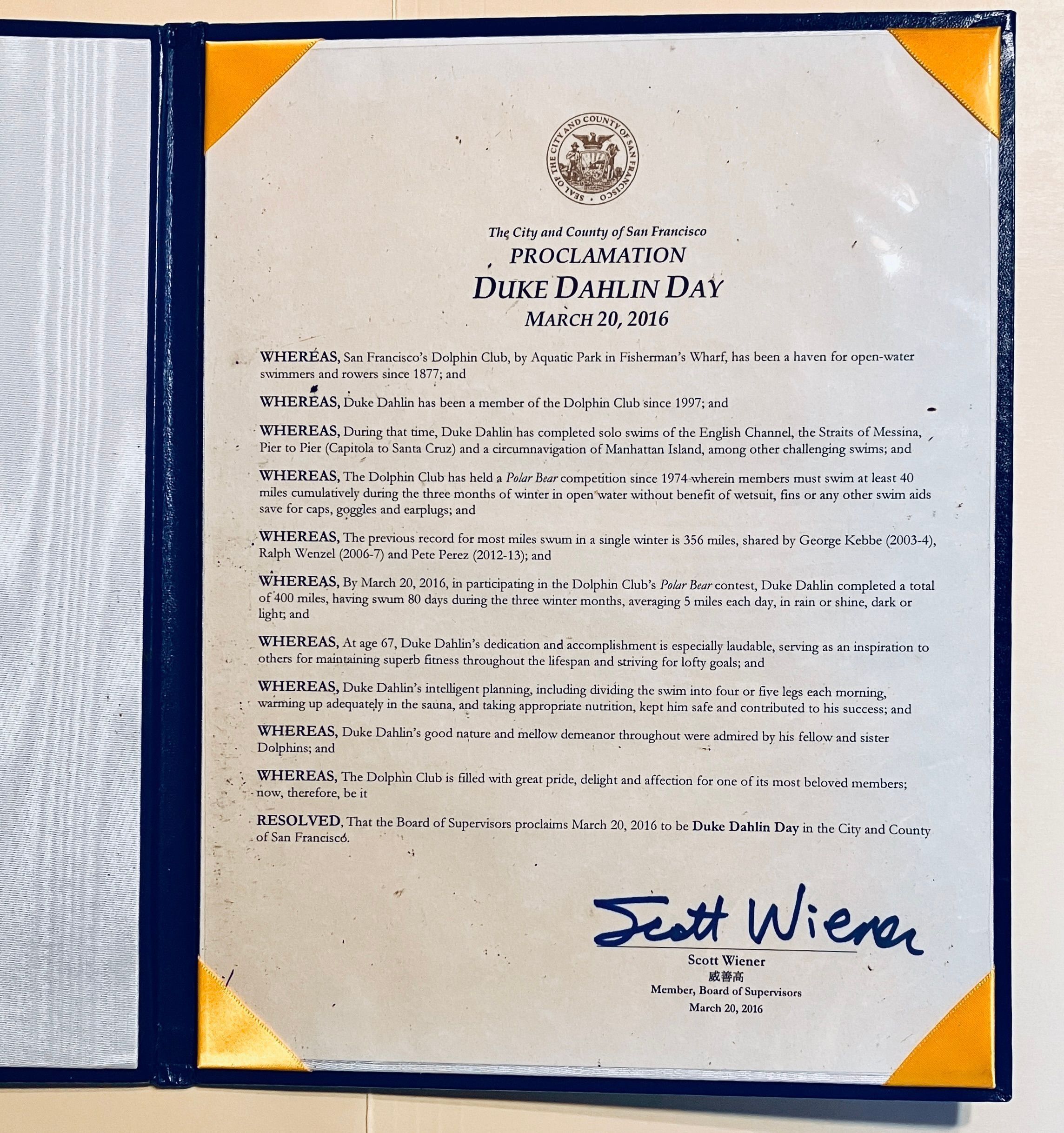 Blue leather bound City and County of San Francisco proclamation of March 20, 2016 as Duke Dahlin Day on the occasion of Duke's record setting 400 miles swim in Polar Bear swim winter of 2015-2016.