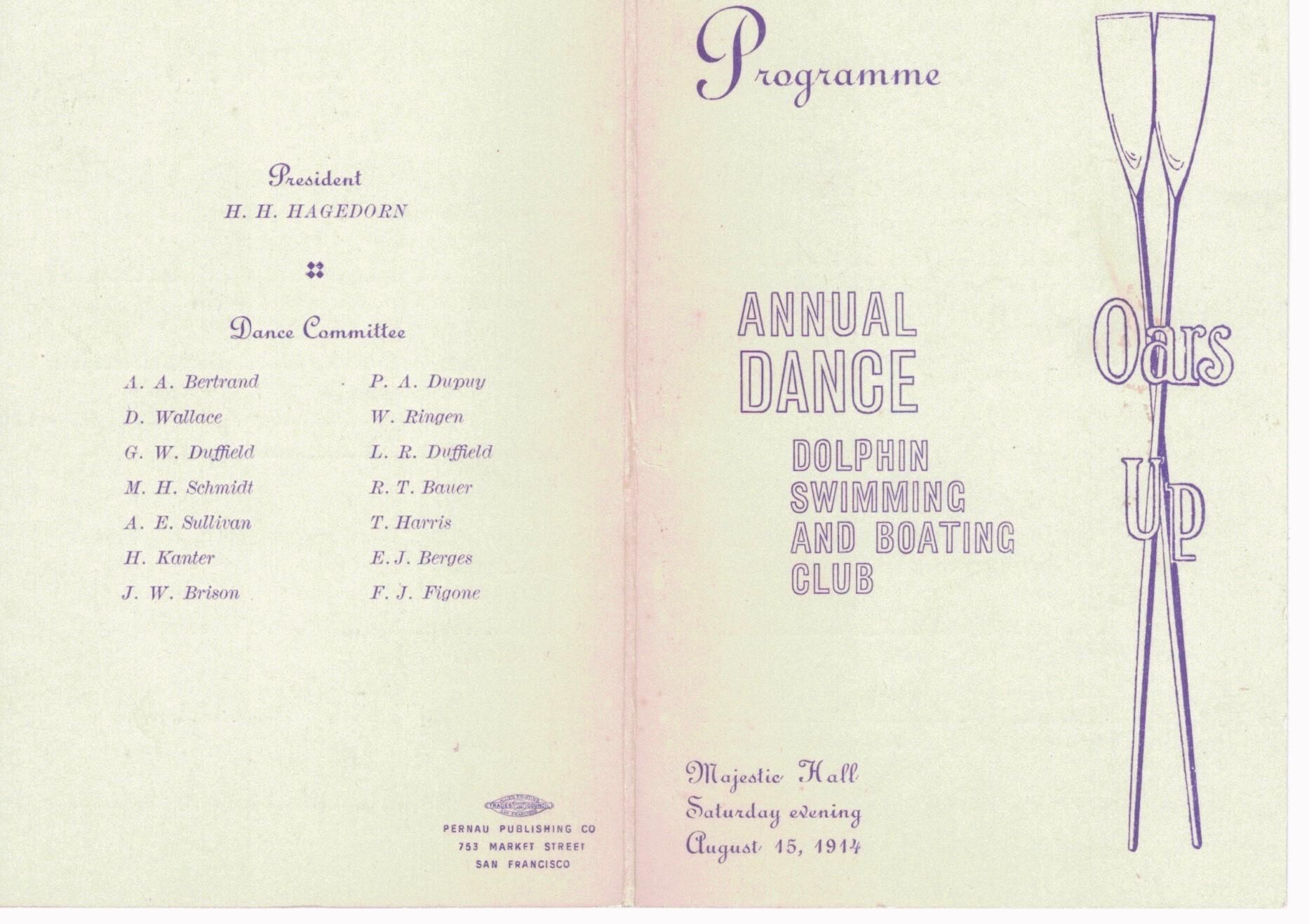 Thick white bond folded with Programme, dance title, date and Majestic Hall noted on cover with image of oars. Centerfold is a list of dances order and names with blanks to list dance partners. On the back of the little booklet is the name of President and dance committee members.
