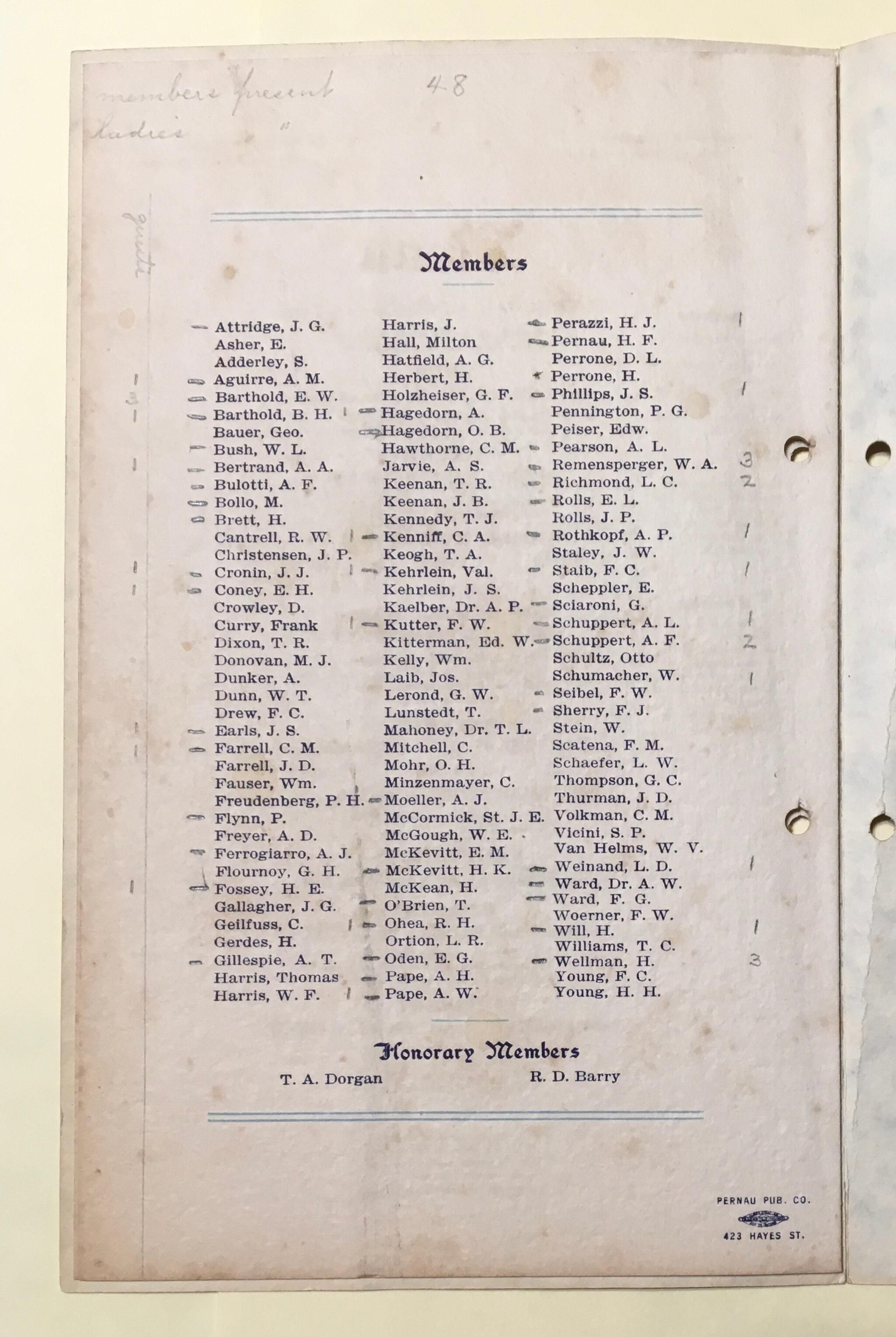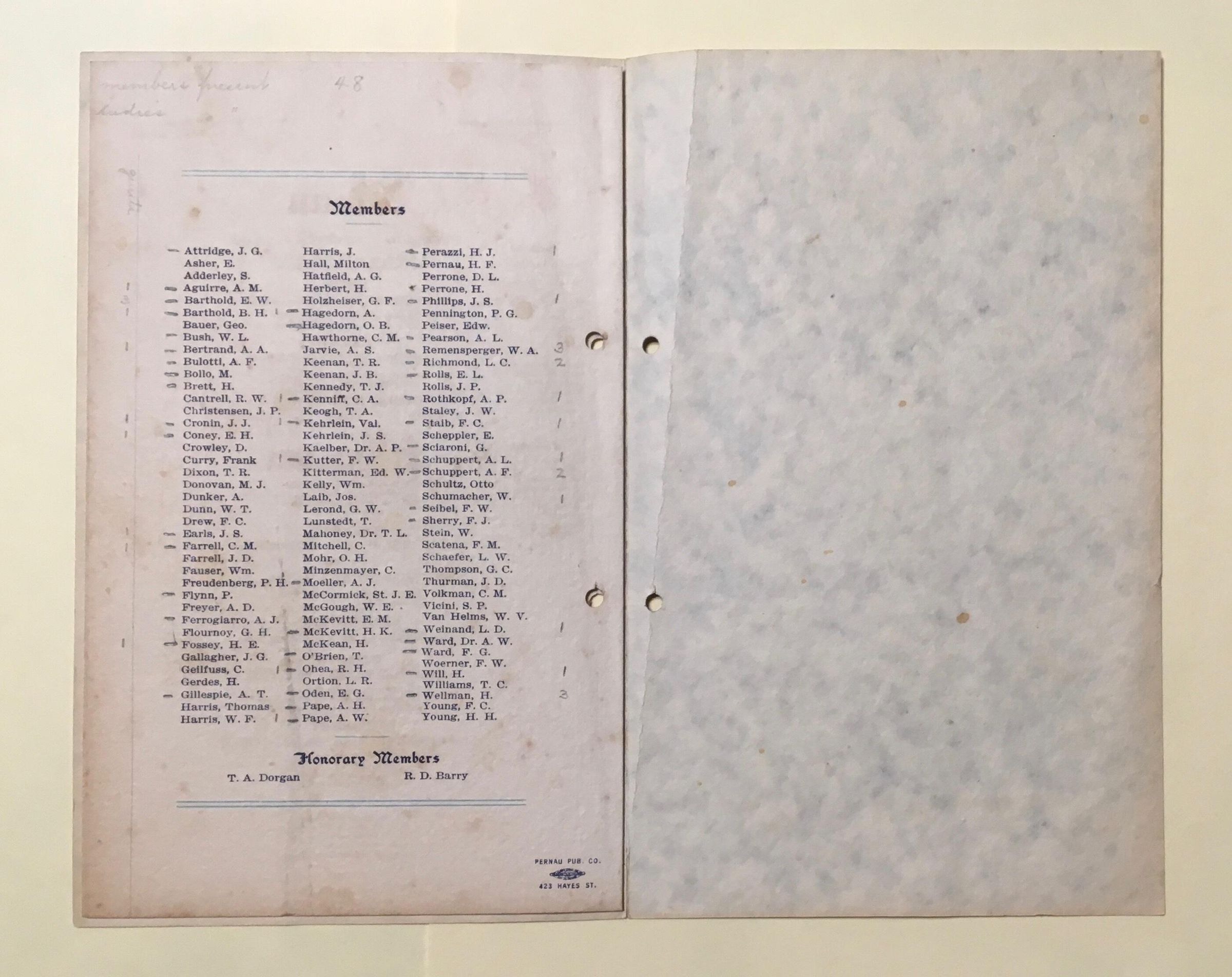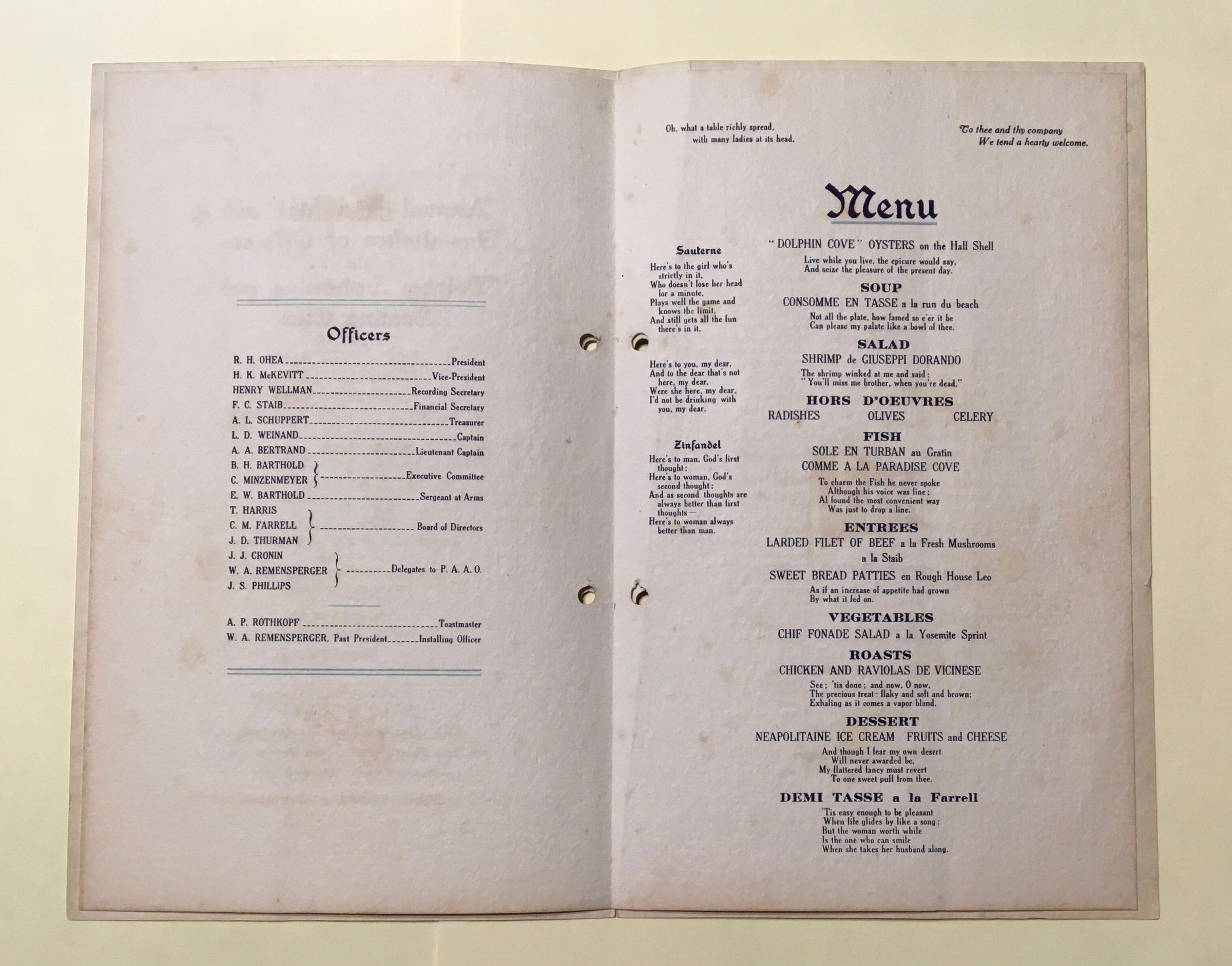 Card cover, folded with front and back. Four page insert with title page, officers page, menu page, and members list page.