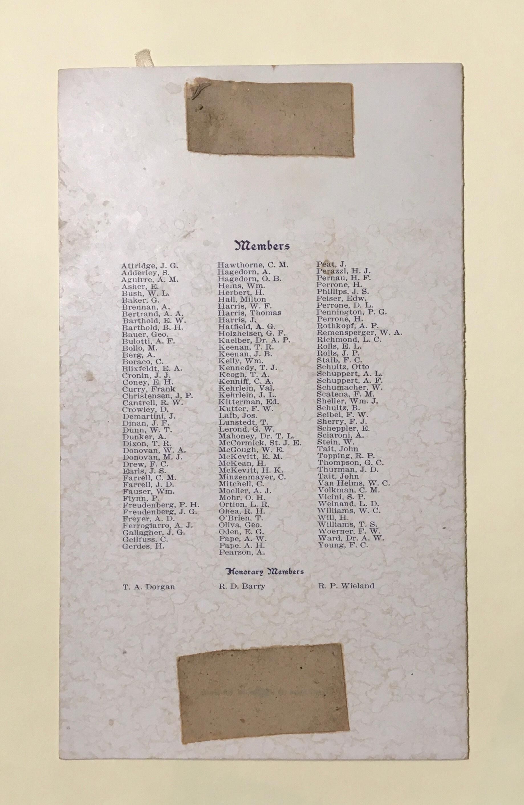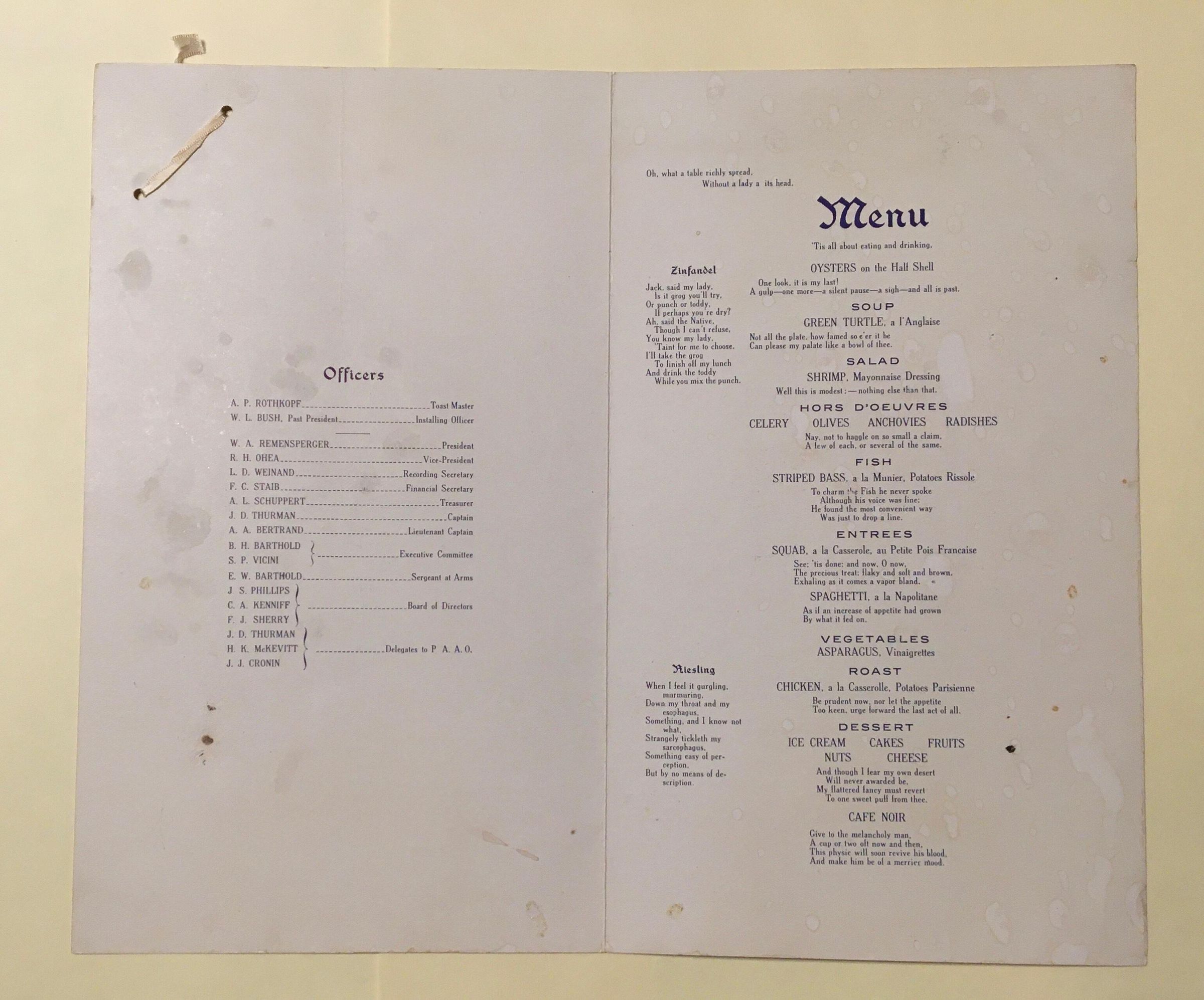 Inside is a list of officers and a detailed and elaborate menu; list of all members is on back.