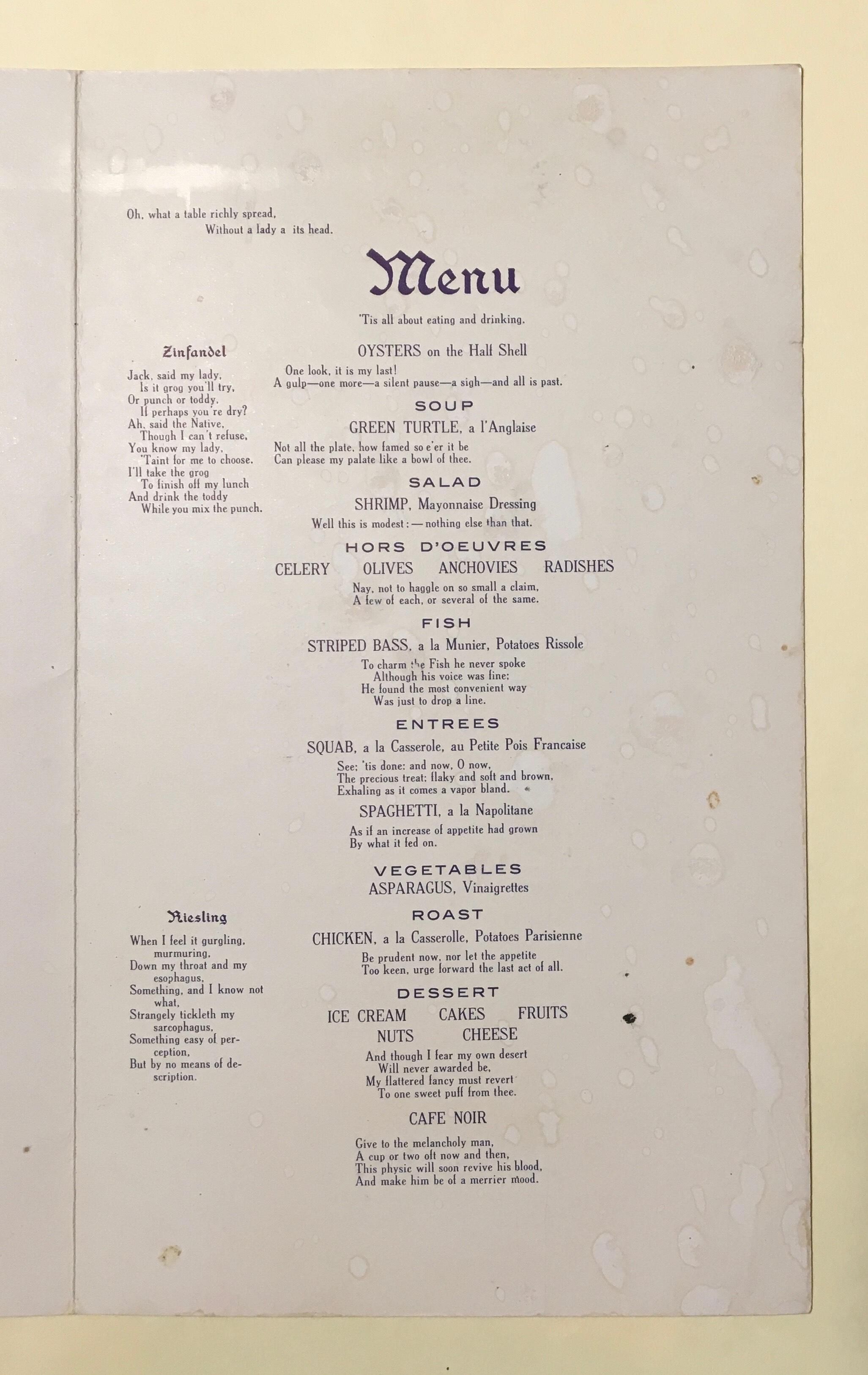 Menu includes comments/advice and poems on each item, including two wine poems, one Zinfandel and one Riesling.