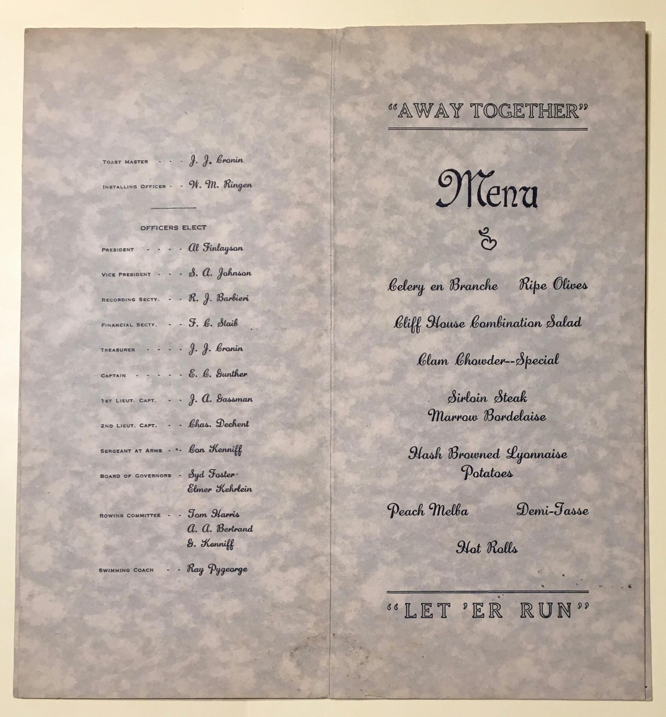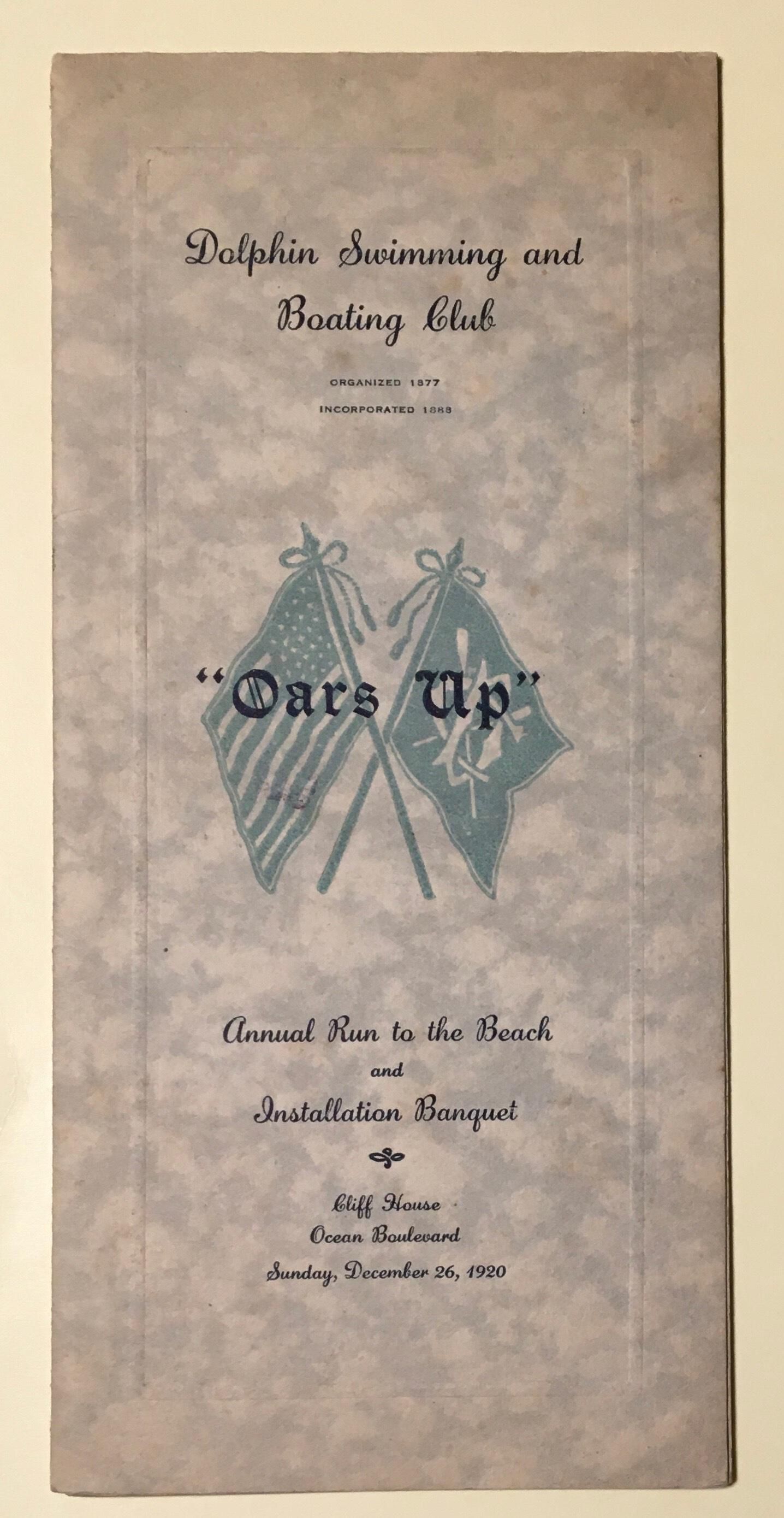 Program for Annual Run to Beach and Installation Banquet in December 26, 1920 at the Cliff House. Title of event "Oars Up" printed on top of light blue crossed flags US and Dolphin Club.