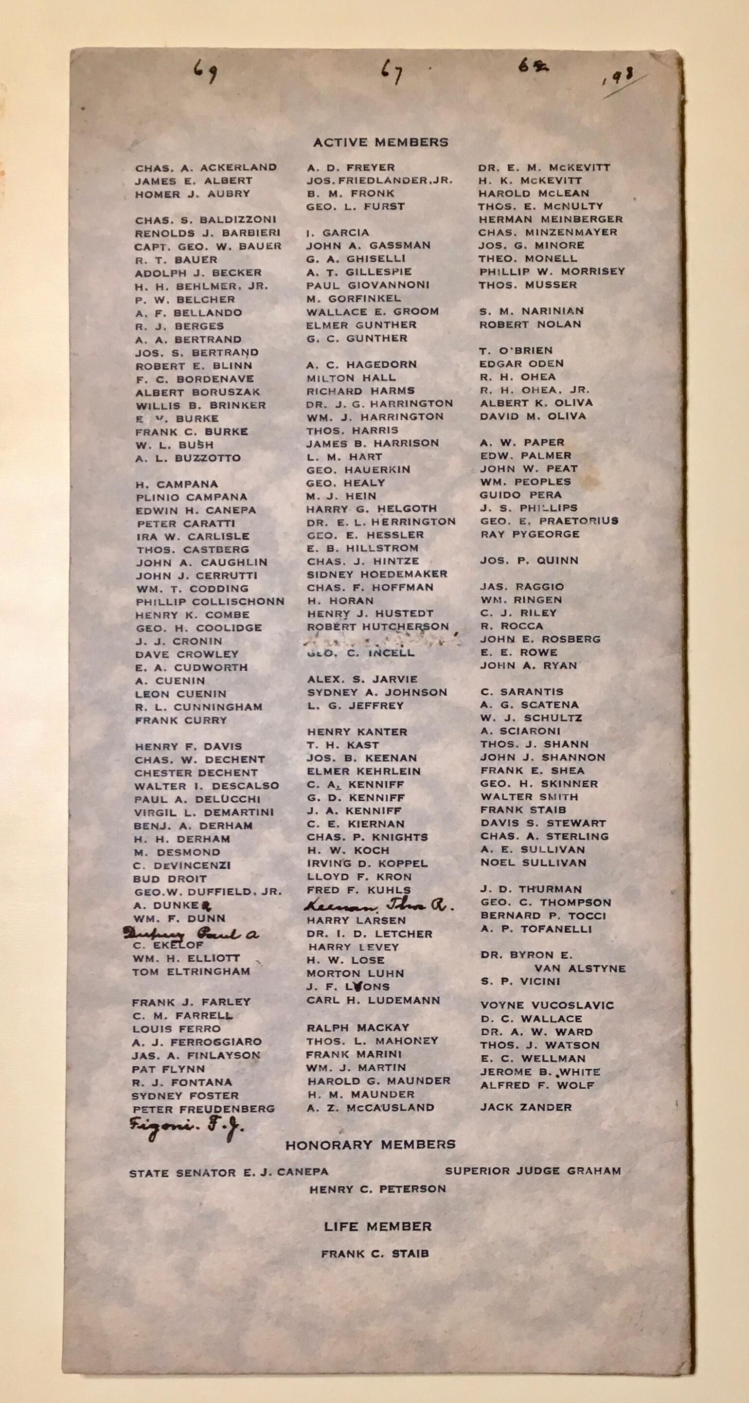 Also listed: 3 Honorary Members (politicians, judge), and 1 life member (Frank C. Staib).