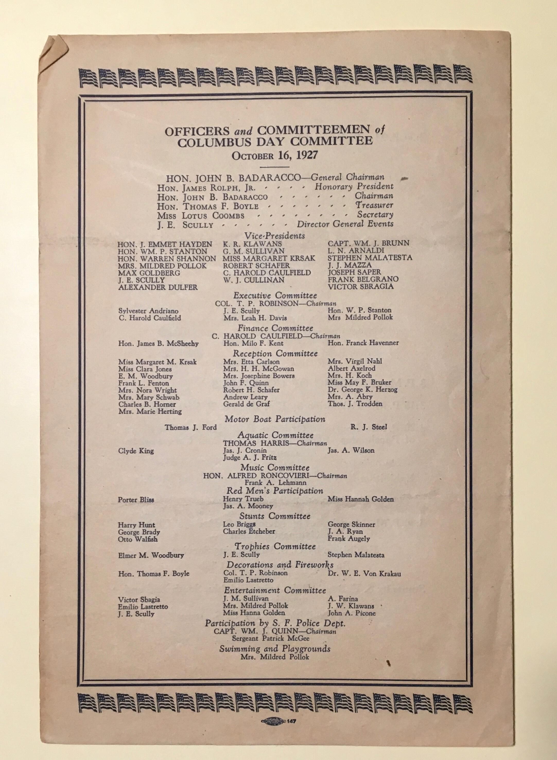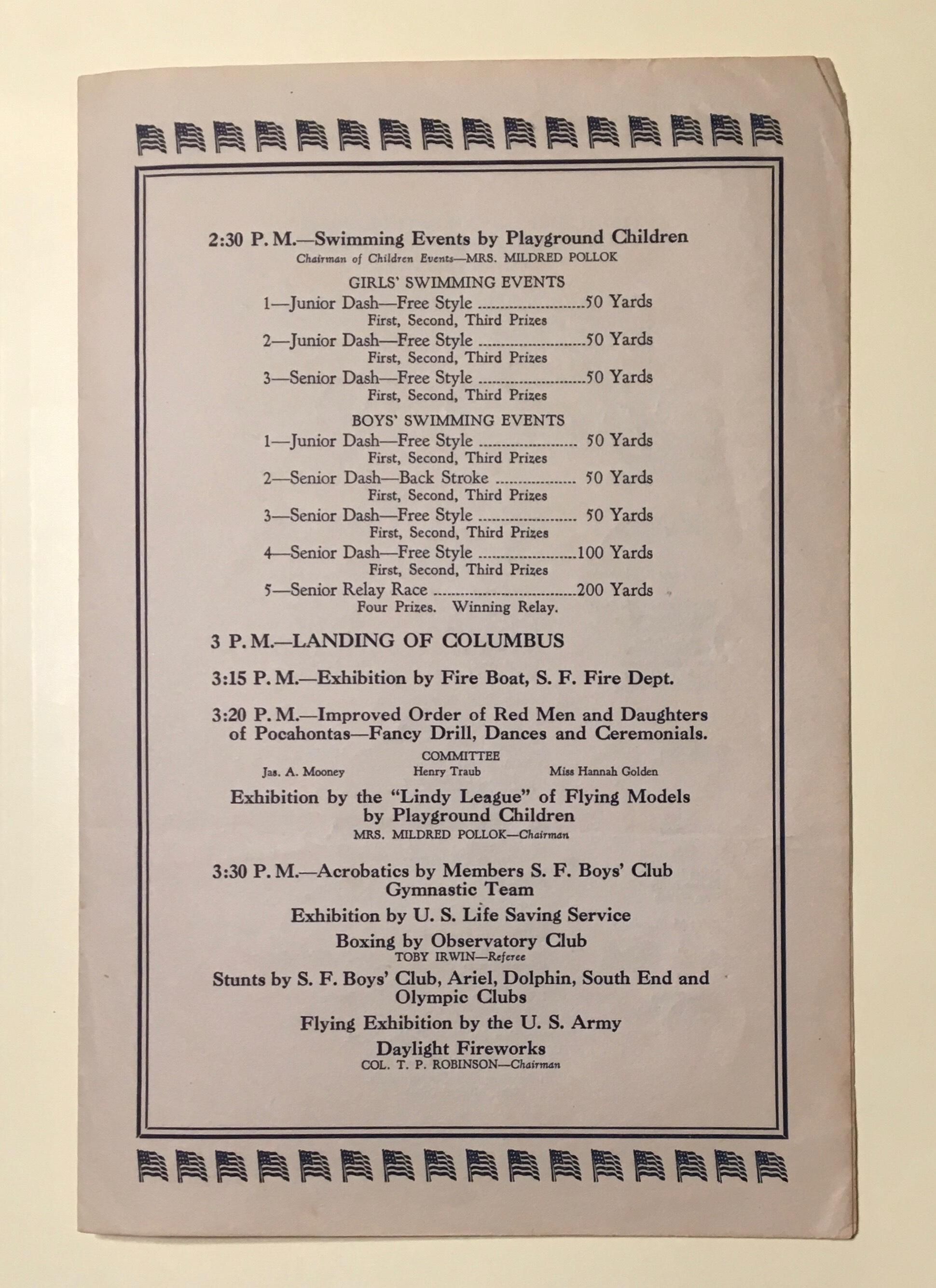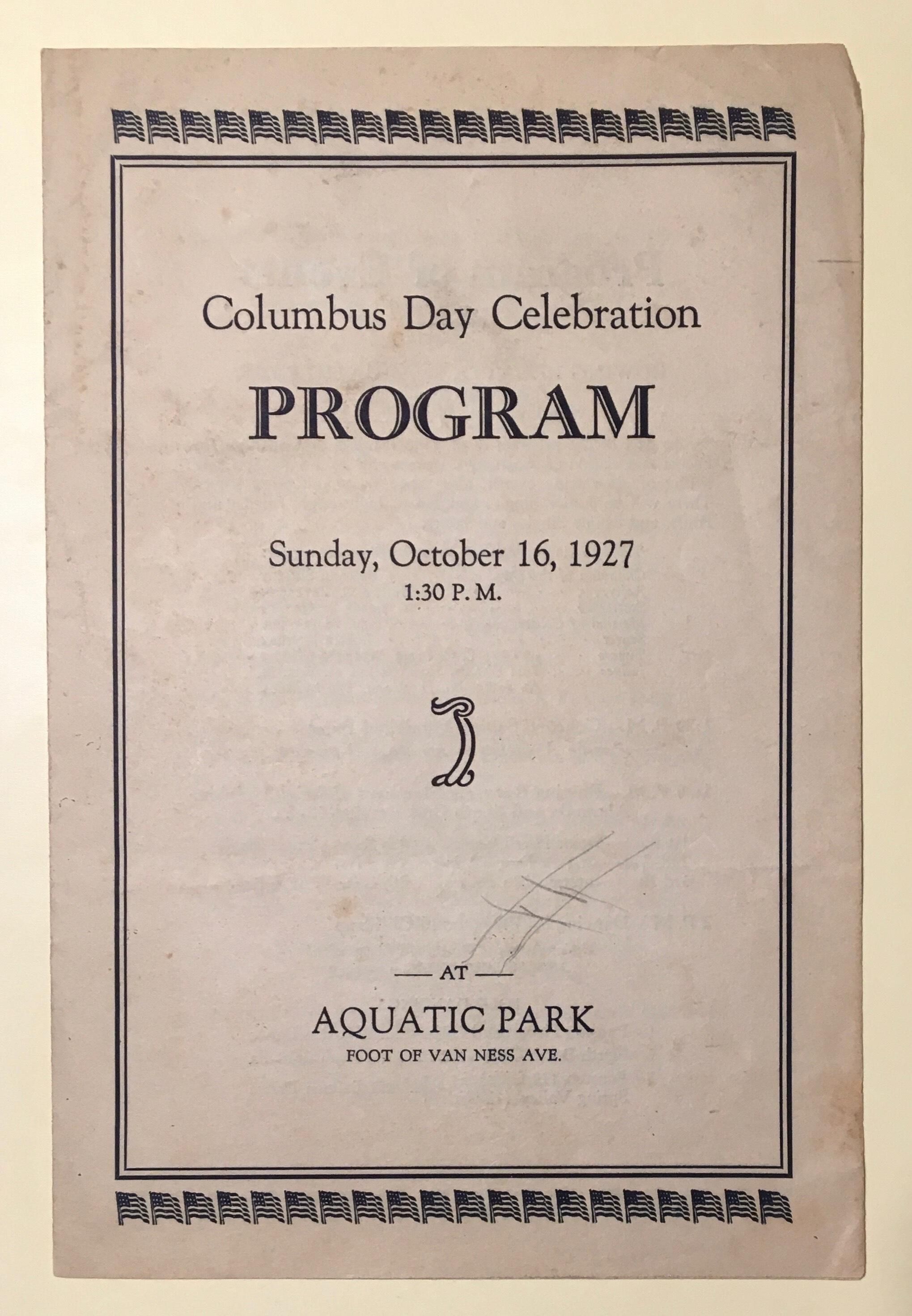 Program for Columbus Day events at Aquatic Park.
