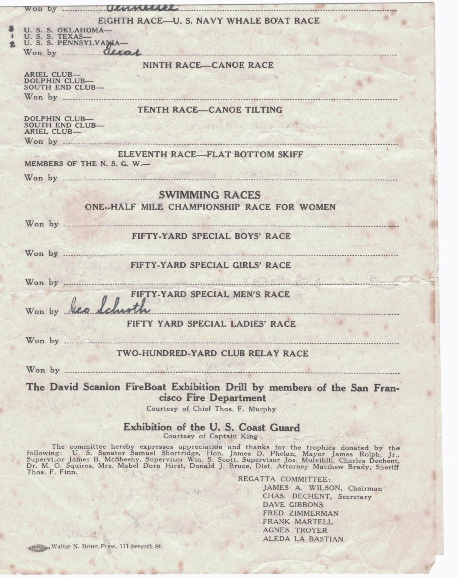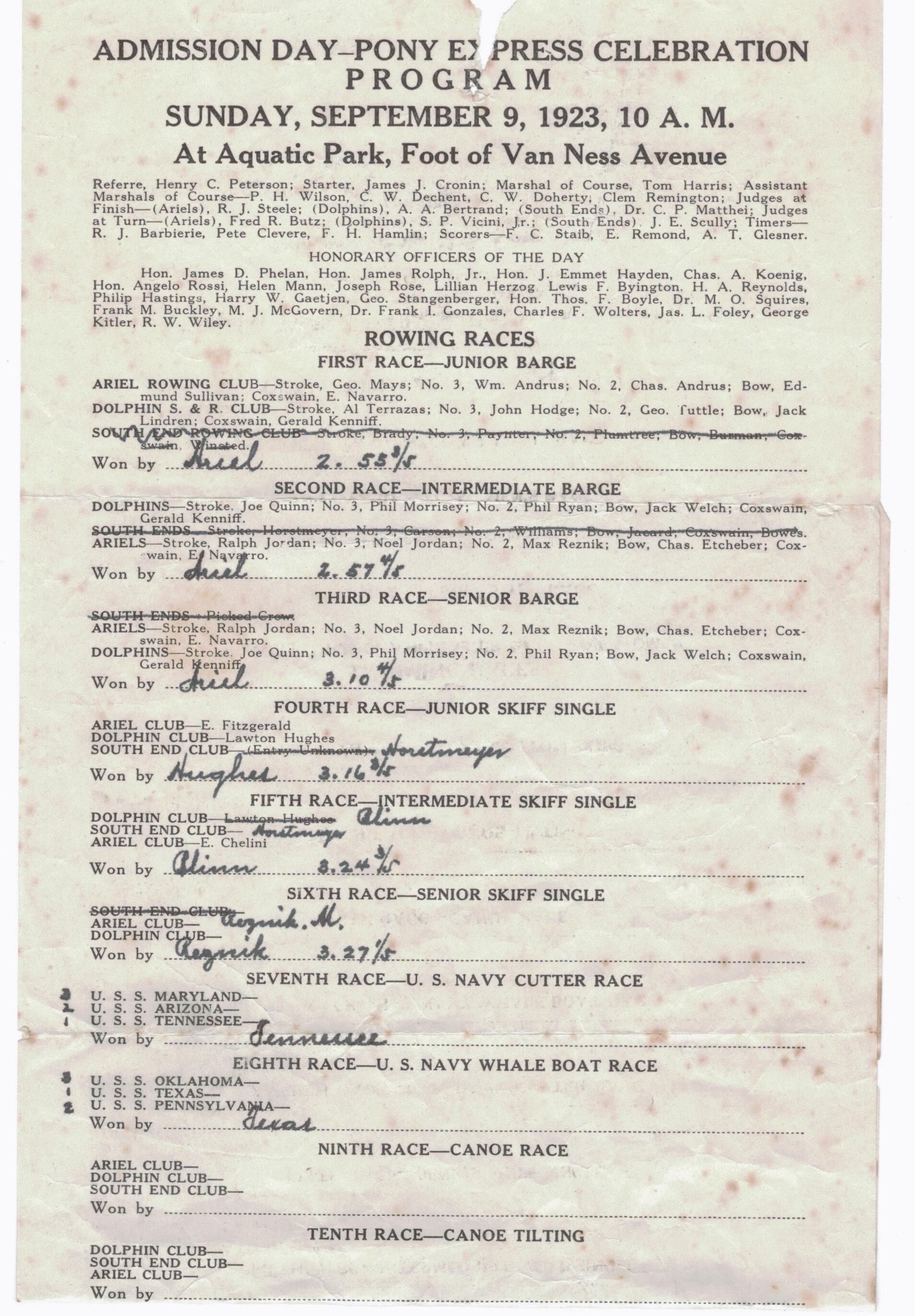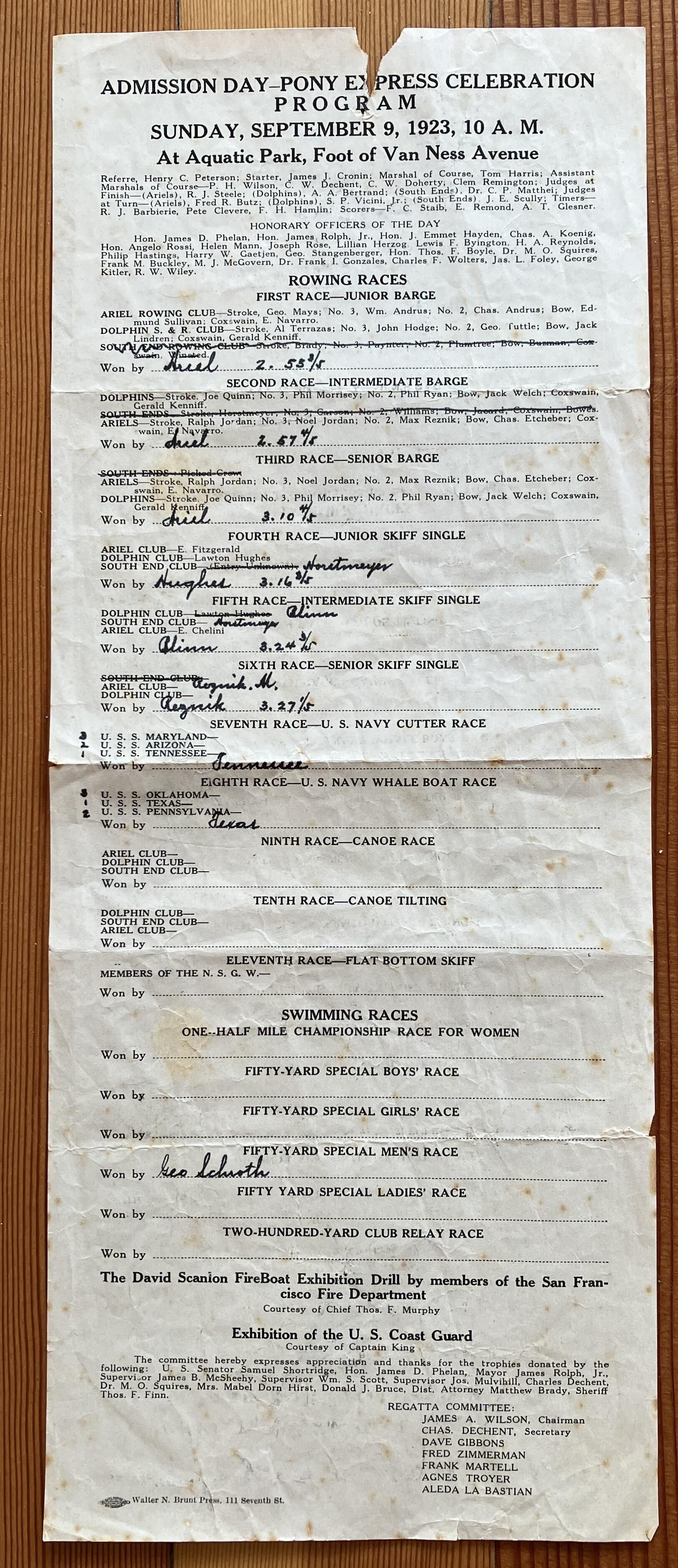 Program for rowing and swimming races held at Aquatic Park on Sunday September 9, 1923. Competitors included Dolphin Club, Ariel Club, and South End rowers in barges and single skiffs, and US Navy rowers on teams representing different ships competed in cutter and whale boat races.