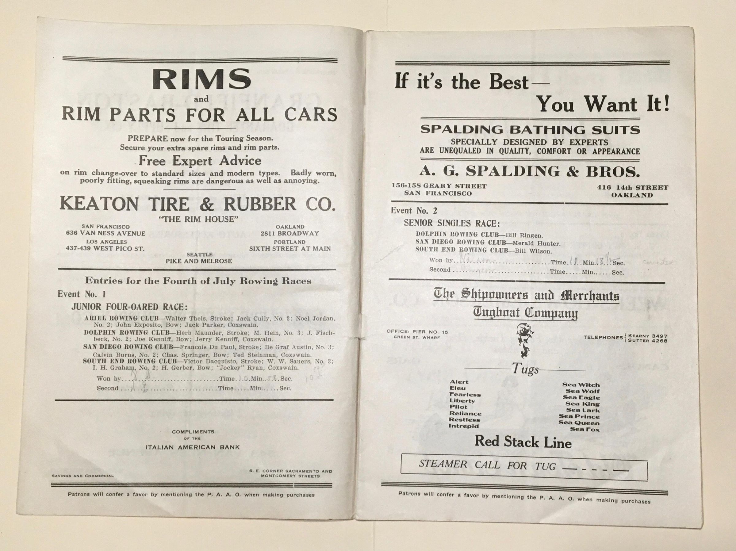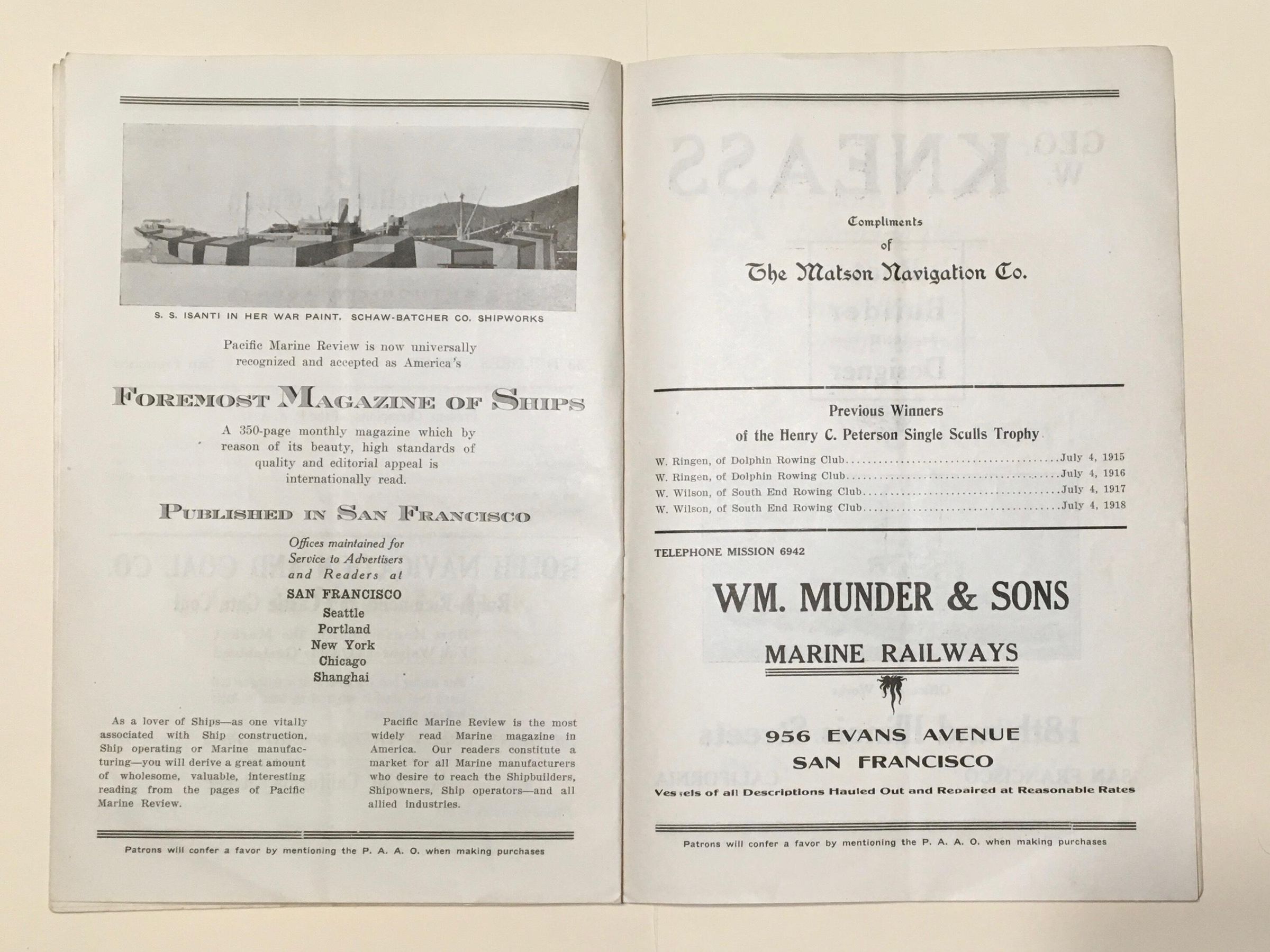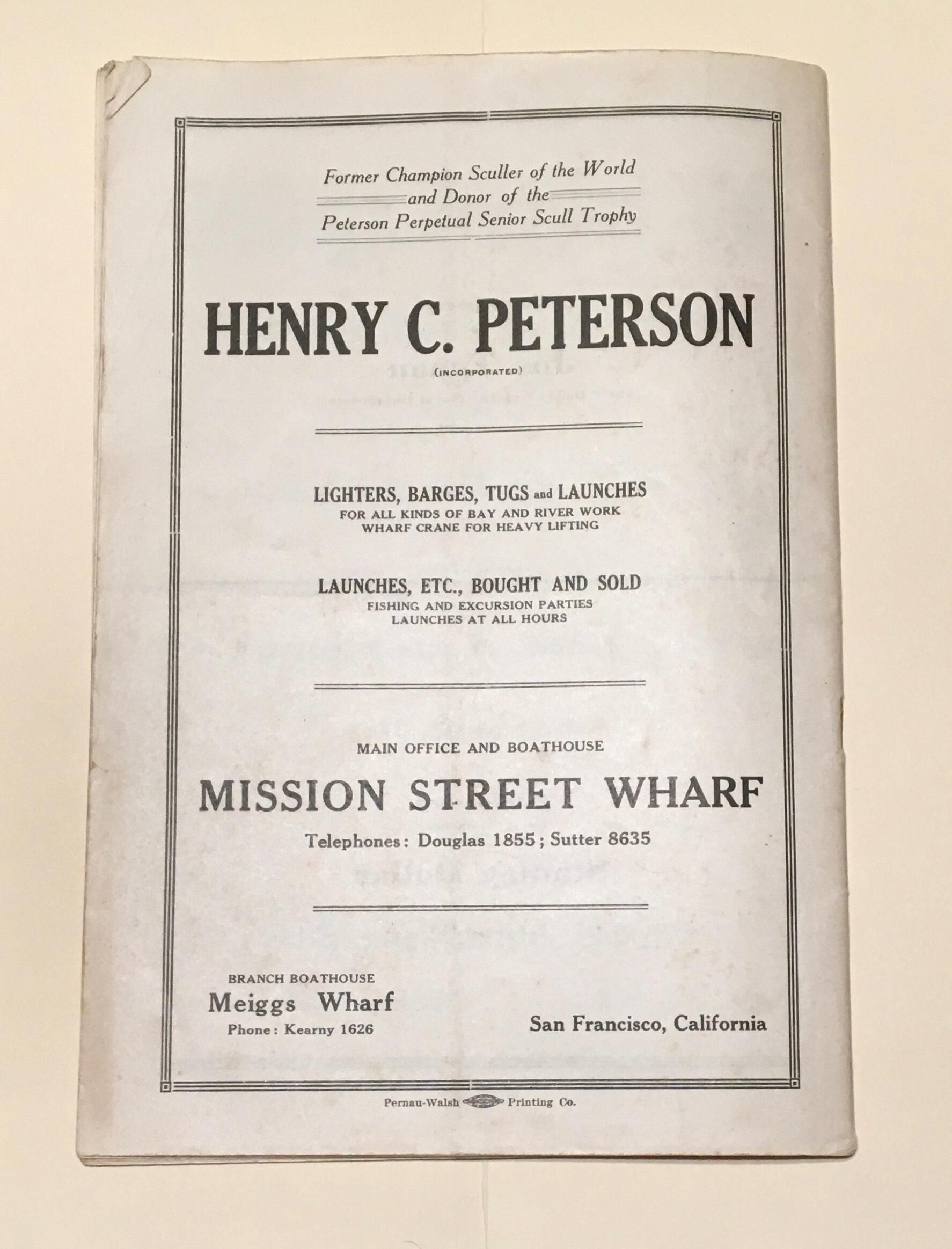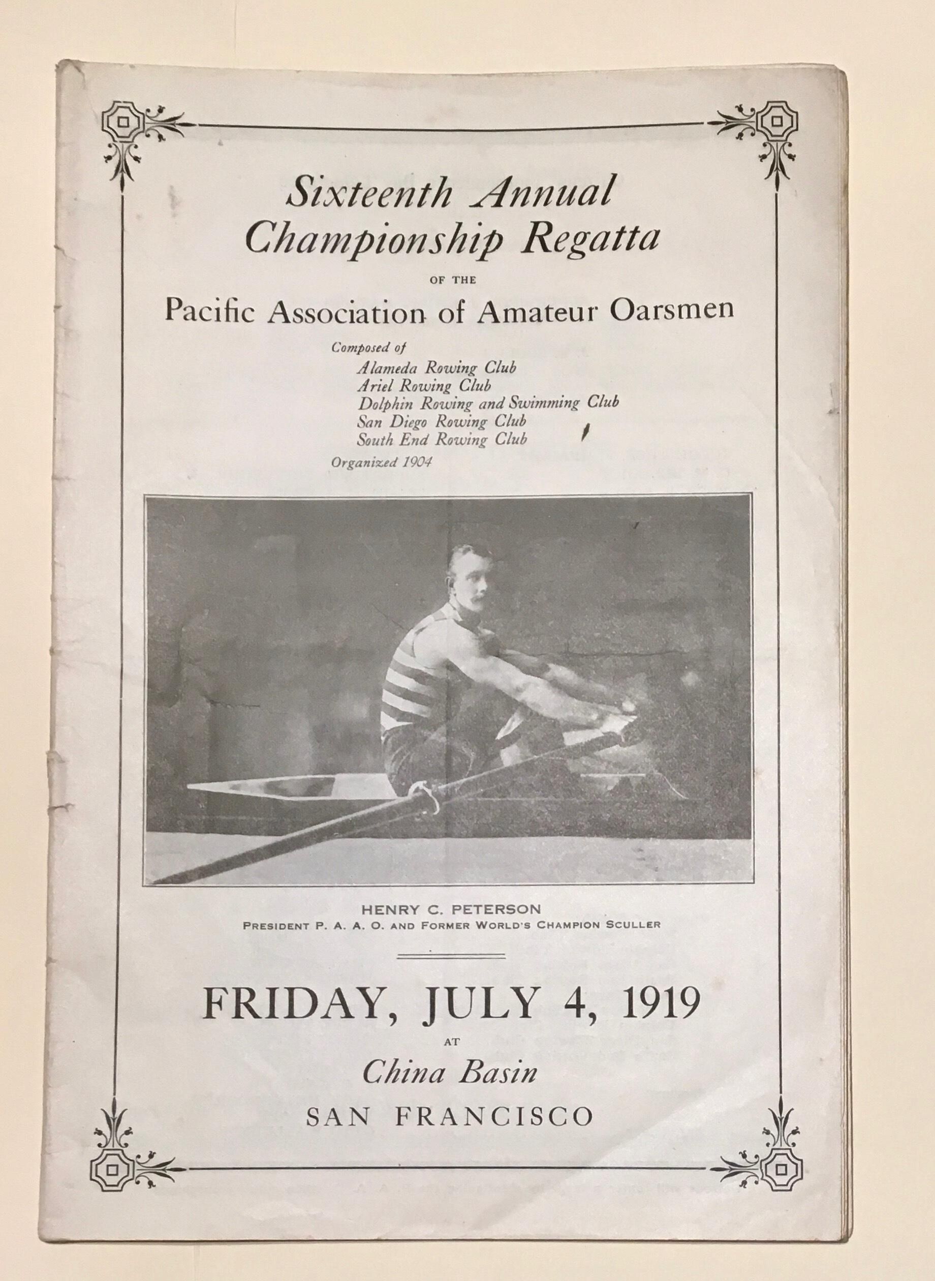 Program for PAAO 16th Annual Championship Regatta, July 4, 1919, at China Basin, San Francisco. 28 pages plus front cover and back cover, 2 staples for binding. Photo of Henry Peterson on front cover.