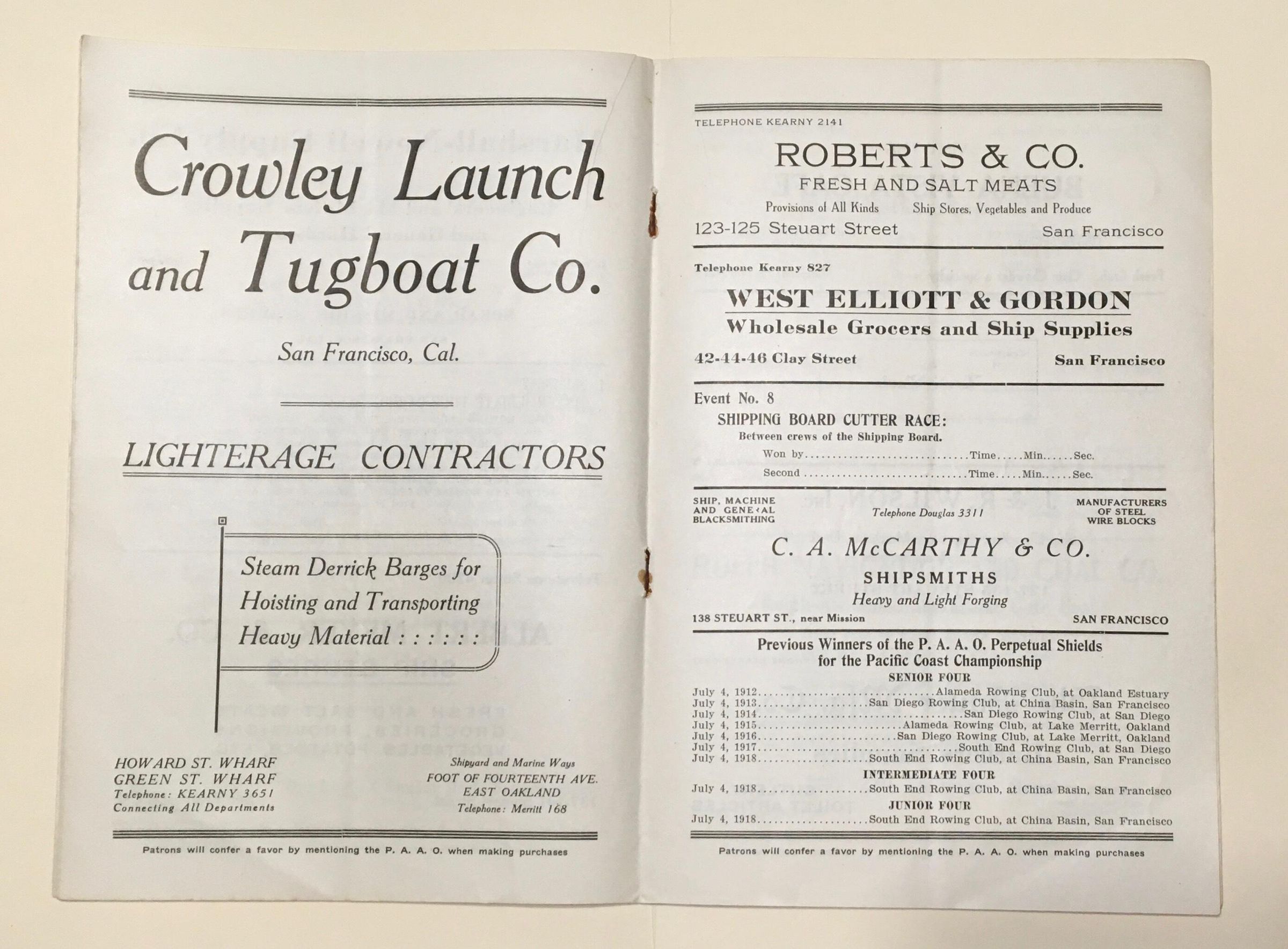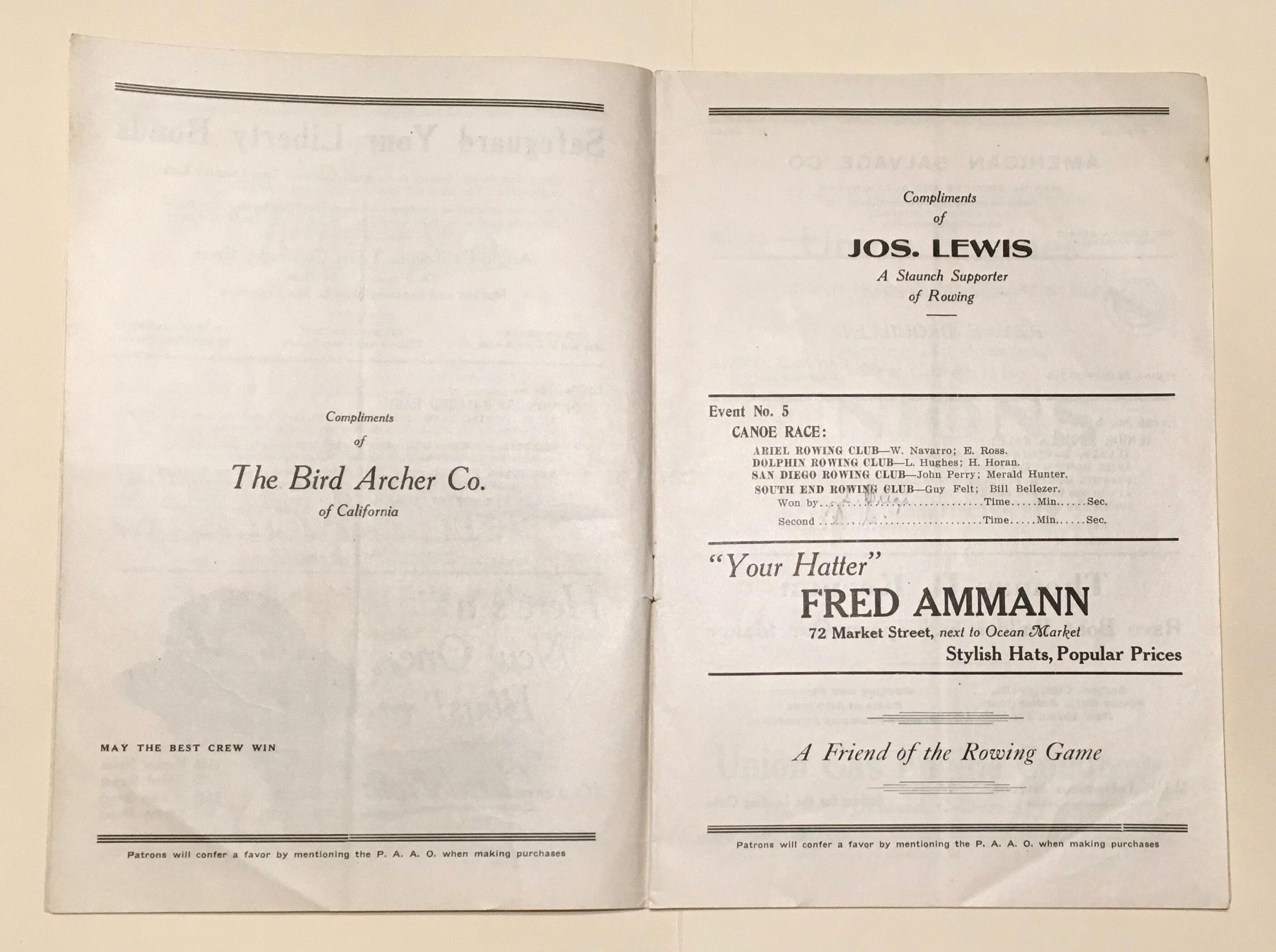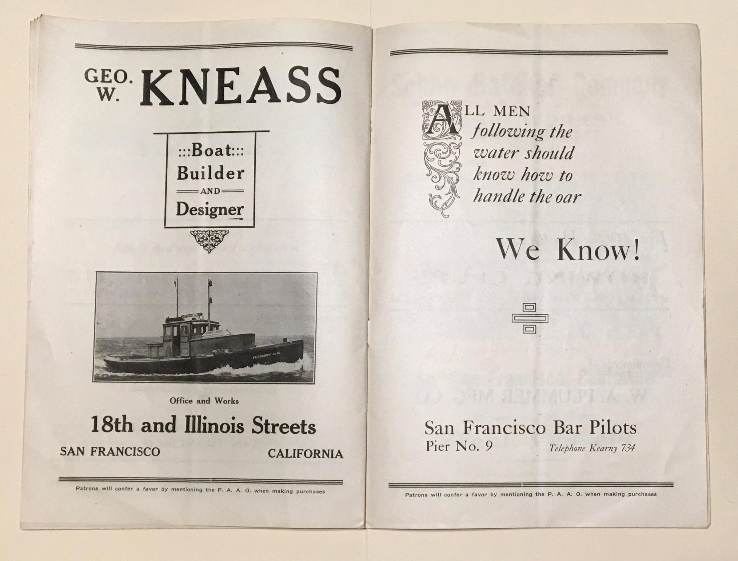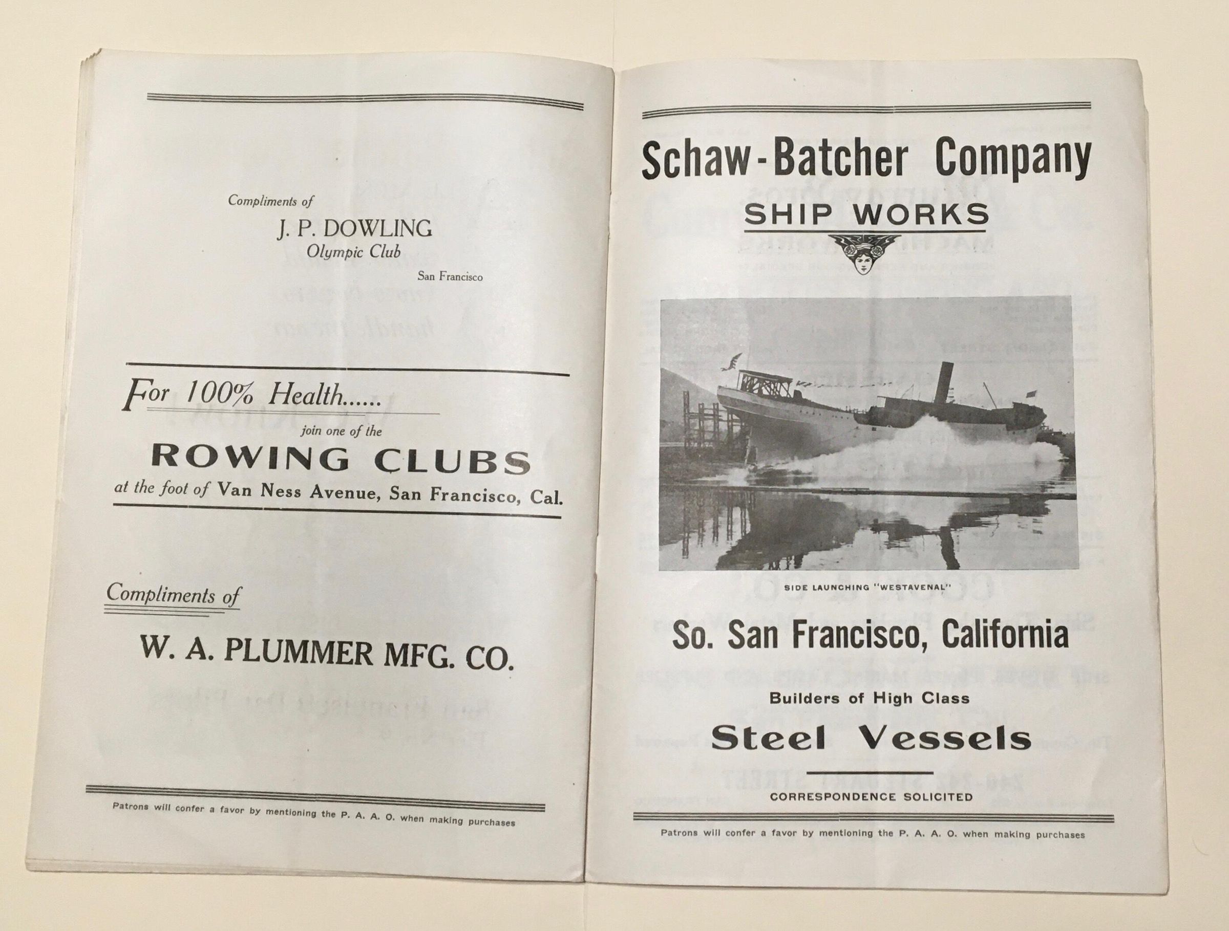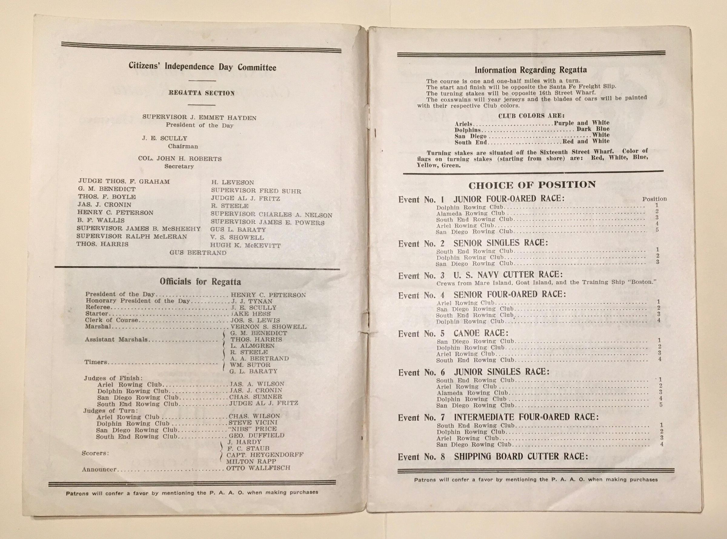 Program for PAAO 16th Annual Championship Regatta, July 4, 1919, at China Basin, San Francisco. 28 pages plus front cover and back cover, 2 staples for binding. Photo of Henry Peterson on front cover.