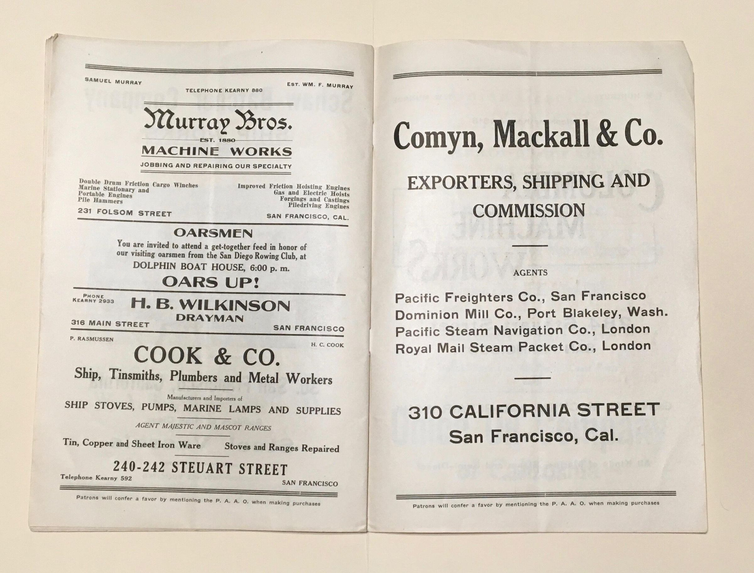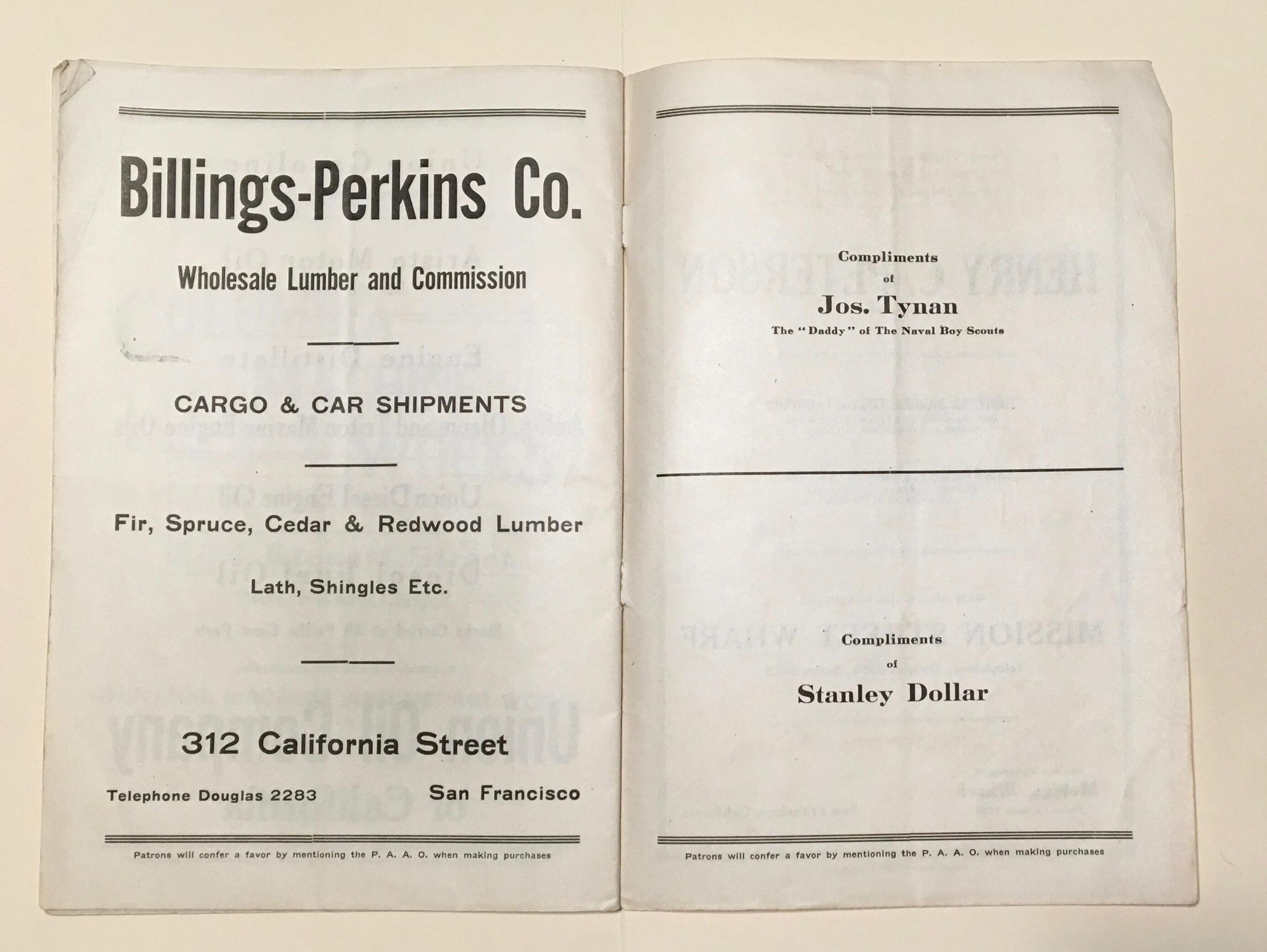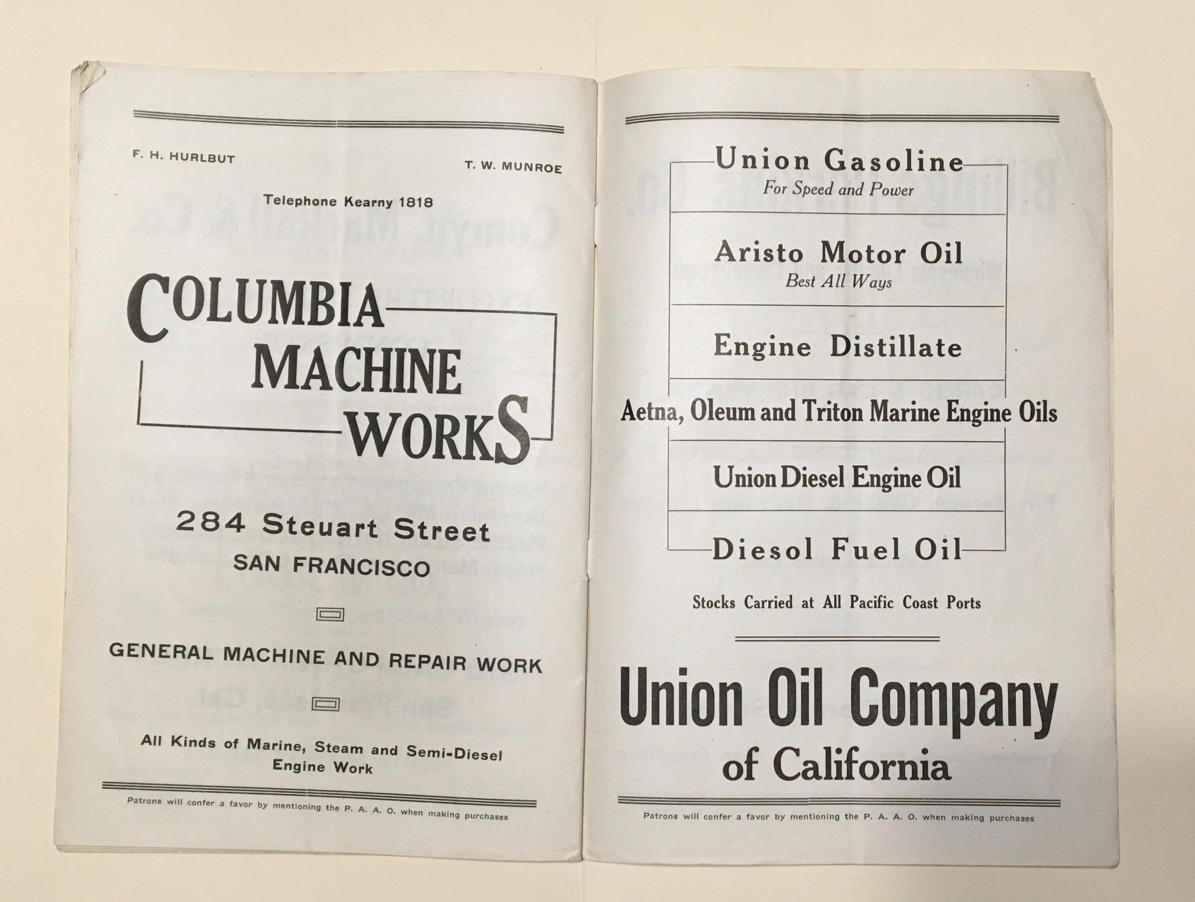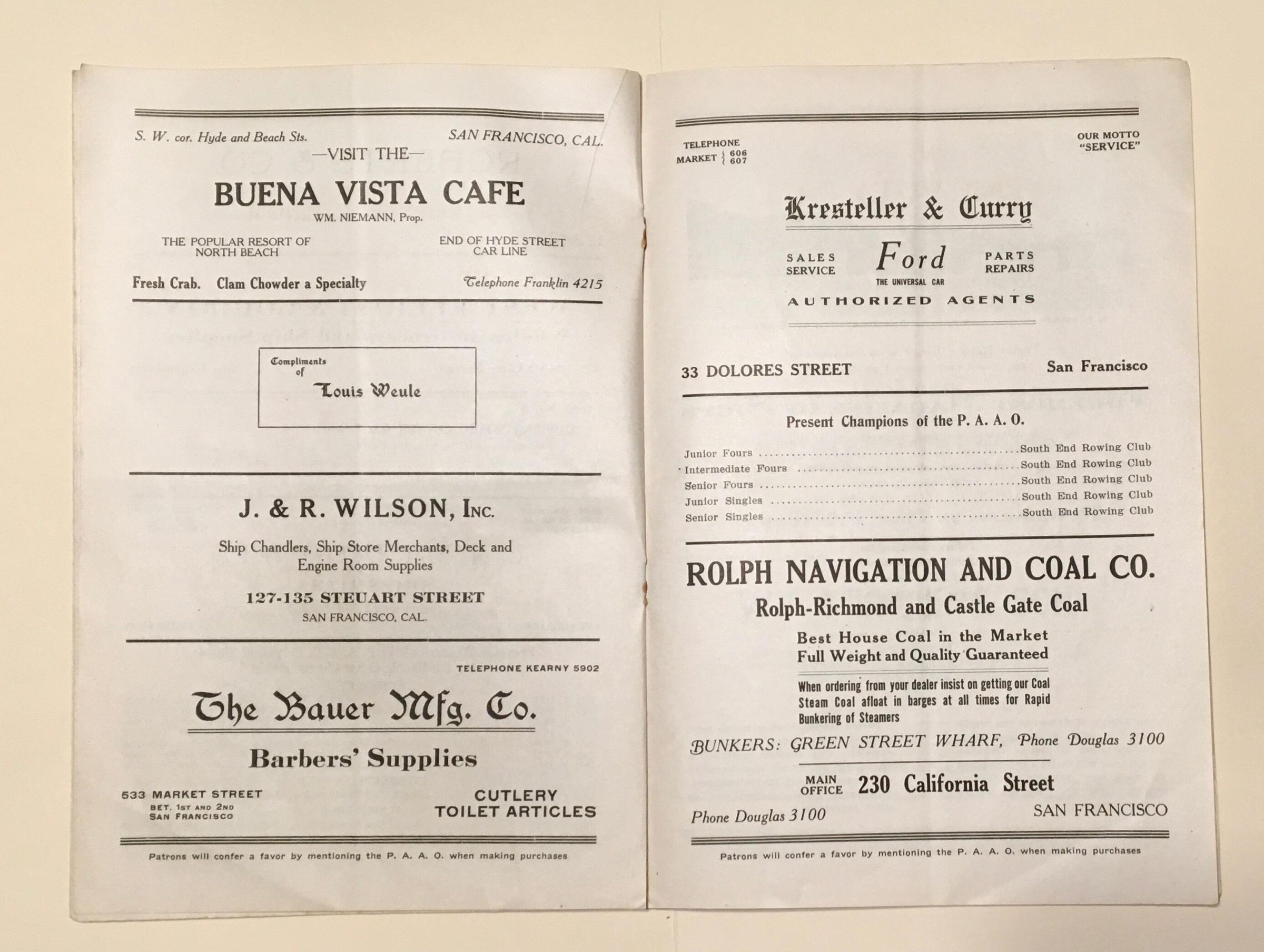 Program for PAAO 16th Annual Championship Regatta, July 4, 1919, at China Basin, San Francisco. 28 pages plus front cover and back cover, 2 staples for binding. Photo of Henry Peterson on front cover.