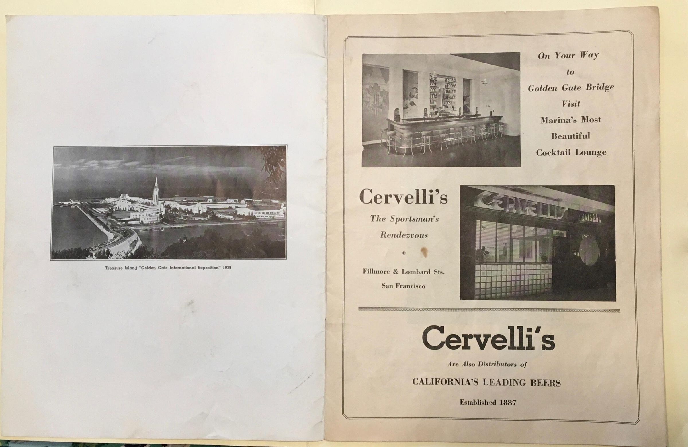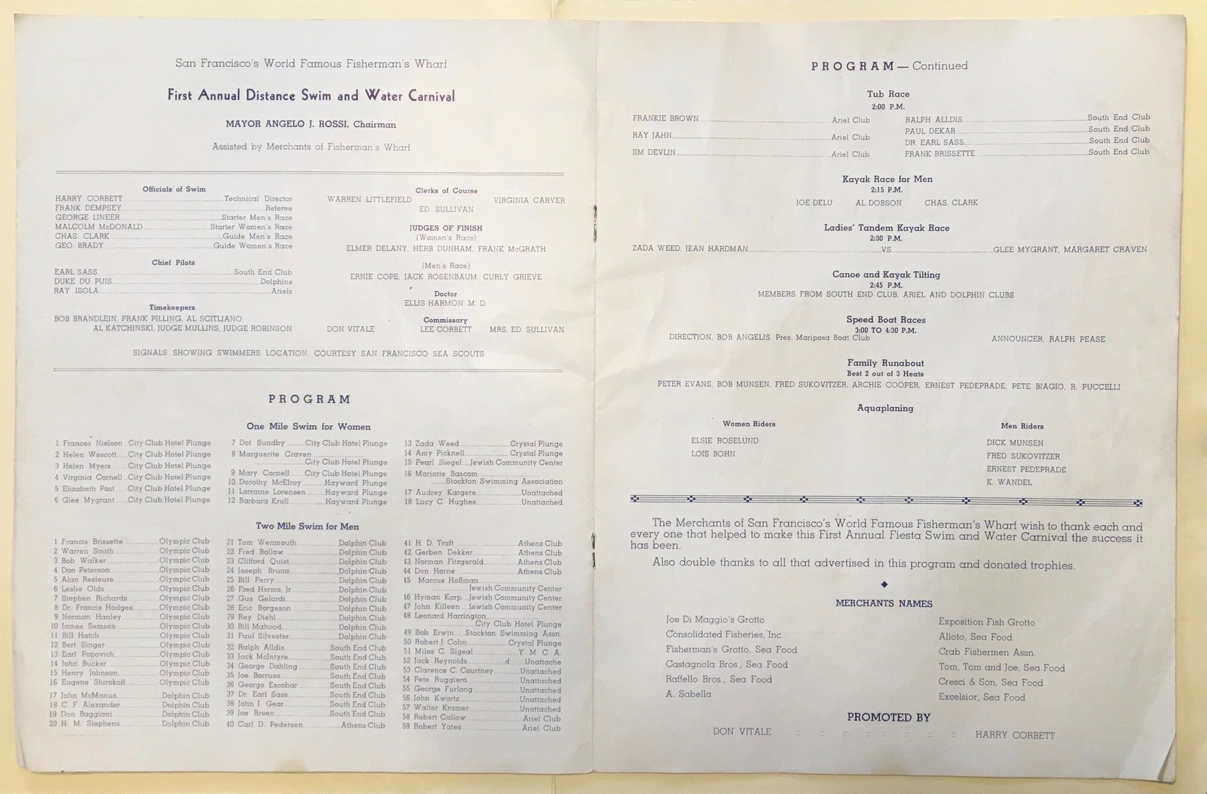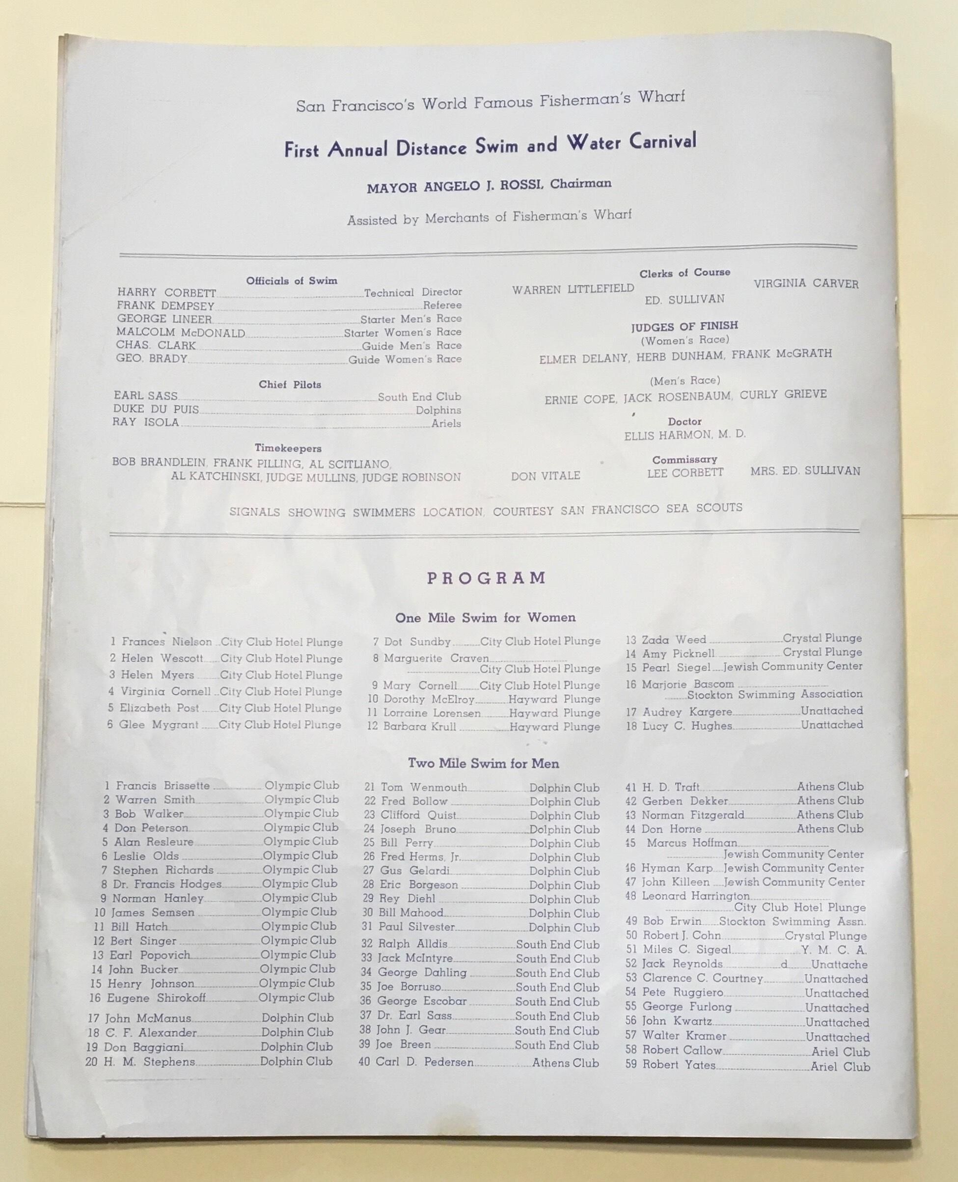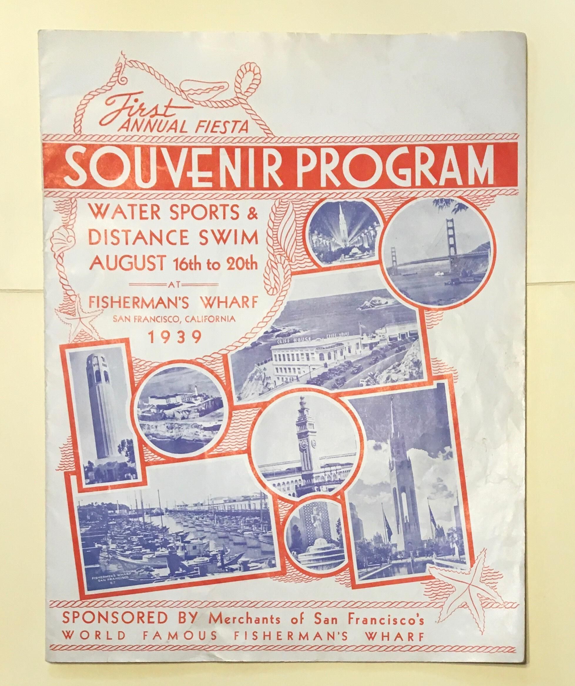 Souvenir program for "First Annual Fiesta - Water Sports & Distance Swim" to take place at Fisherman's Wharf, August 16-20, 1939. Sponsored by "Merchants of San Francisco's World Famous Fisherman's Wharf."