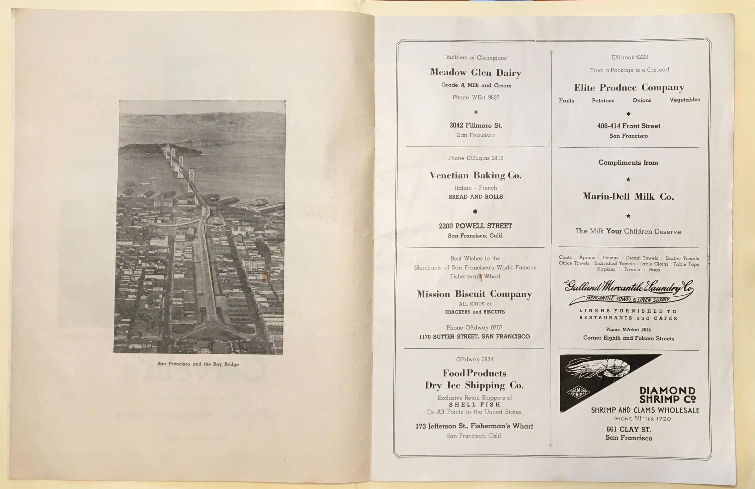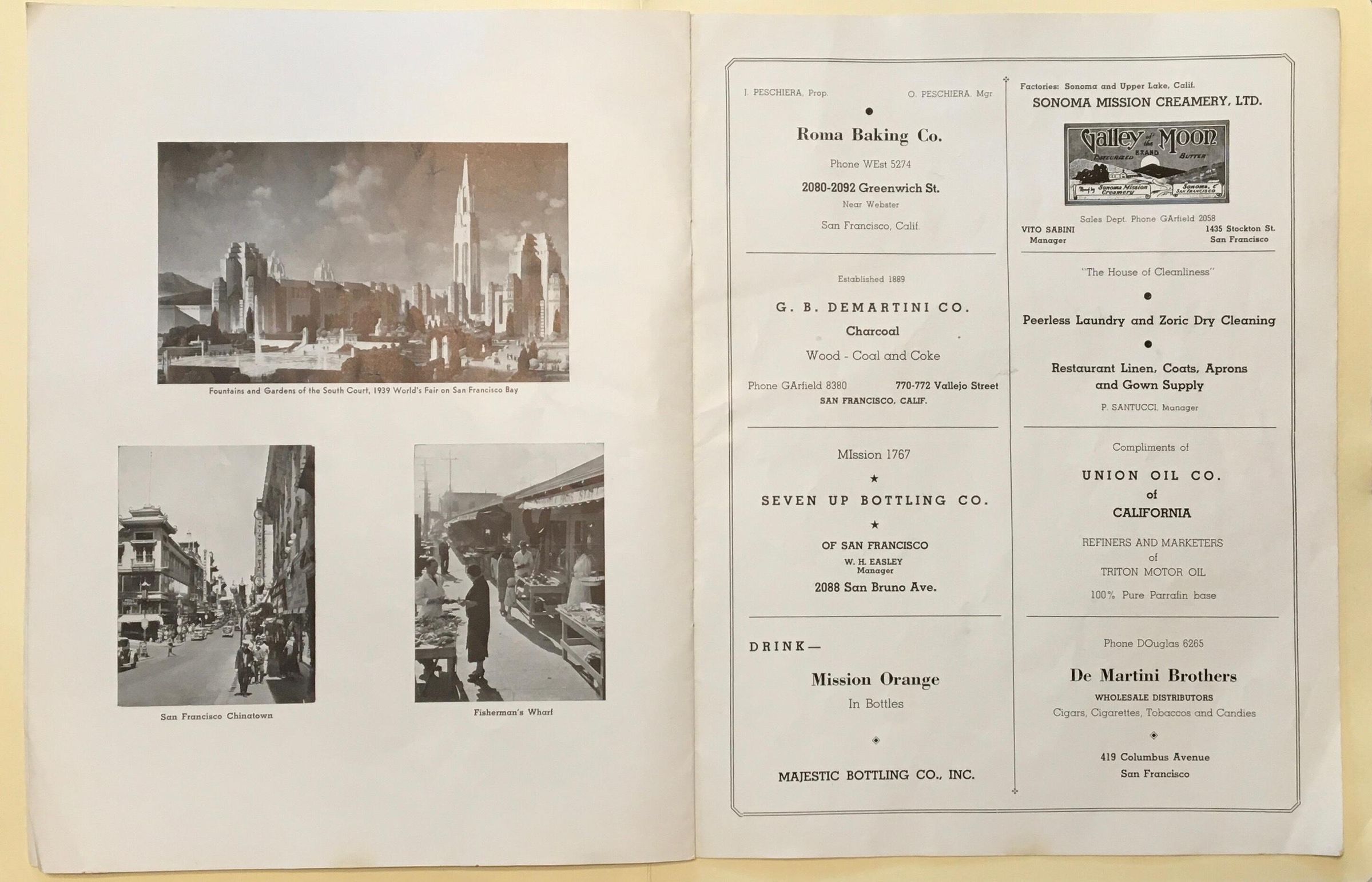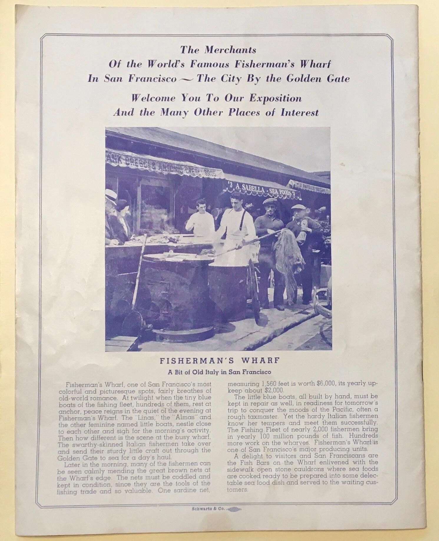 Most pages consist of paid ads from merchants, 5 pages show photos of Francisco, back page gives history of the area with a photo of crab boilers at Cresci Bros and A. Sabella.Archive Details