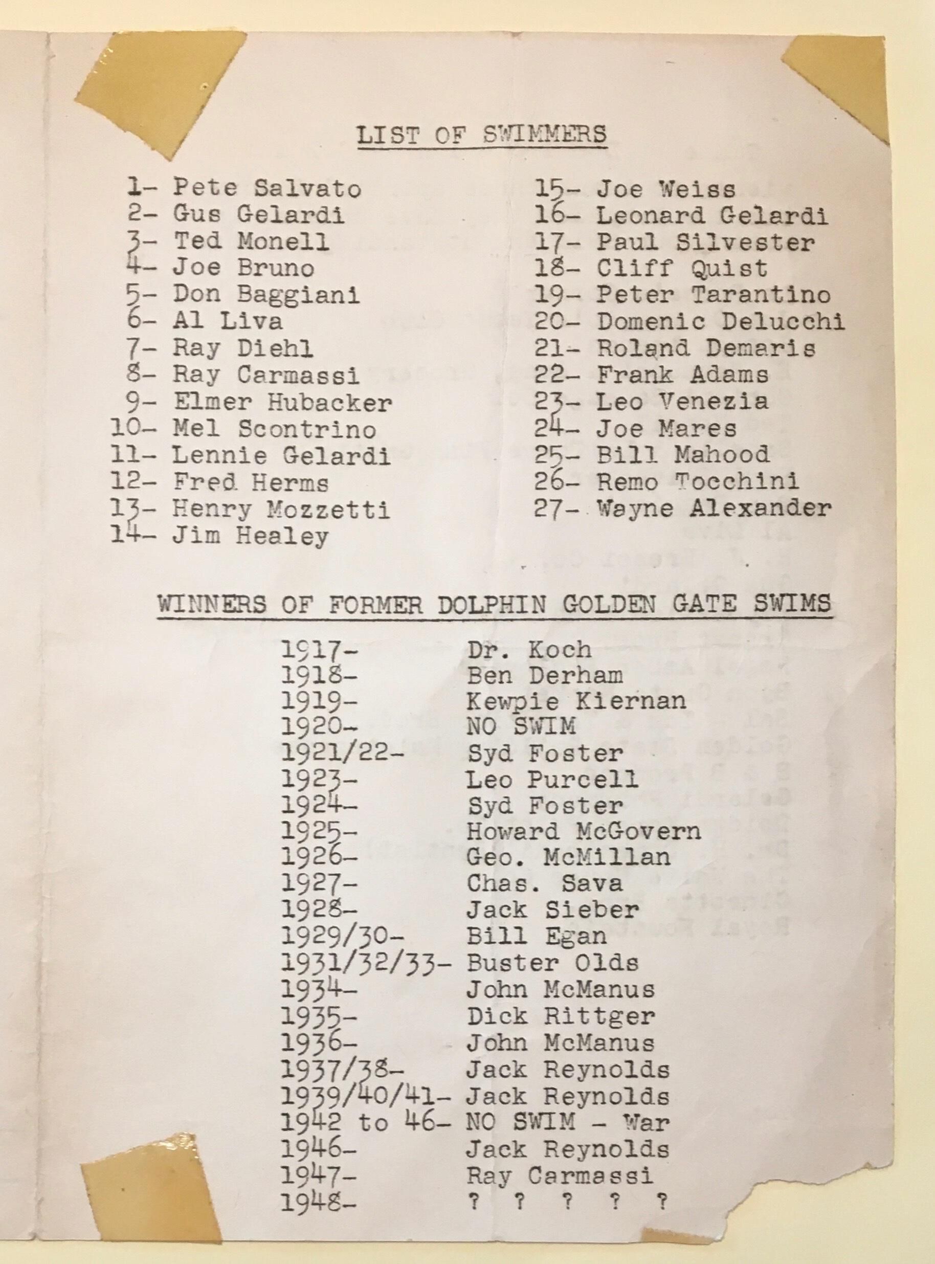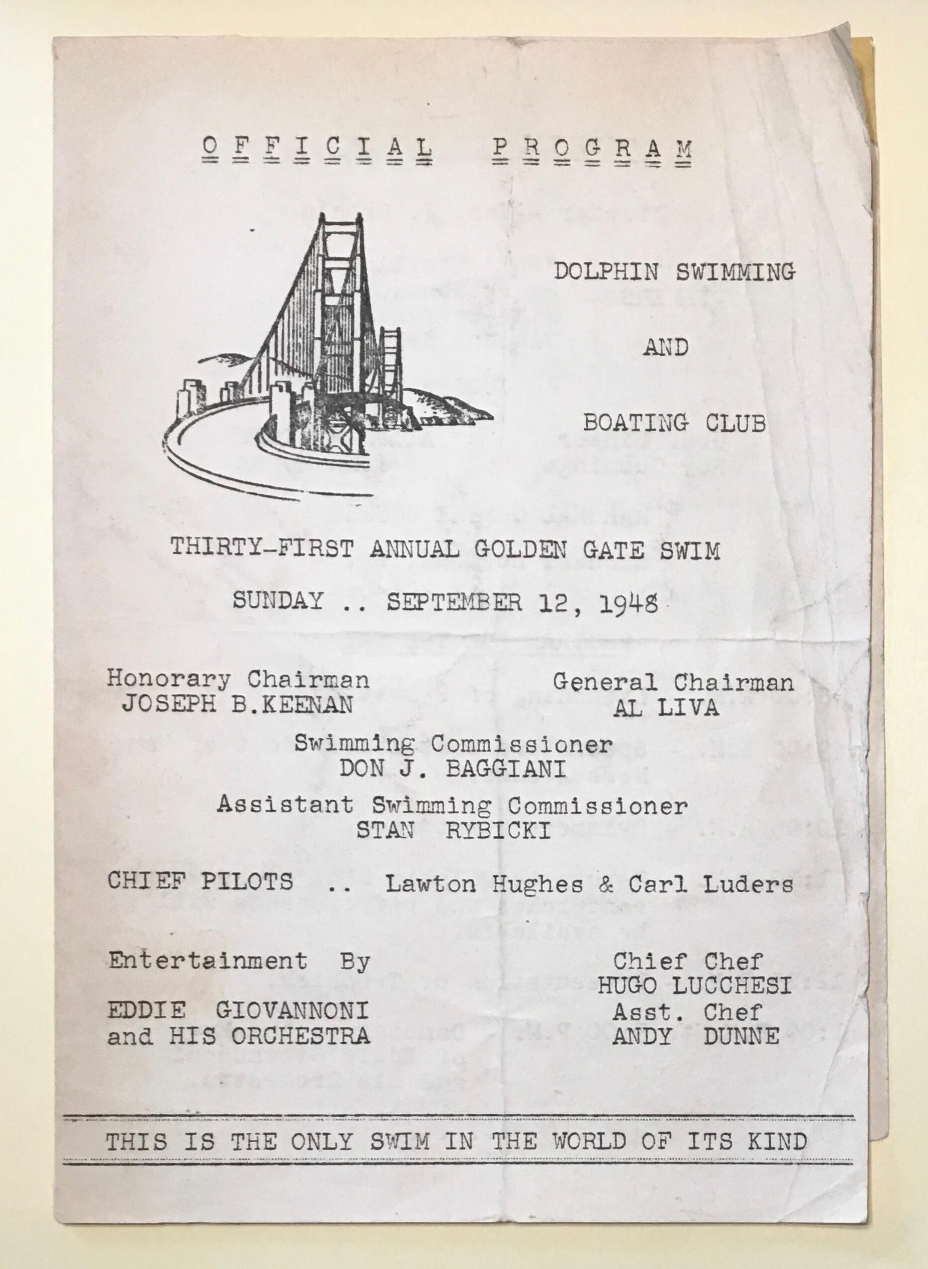 Program for Golden Gate Swim Sept 12, 1948. Program lists officials, pilots, swim commissioner, and all 27 swimmers. And past winners back to 1917.