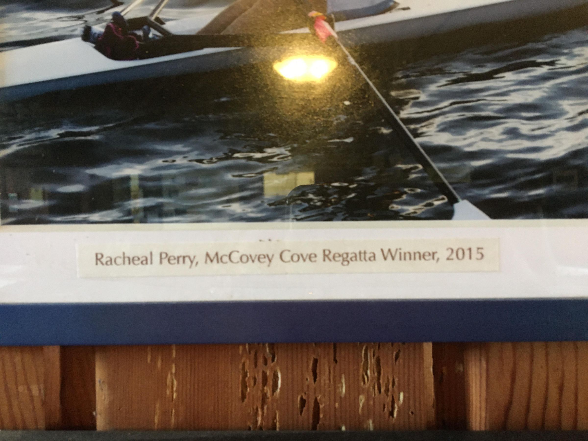 July 2020 was on west wall of main boathouse north of door to entry hall "Racheal Perry, McCovey Cove Regatta Winner, 2015"