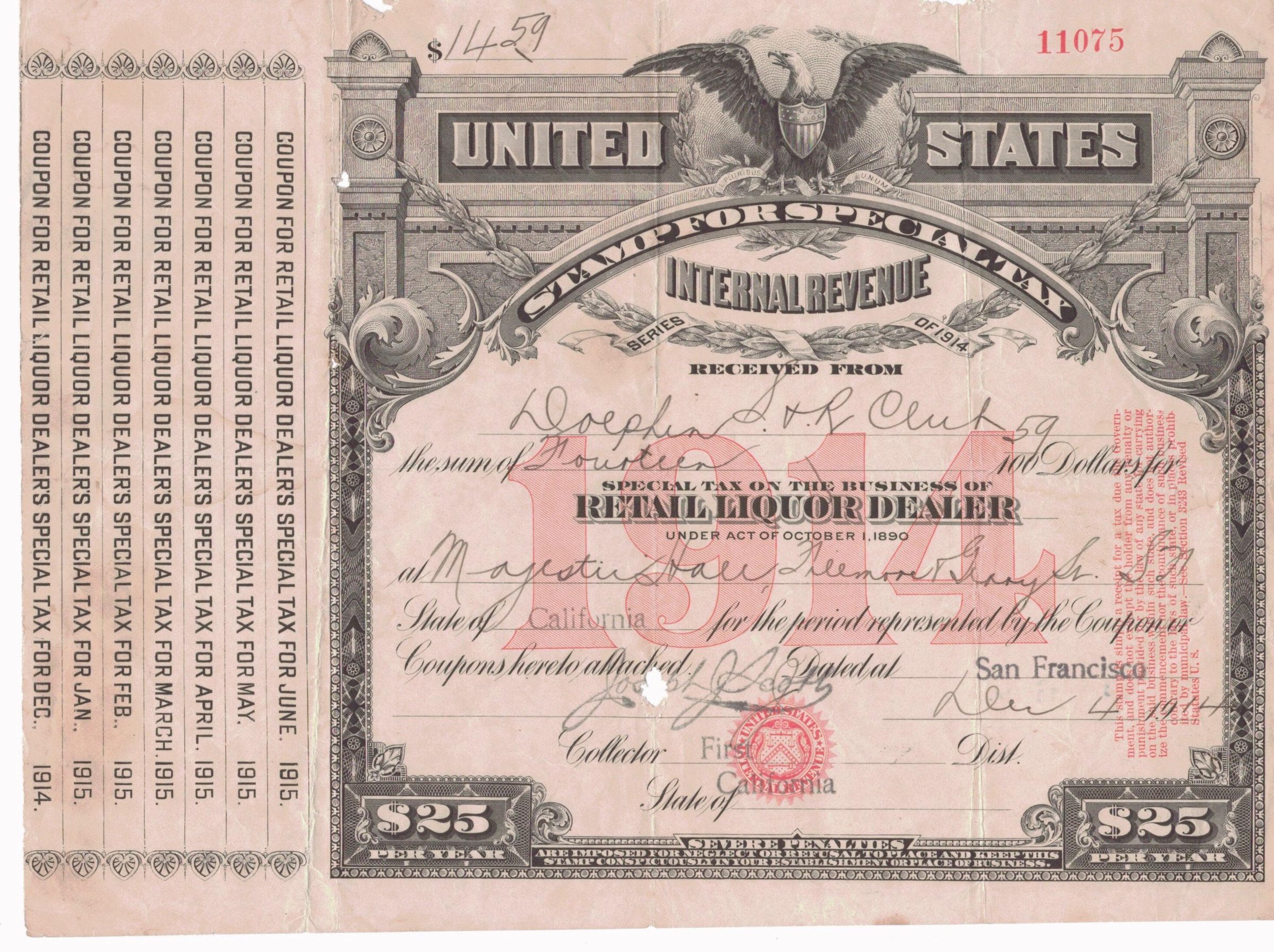IRS receipt for DC for payment of tax for retail liquor sale at club event at Majestic Hall.