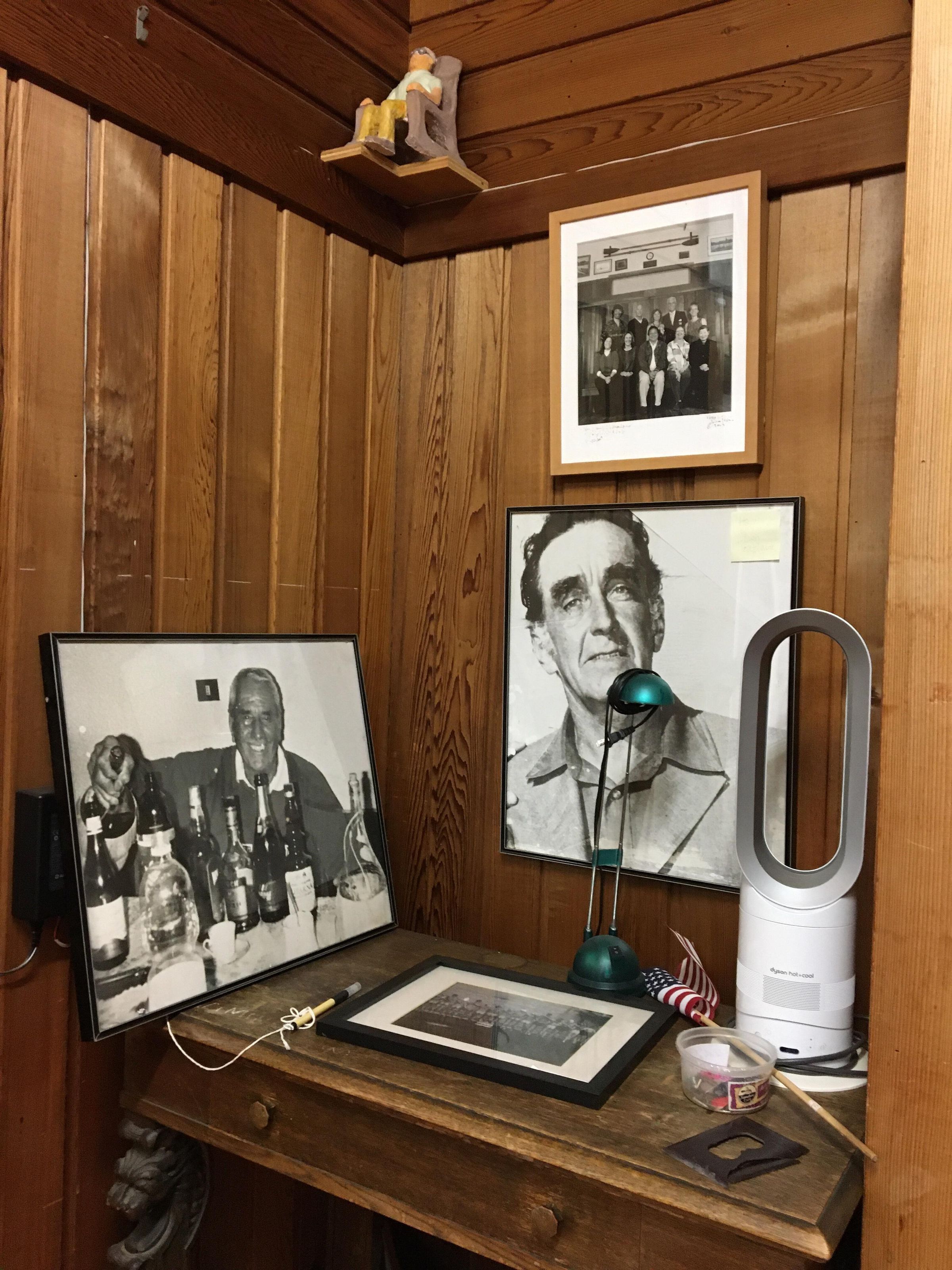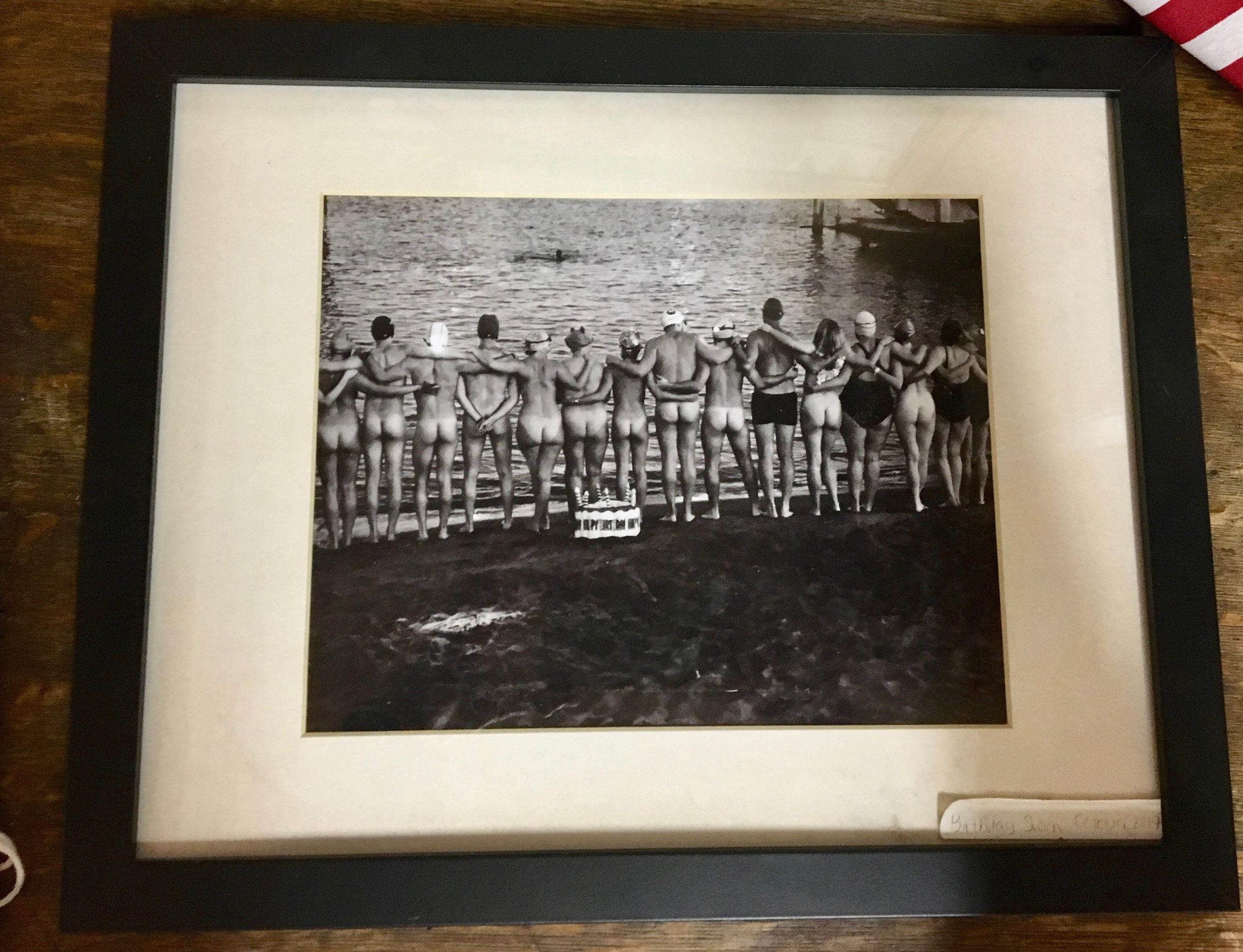 Black and white photo of row of swimmers standing at water edge, arms around each other, from back view. Large birthday cake center foreground. Most swimmers are in birthday suits.