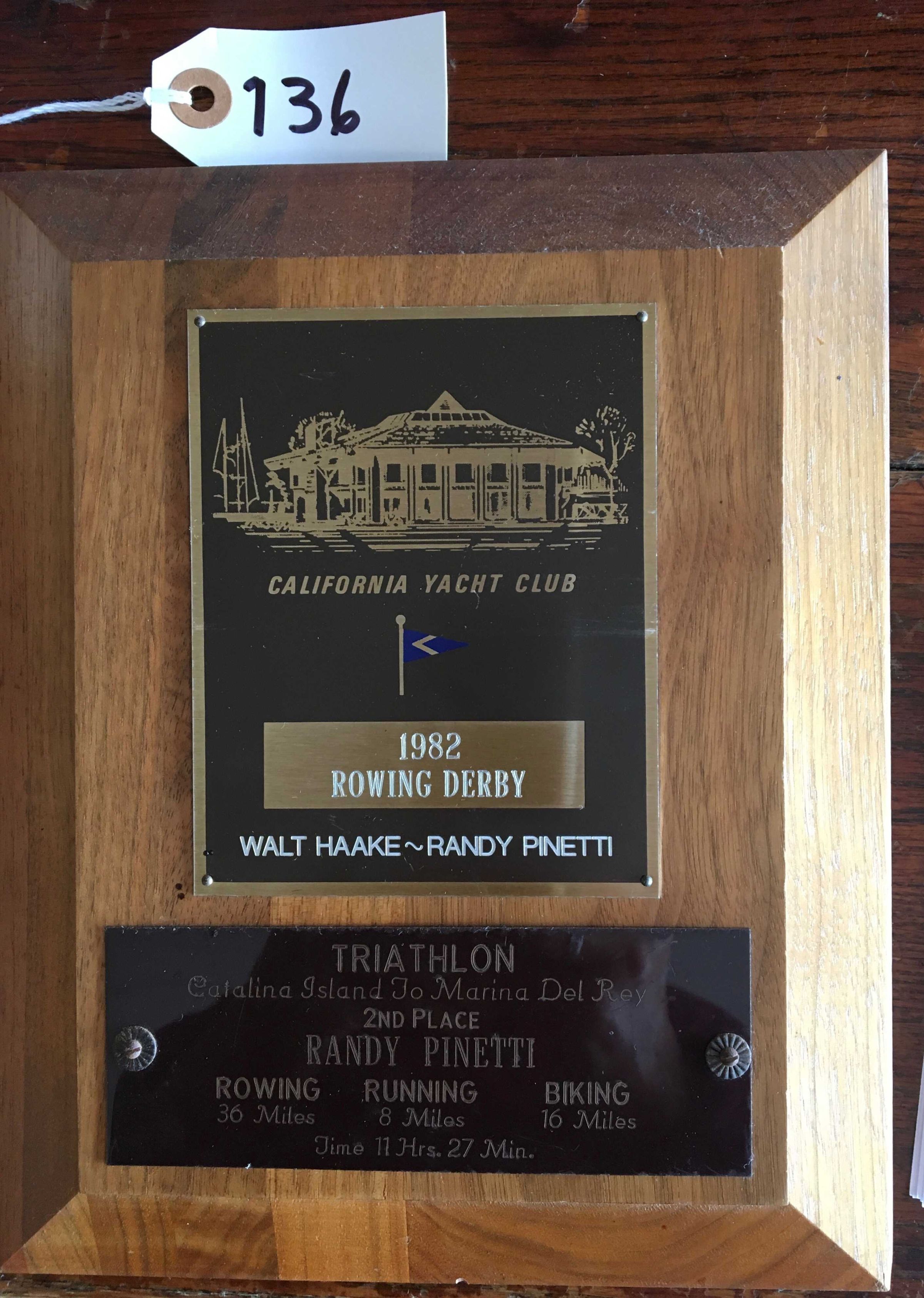 Lower plate text: "Triathlon - Catalina Island to Marina del Rey - 2nd Place - Randy Pinetti - Rowing Running Biking" with distances of each leg and overall time of 11hrs 27 mins.Made/Created