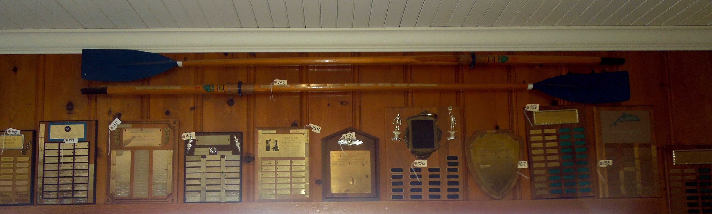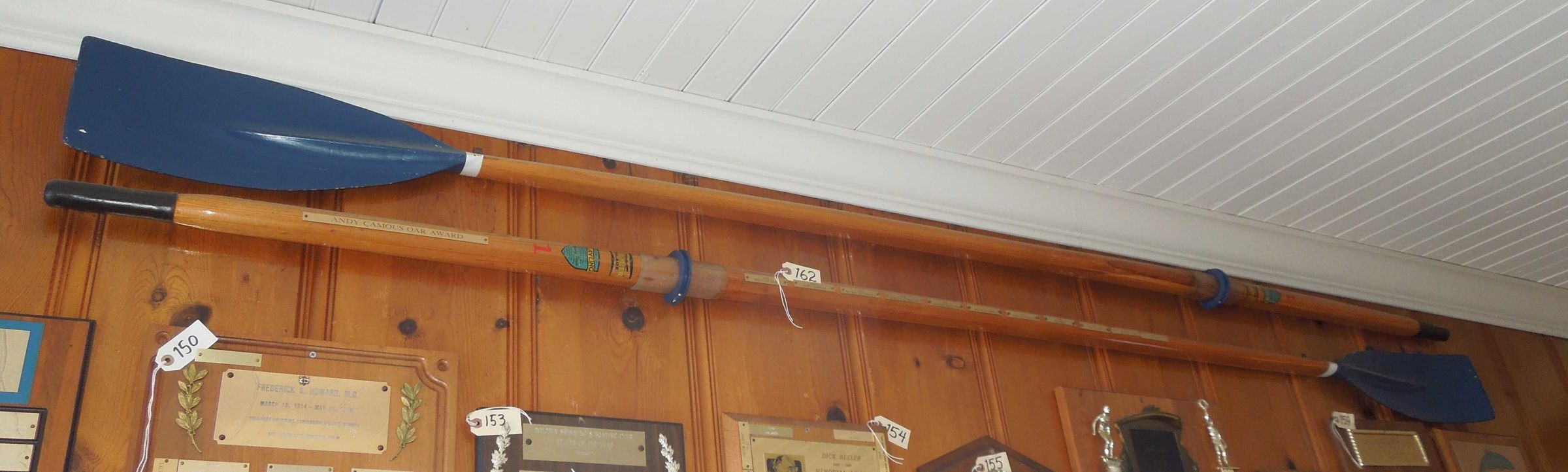 One oar has gold color title plate near had grip: "Andy Camous Oar Award"