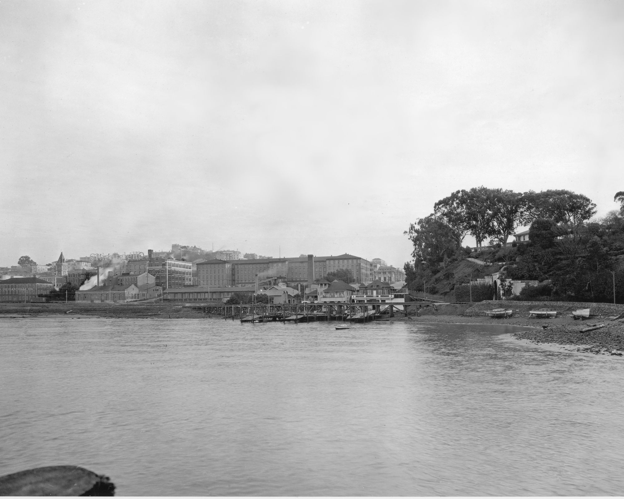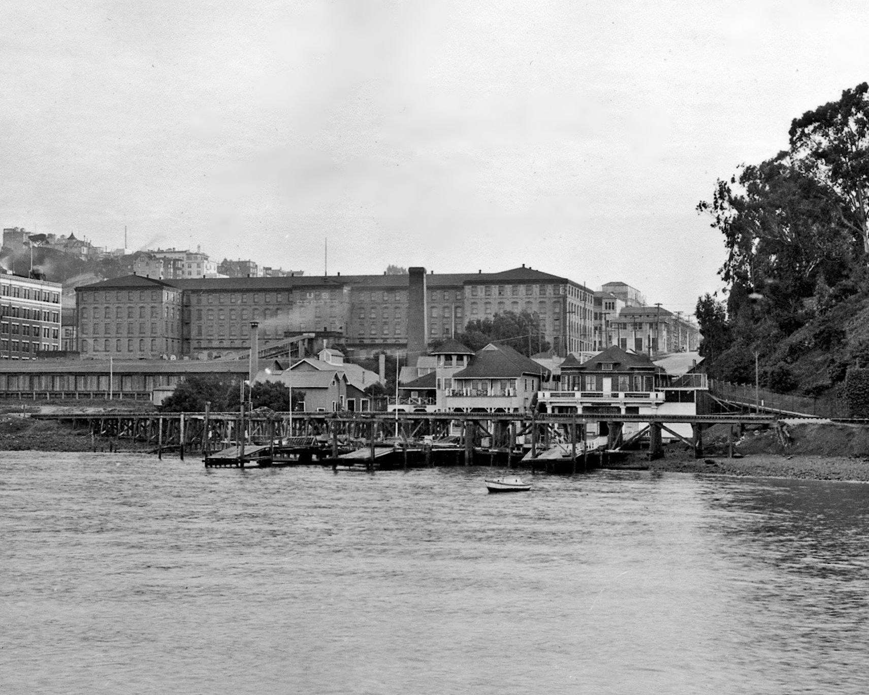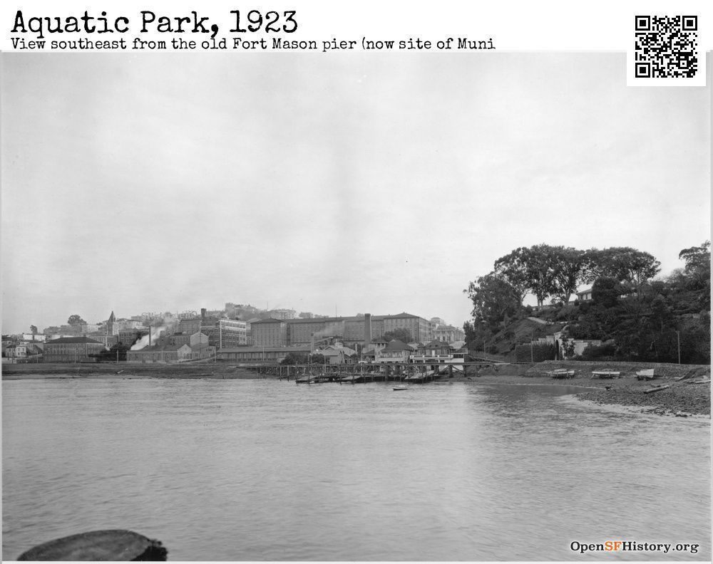 The rowing clubs, L to R, Ariel, Dolphin, and South End clubs in 1923. The other building to the left (east) was the Crystal Springs Water pumping station. The Dolphin Club boathouse was built in 1896. The other clubs arrived about a dozen years later. The railroad trestle over the club piers went to a tunnel under Fort Mason.Subject Place