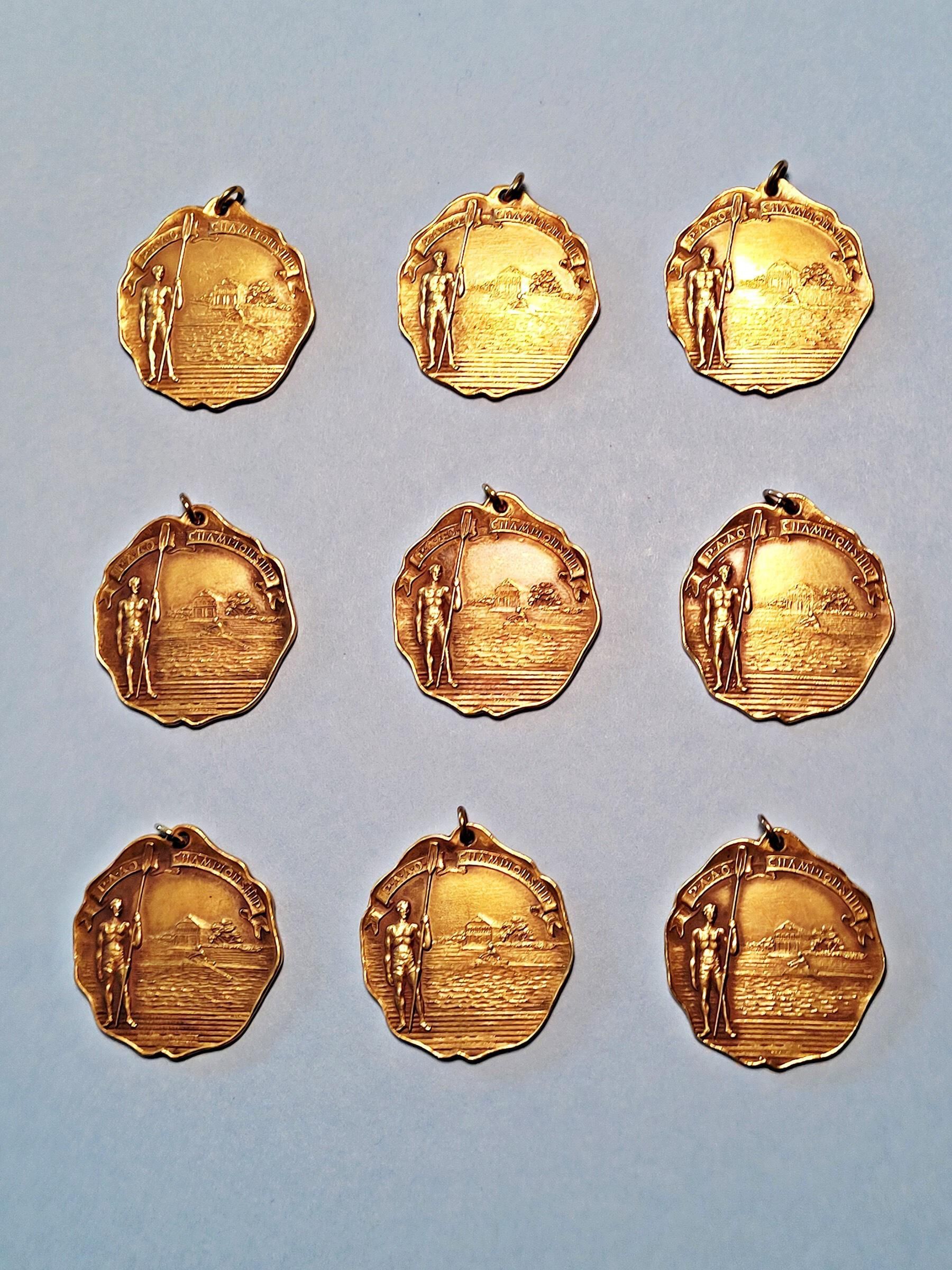 Nine gold-colored medals, about 1-1/4” in diameter with an artistic image of a rower and “PAAO Championship” on the face.