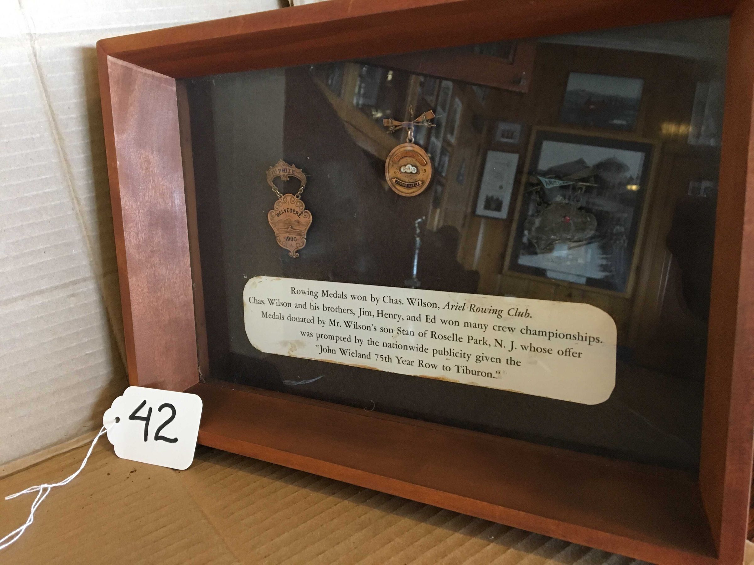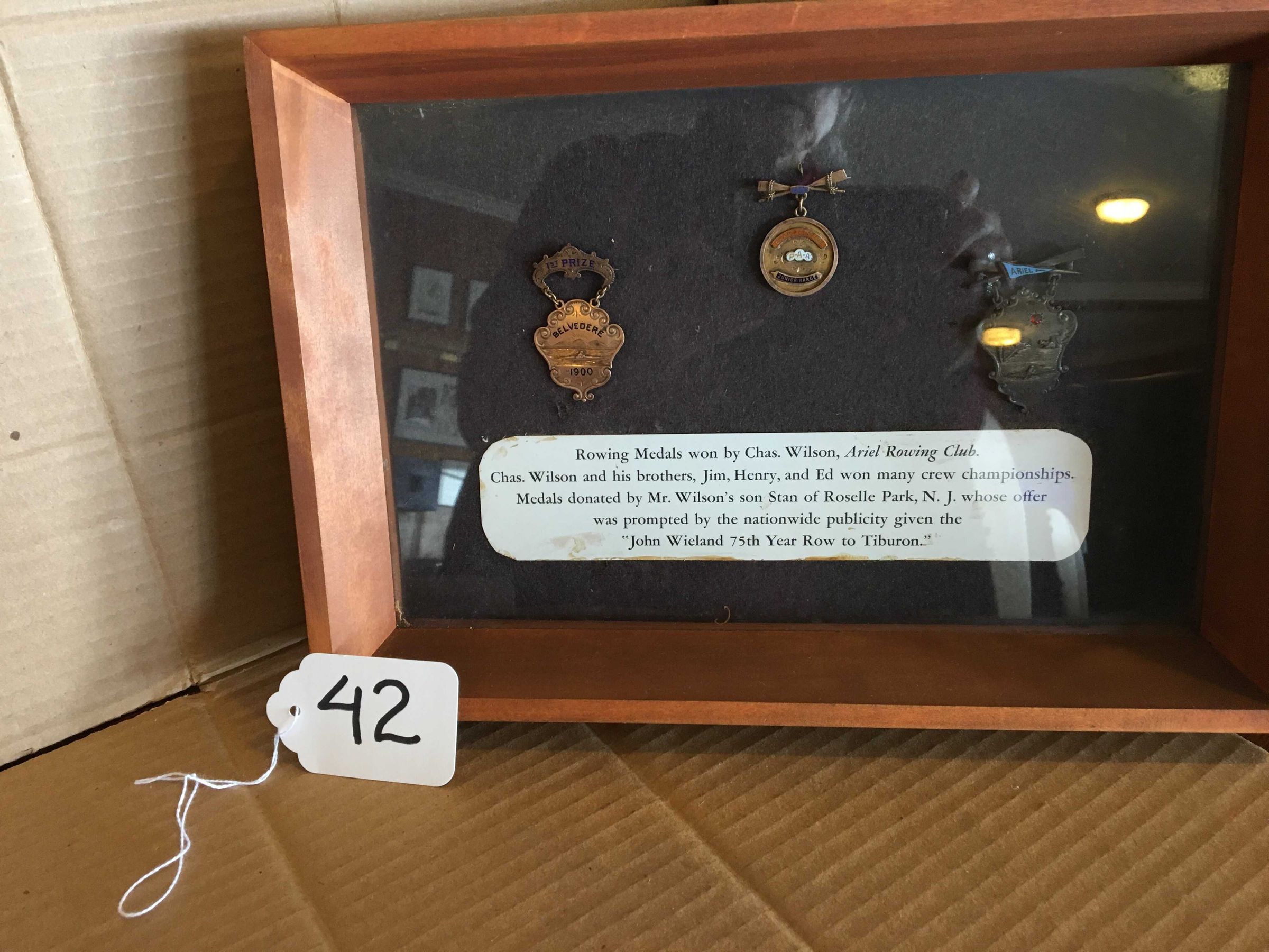 Text on white label under the medals: "Rowing Medals won by Chas. Wilson, Ariel Rowing Club. Chas. Wilson and his brothers, jim, Henry, and Ed w ay threw championships. Medals donated by Mr. Wilson's son Stan of Roselle Park, N.J. whose offer was prompted by the nationwide publicity given the "John Wieland 75th Year Row to Tiburon."Made/Created