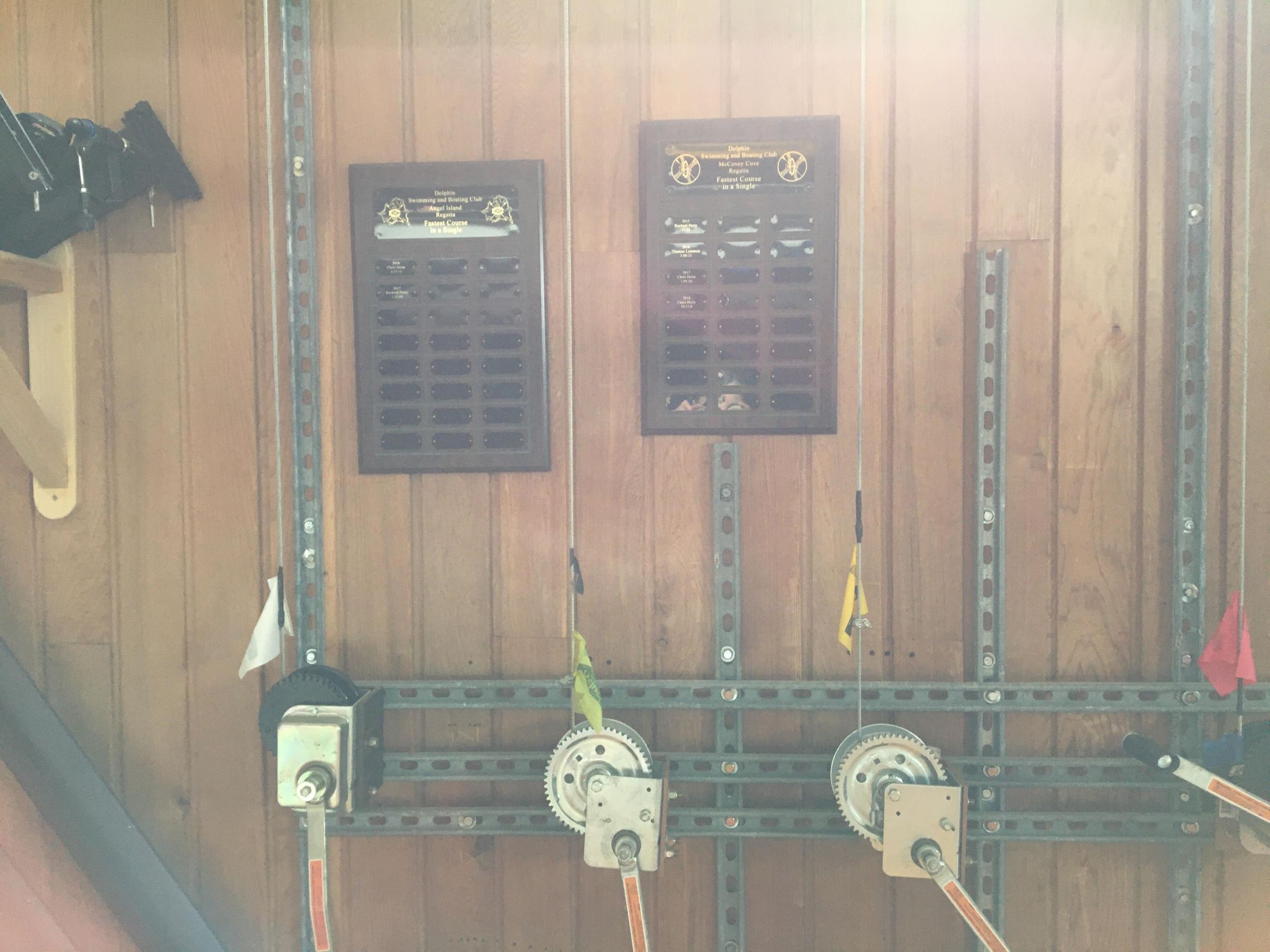 Wooden rowing plaque with one large title plate on top and 24 smaller plates in three columns below. First two plates have names 2016 and 2017.