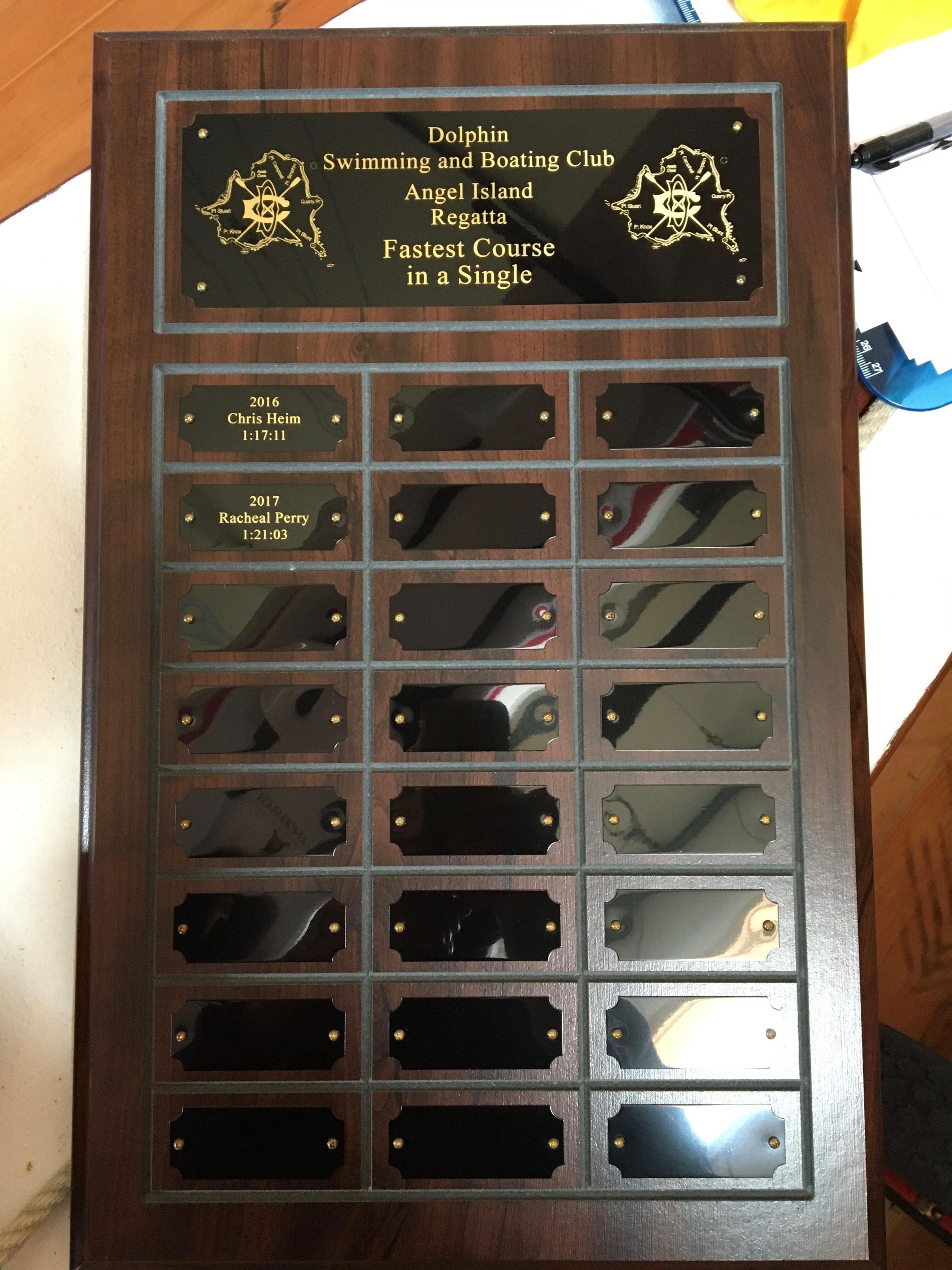 Text: " Dolphin Swimming and Boating Club - Angel Island Regatta - Fastest Course in a Single"Made/Created