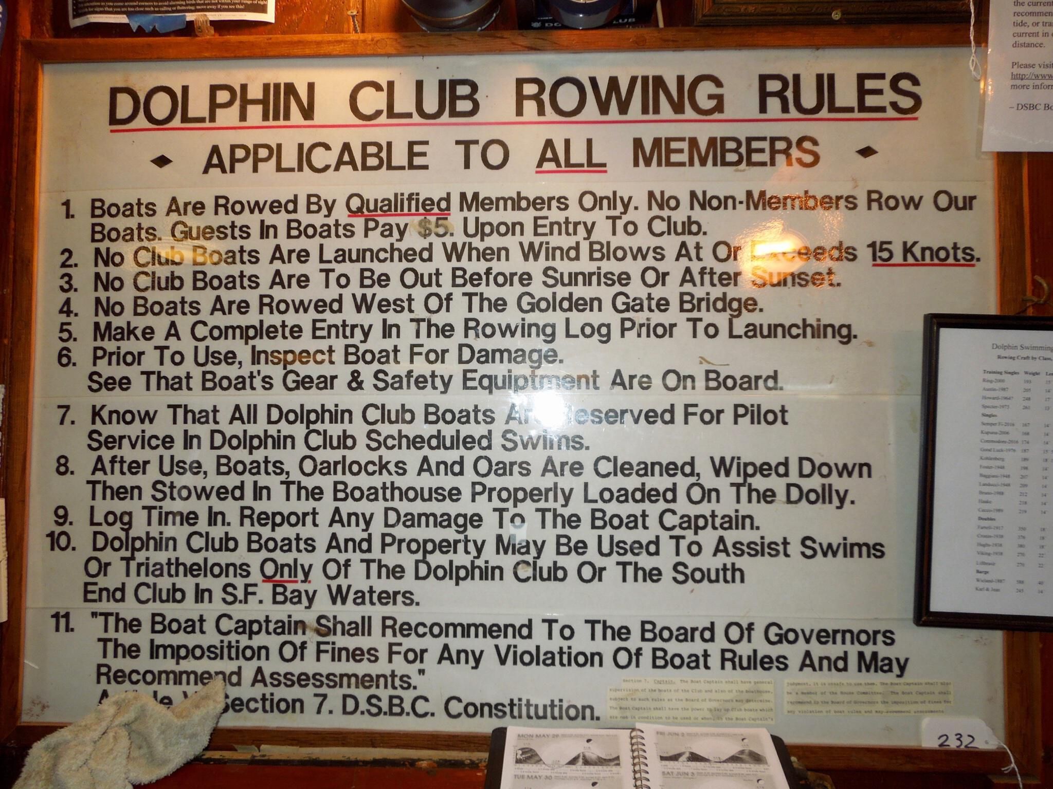 Dolphin Club Rowing Rules; framed notice with 11 rules listed, and "APPLICABLE TO ALL MEMBERS"Made/Created