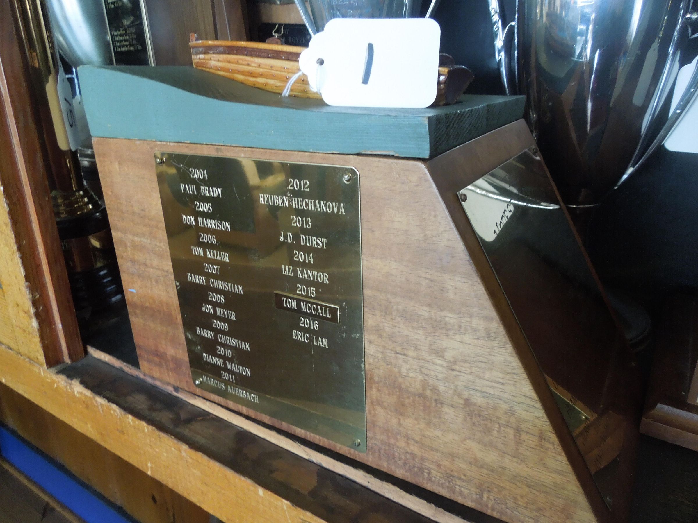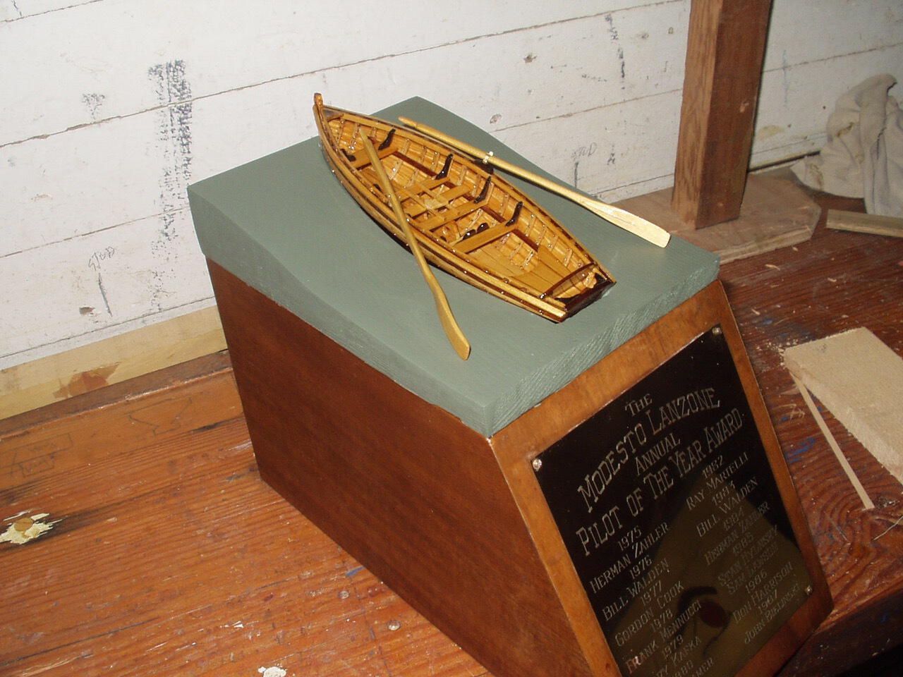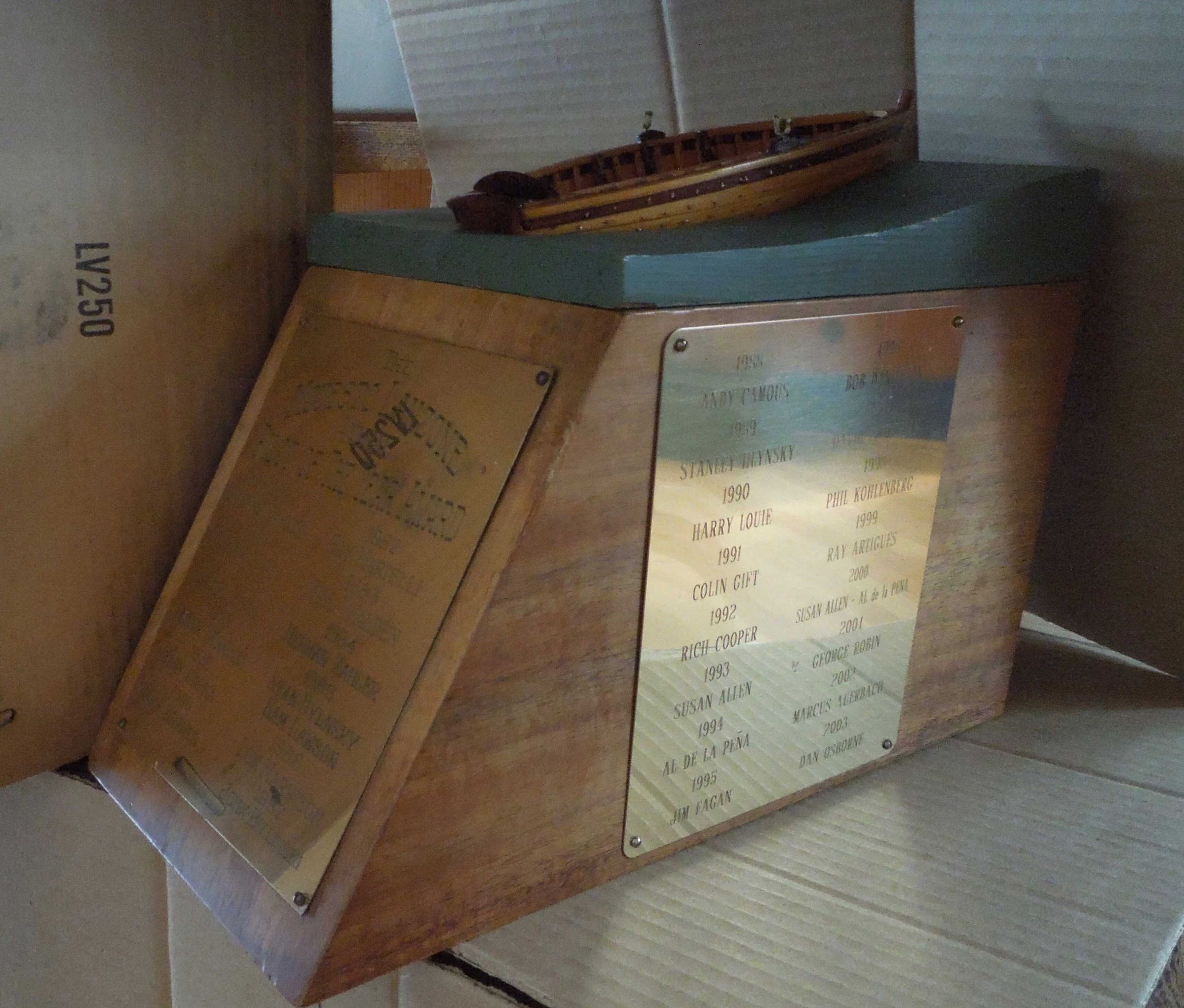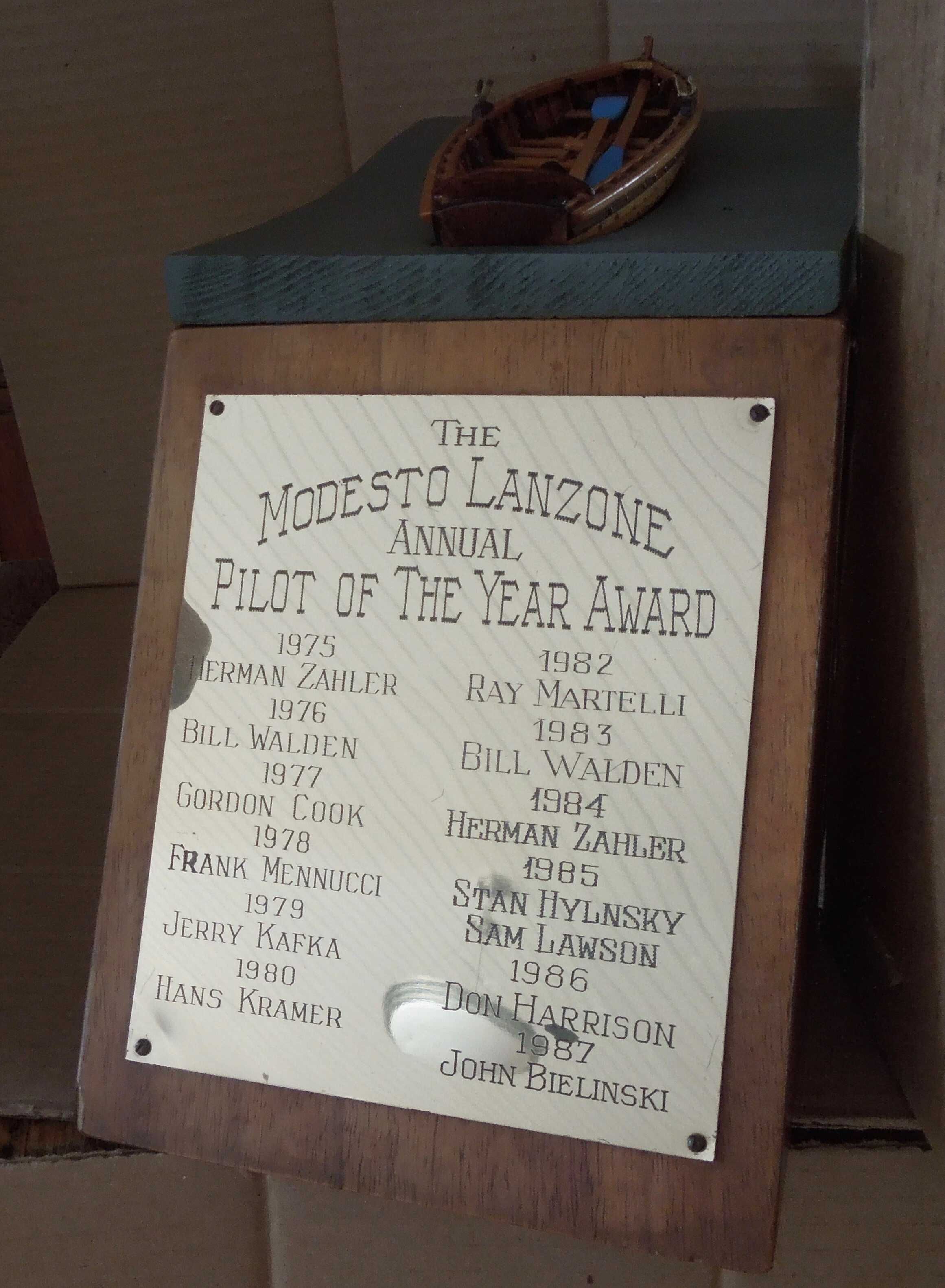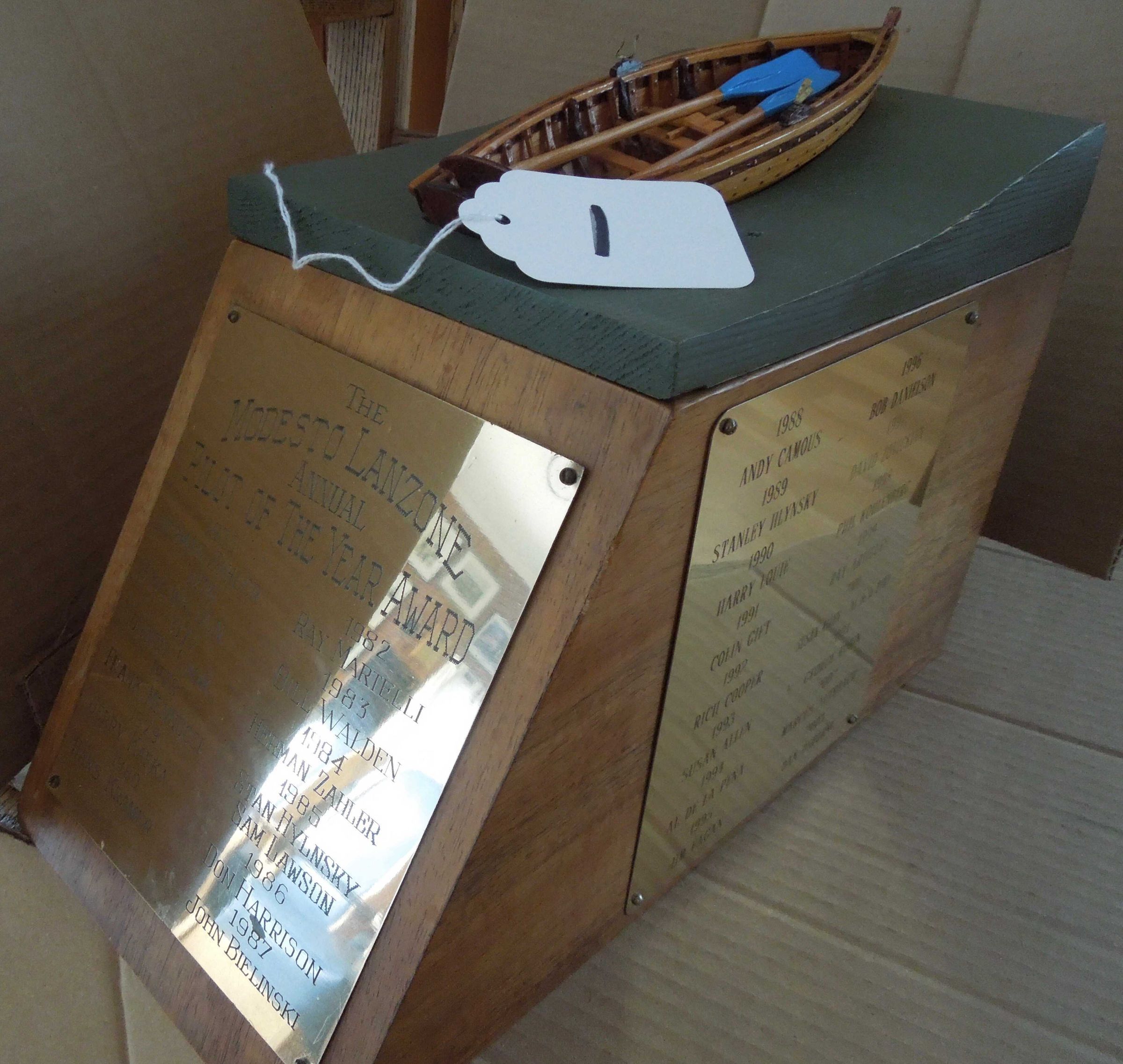 John Selmer made the replacement wooden model boat on top in 2003. Selmer made a similar boat model to give to each pilot of the year awardee until 2011. See notes and other photos in folder on Artifact 261.Person or Organization