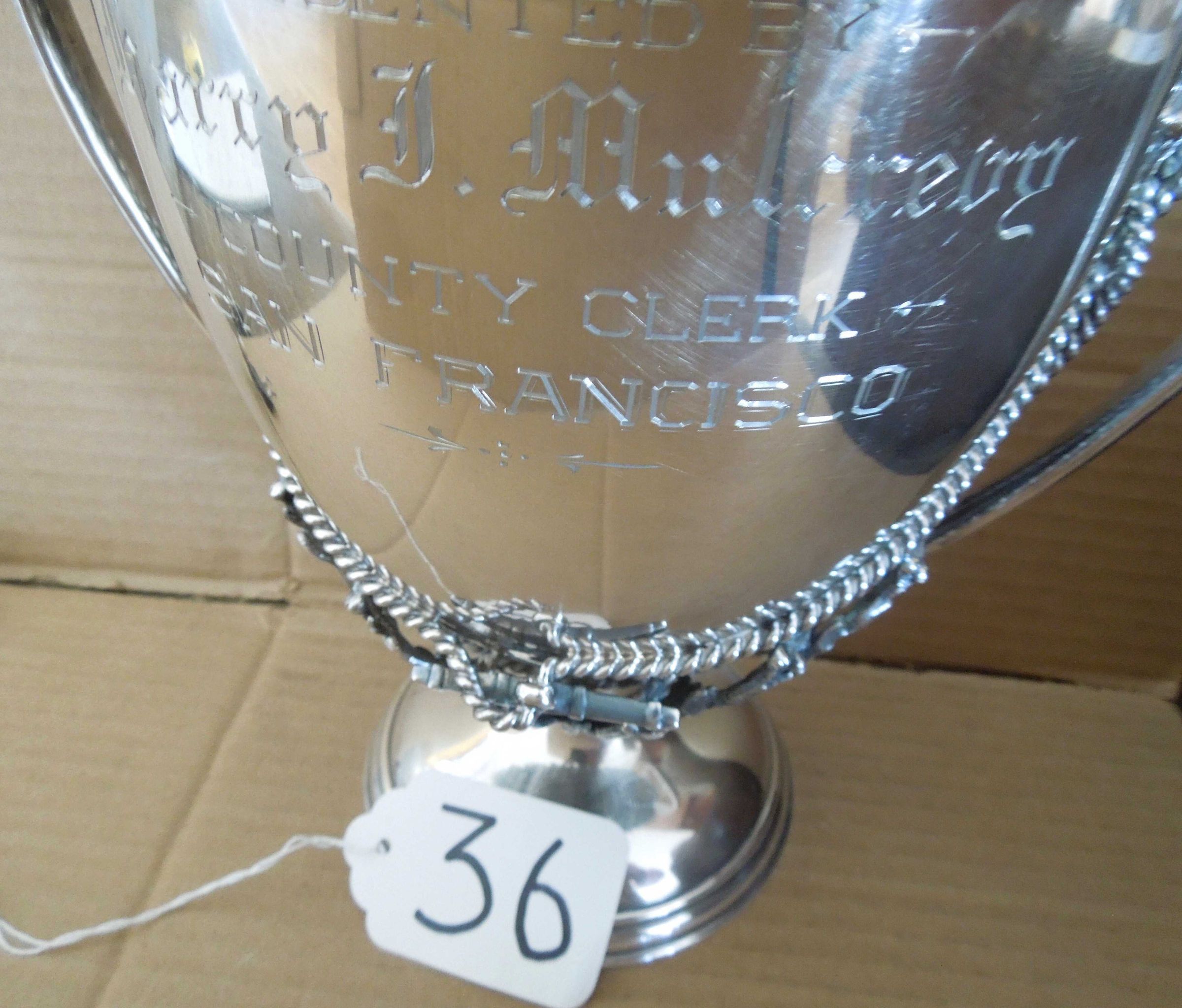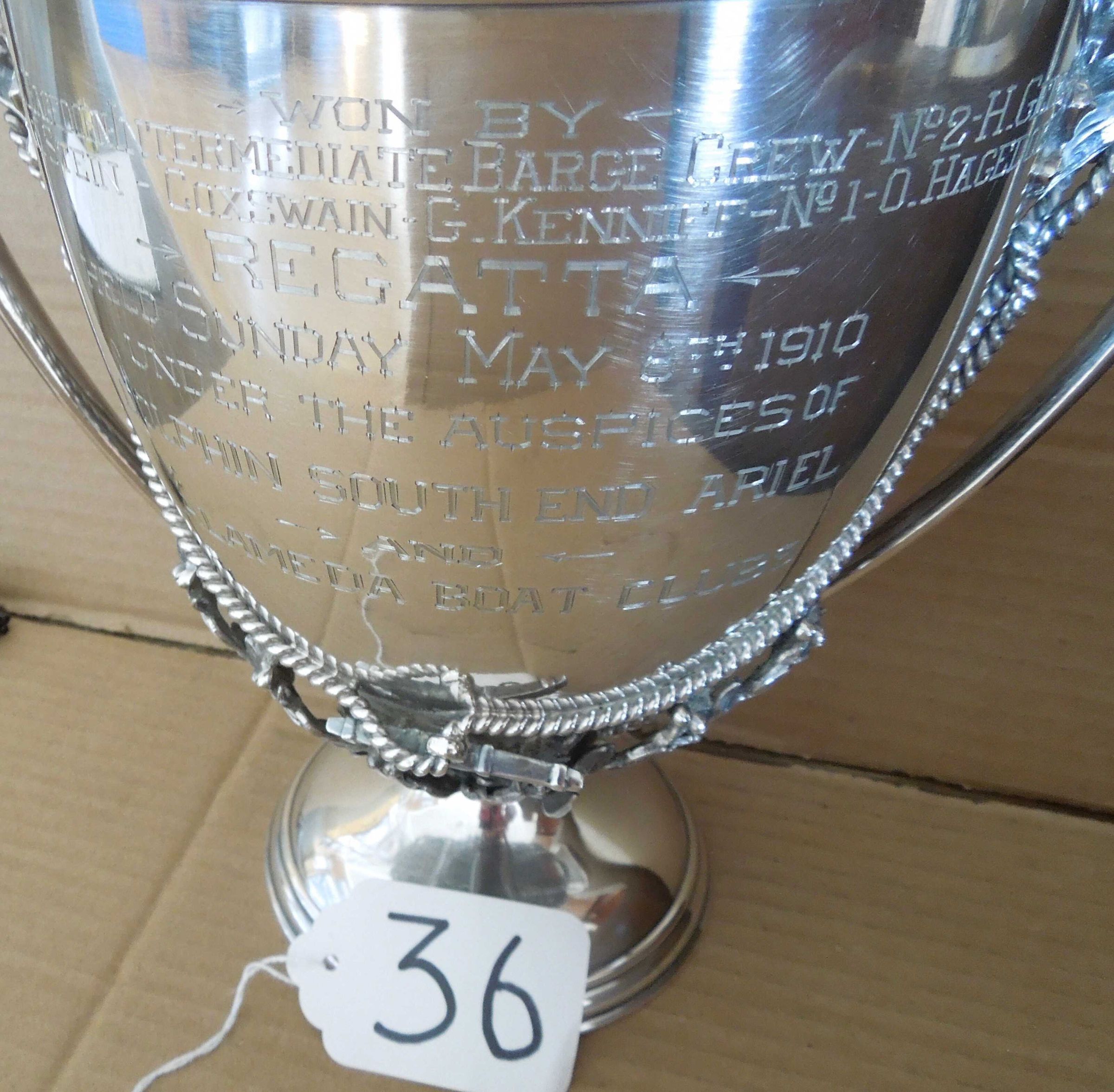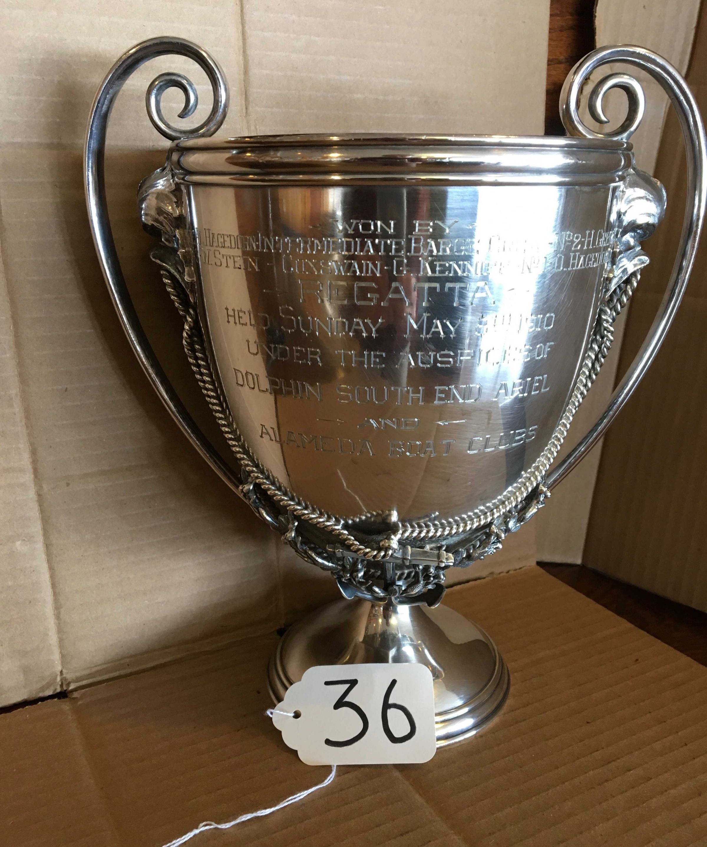 Engraved on front: on front: "Won by -Stroke Al Hagedorn, Intermediate Barge Crew No. 2 - H. Gerdes, No.3 - W. Stein, Cox swain - G. Kenniff, No.1 O. Hagedorn -Regatta - Held Sunday May 8th 1910- Under the Auspices of - Dolphin South End Ariel - And - Alameda Boat Clubs"