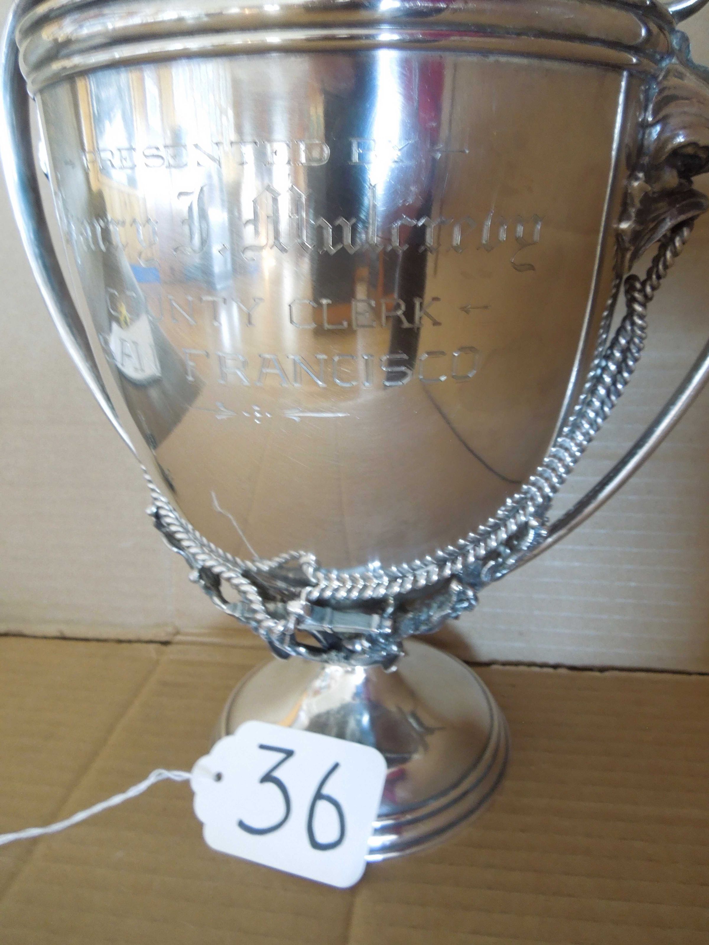 Large silver cup with two handles and round base. Handles topped with curled design, silver "rope" draped on both sides and joined at base with an anchor.