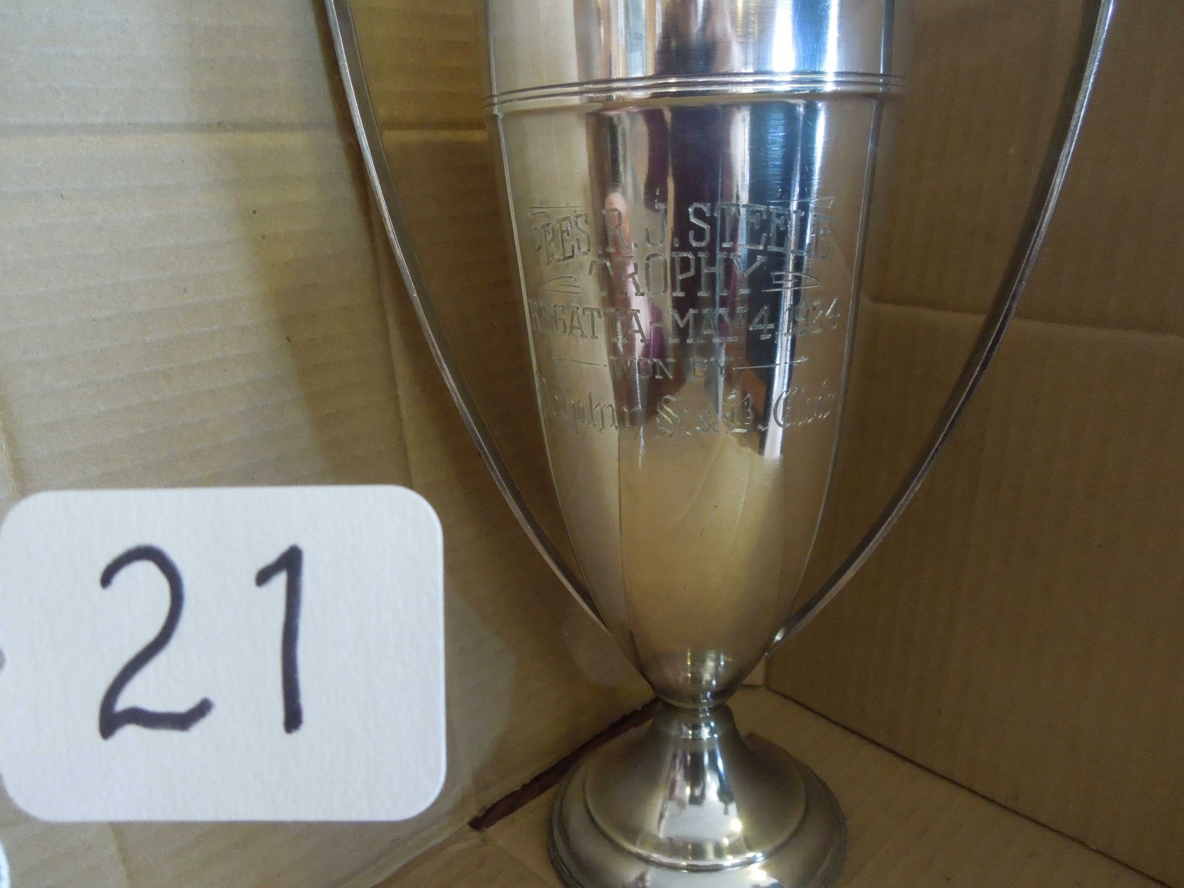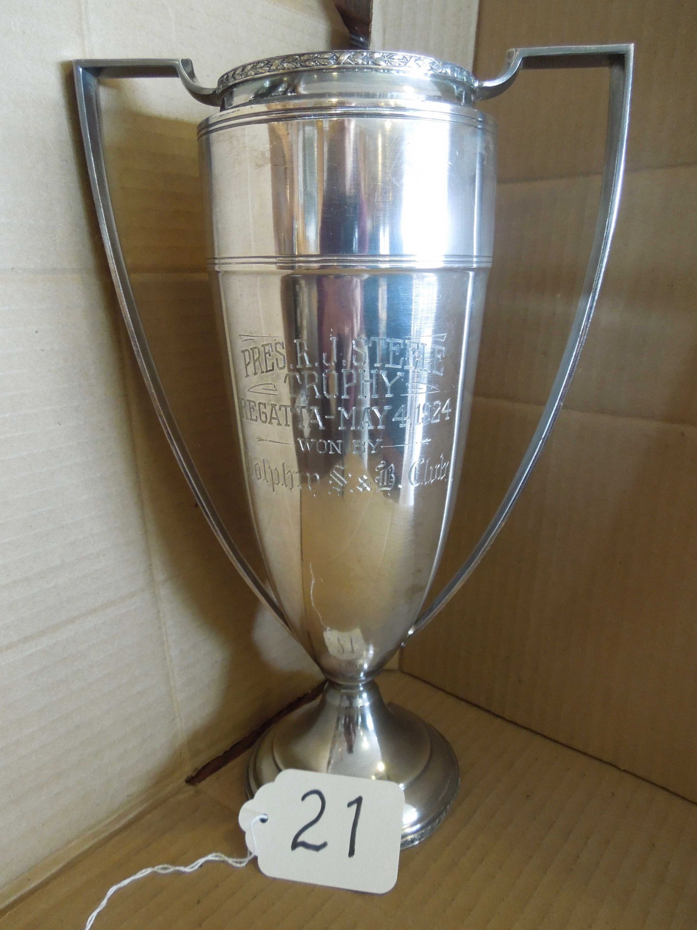 Silvertone 2 handled cup; Engraving on cup: “Pres. R. J. Steele - Trophy - Regatta - May 4, 1924 - won by - Dolphin S & B Club;”