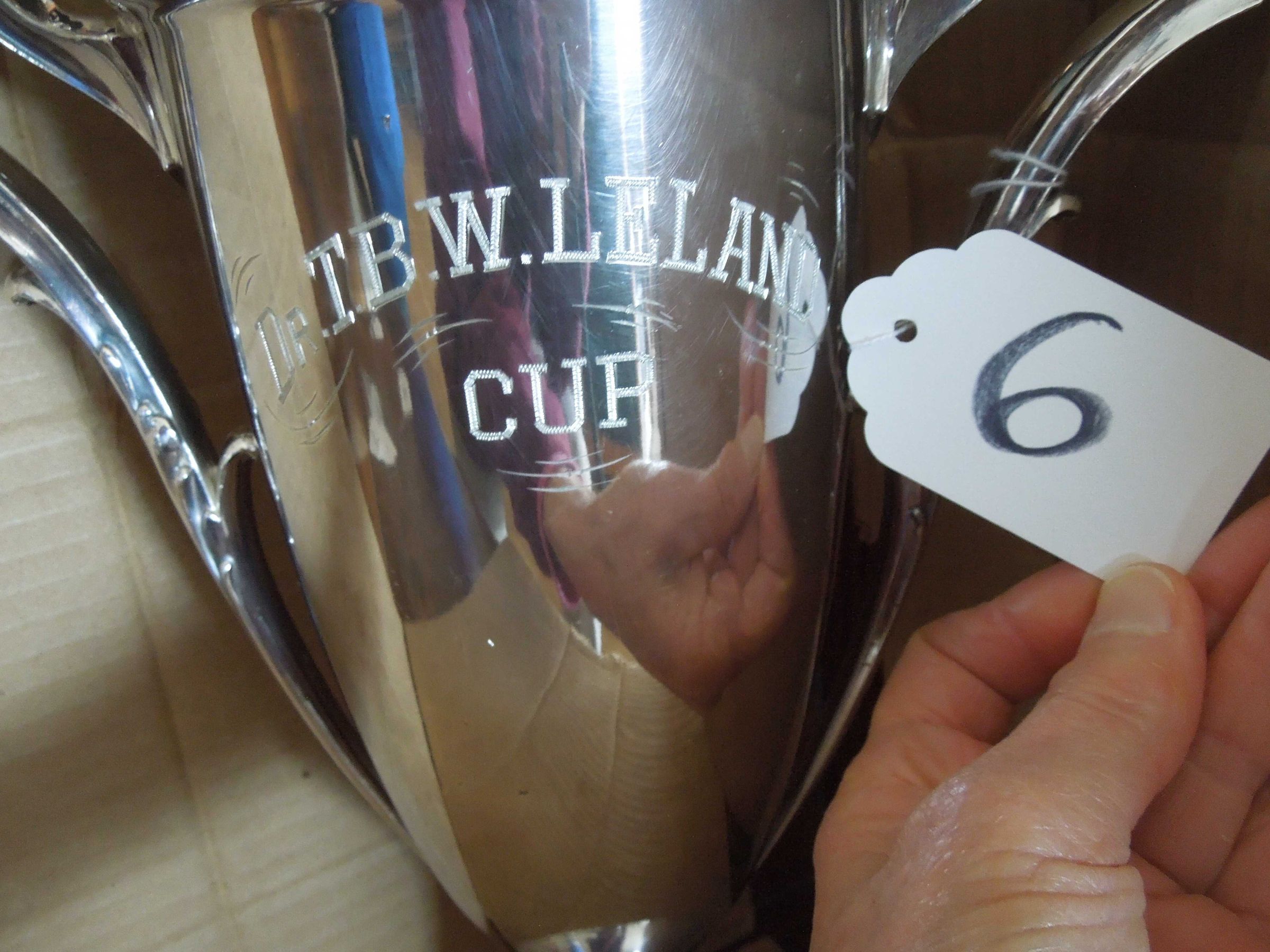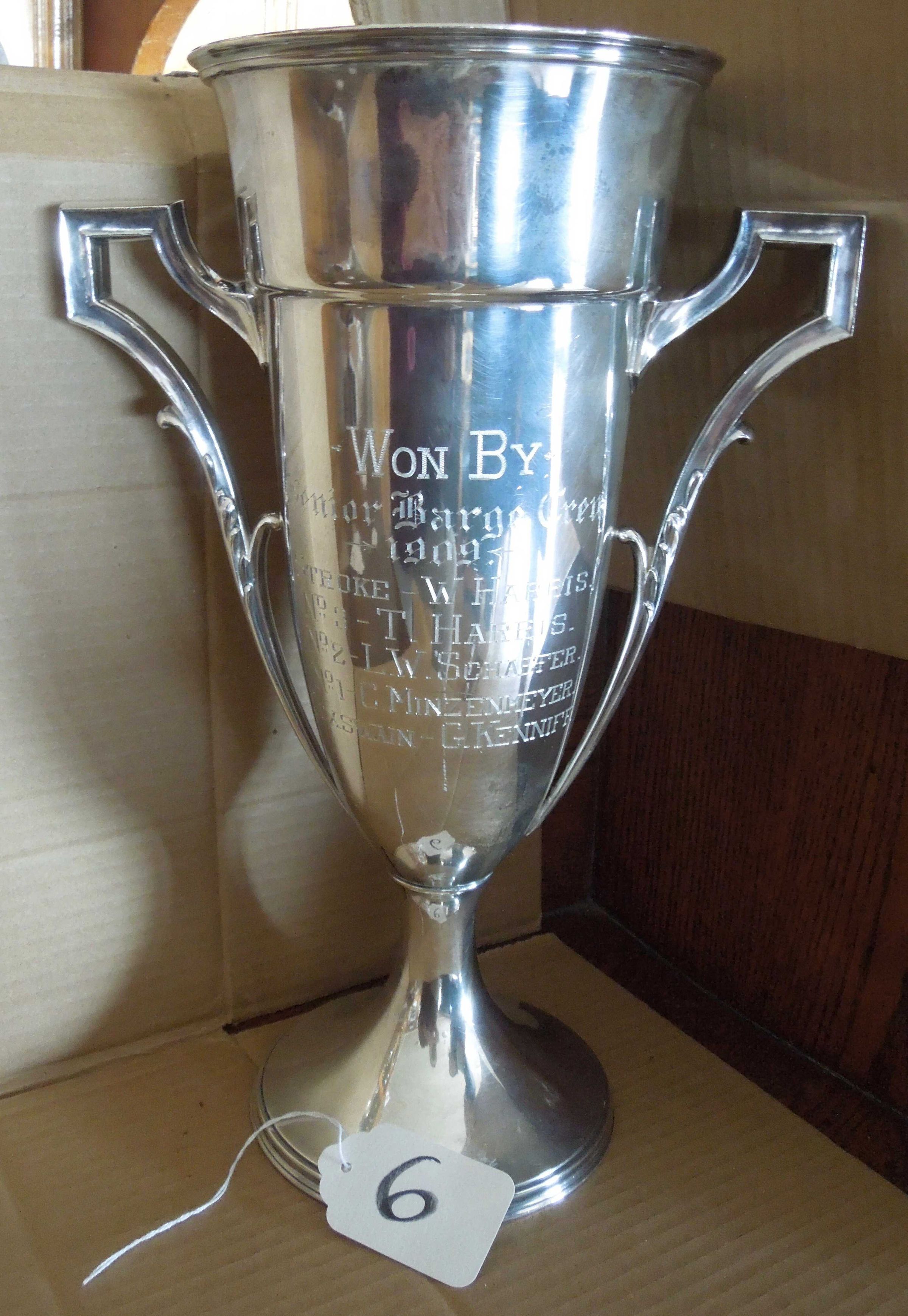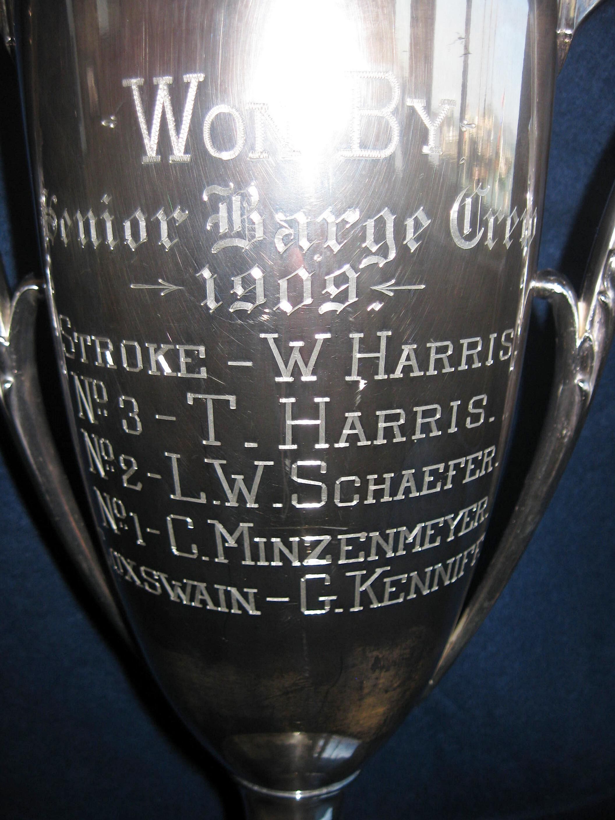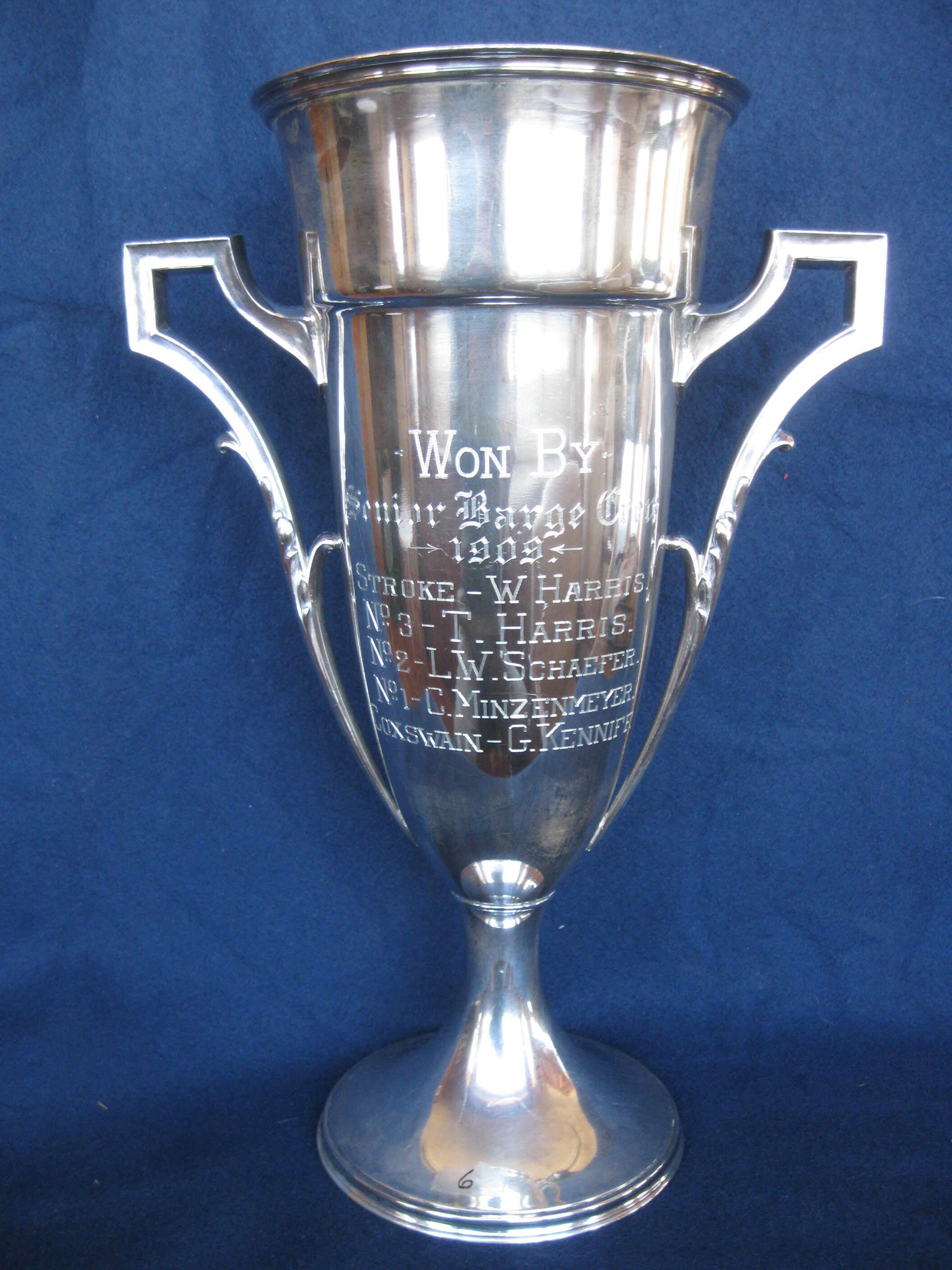 On back is engraved "Dr. T. B. W. Leland Cup;" On front cup is engraved, “Won by Senior Barge Crew 1909;” Crew names engraved: W. Harris, T. Harris, L.W. Schaeffer, C. Minzenmeyer, G. Kenniff
