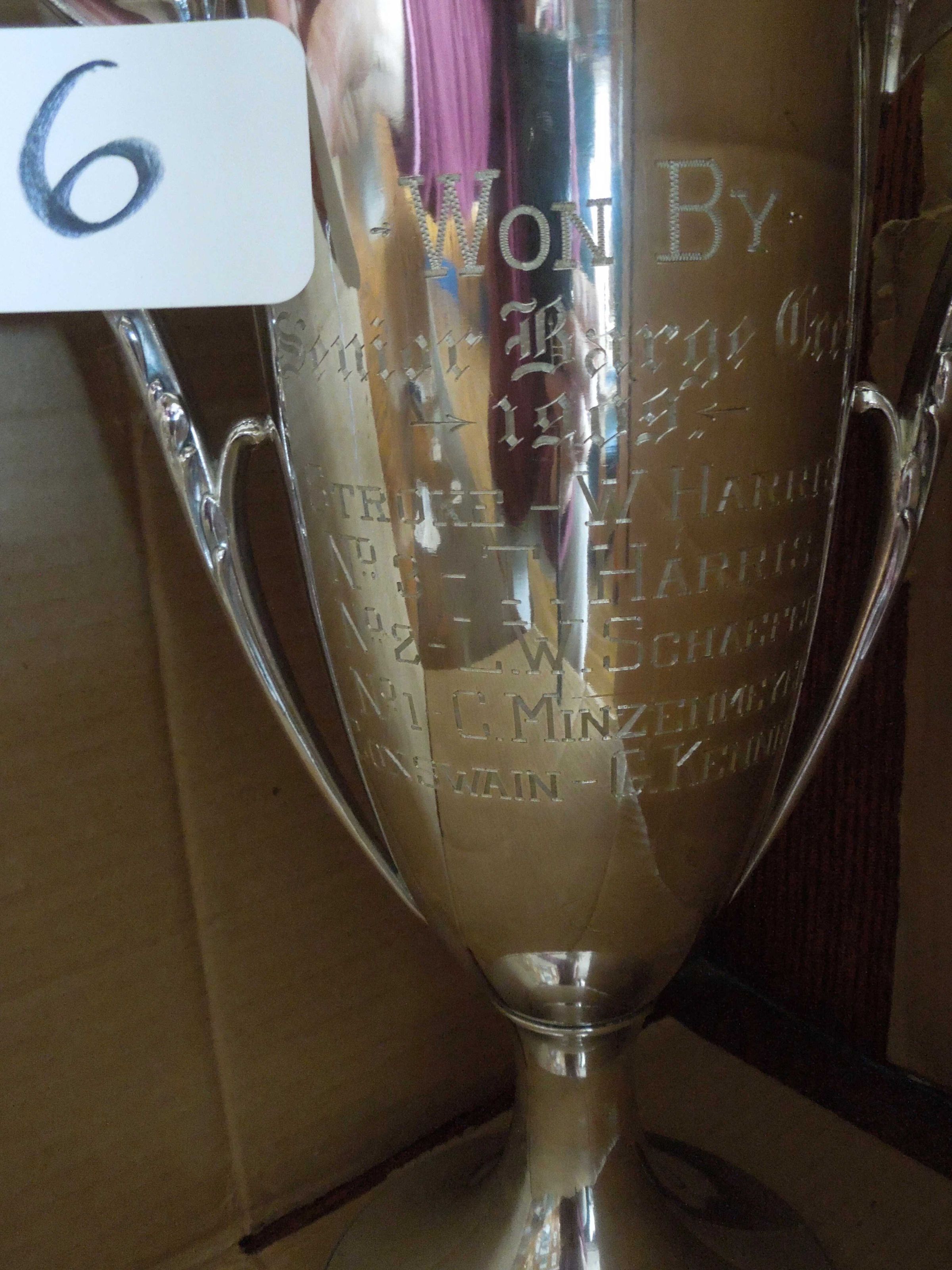 2 handled silver tone or silver cup rowing trophy ;