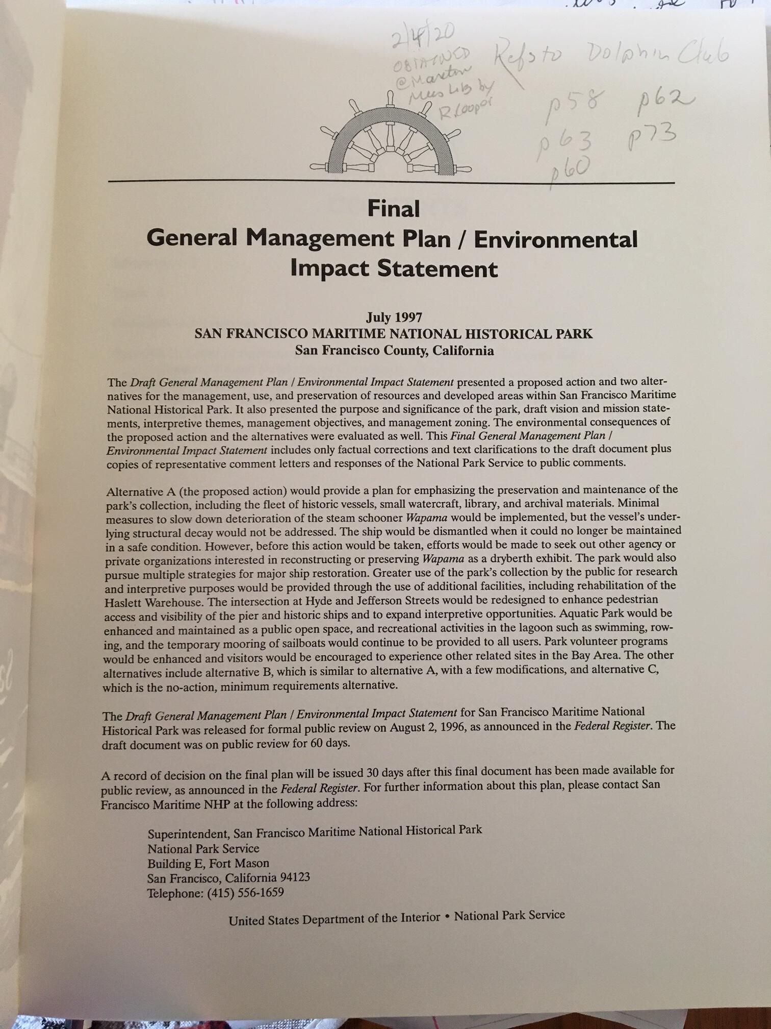 NPS publication entitled "San Francisco NHP Final General Management Plan & Environmental Impact Statement." 92 pages.Book Details
