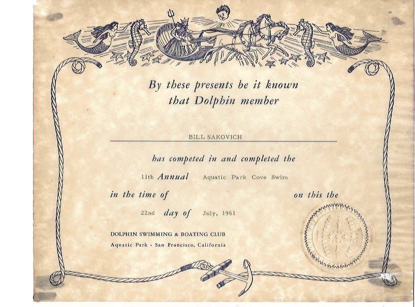 Scan of certificate of completion in Dolphin Cub Annual Aquatic Park Swim July 22, 1961 awarded to Bill Sakovich (sic).Acquisition
