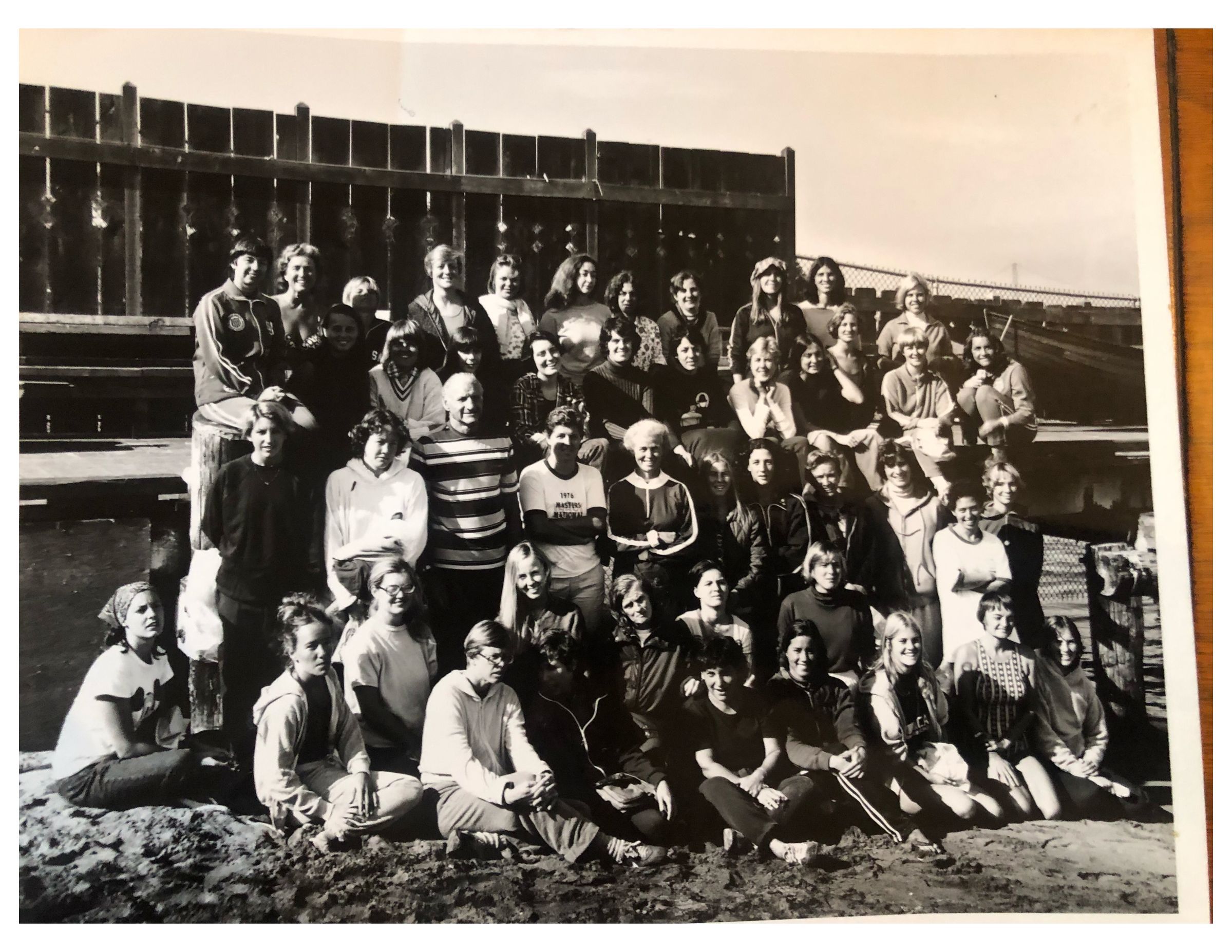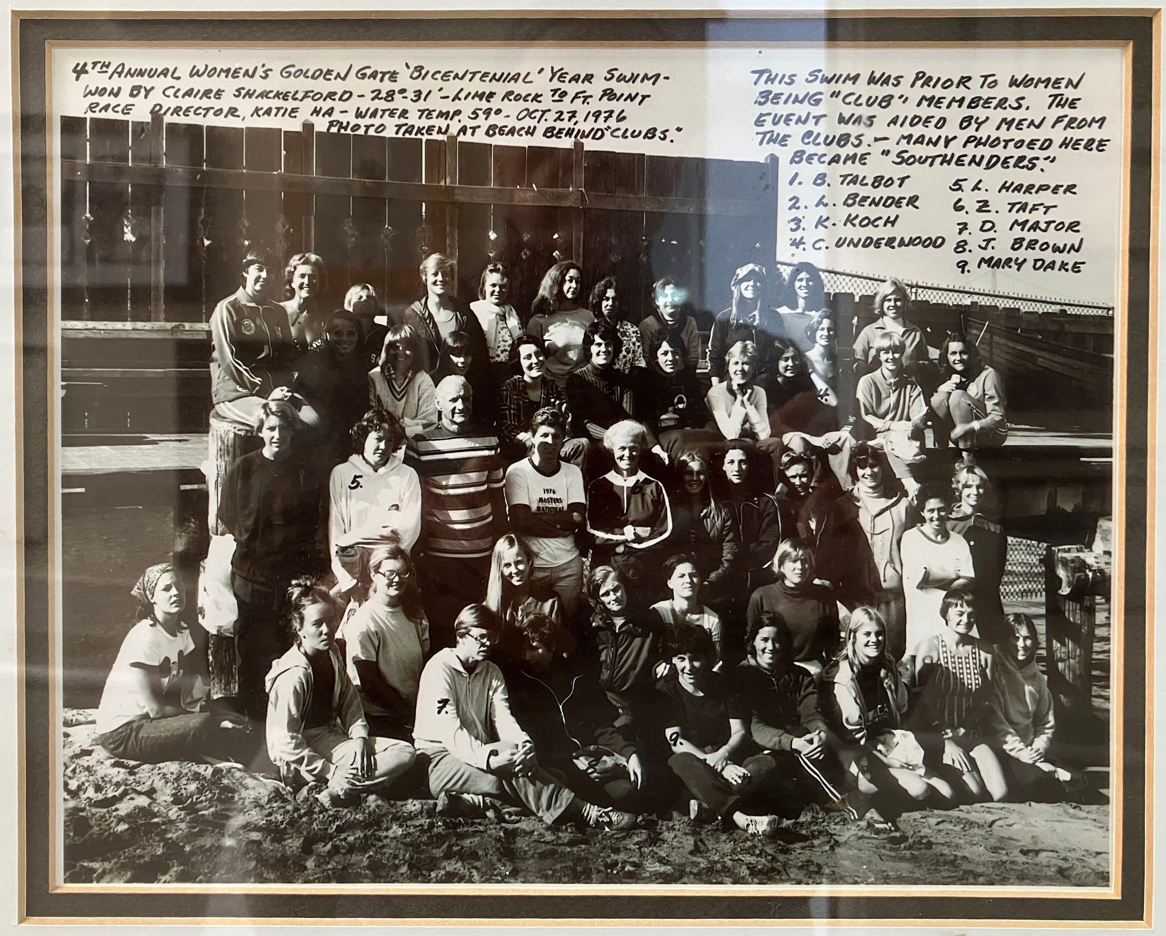 Caption 1: 4th annual Women's Golden Gate 'Bicentennial' year swim won by Claire Shakelford 28min 31 sec - Lime Rock to Fort Point. Race Director Katie Ha. Water temp 59° - Oct. 27, 1978. Photo taken at beach behind "Clubs."