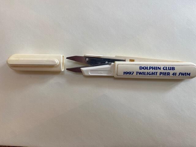 Personal grooming scissors in white plastic case. Printed in blue on one side: Dolphin Club - 1997 Twilight Pier 41 Swim.