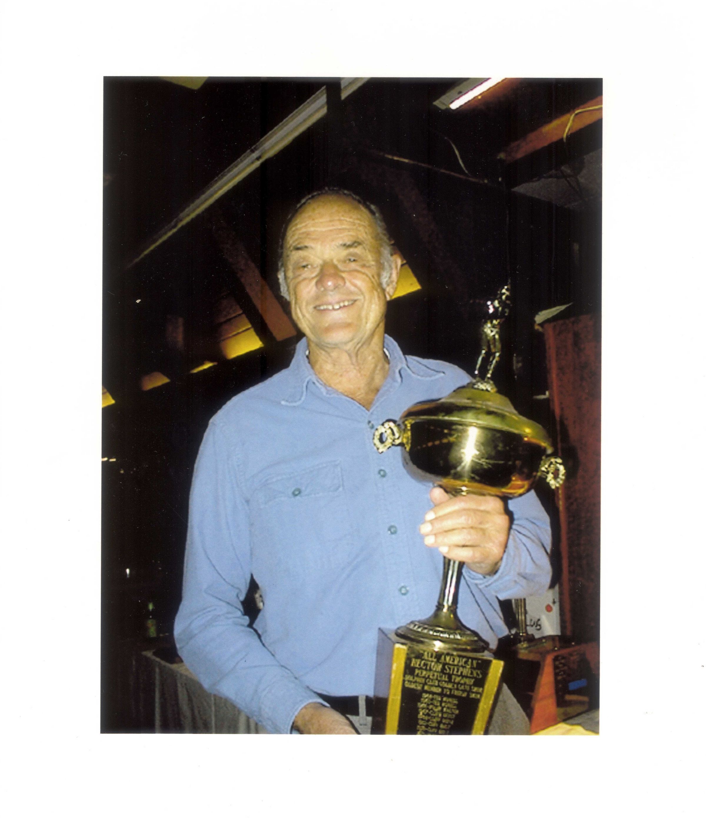 Walt Schneebeli with a Golden Gate Swim trophySubject Person or Organization