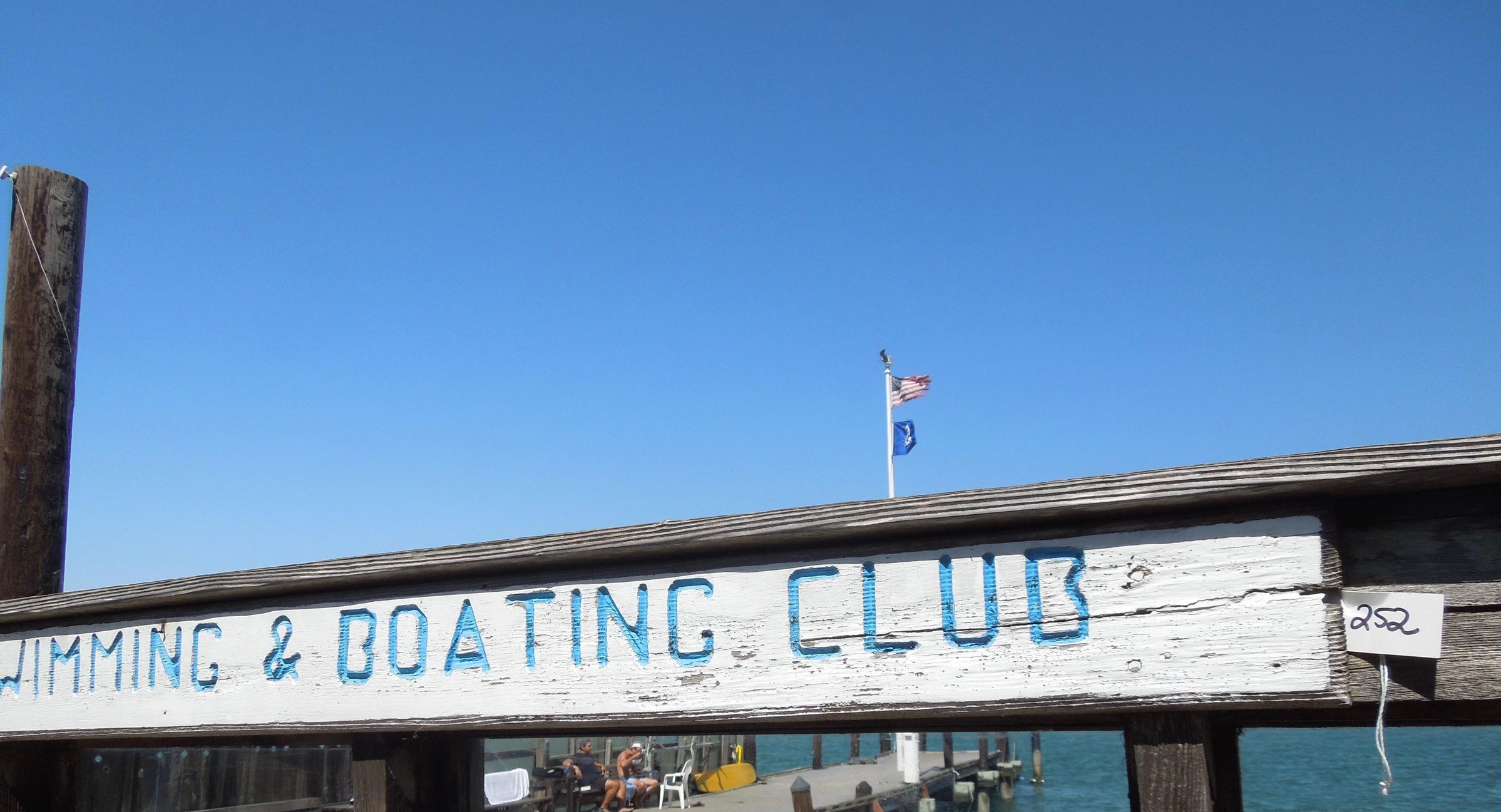 Wooden sign on north side of sun deck. Painted white, carved wooden letters painted light blue. Text: "The Dolphin Swimming & Boating Club"