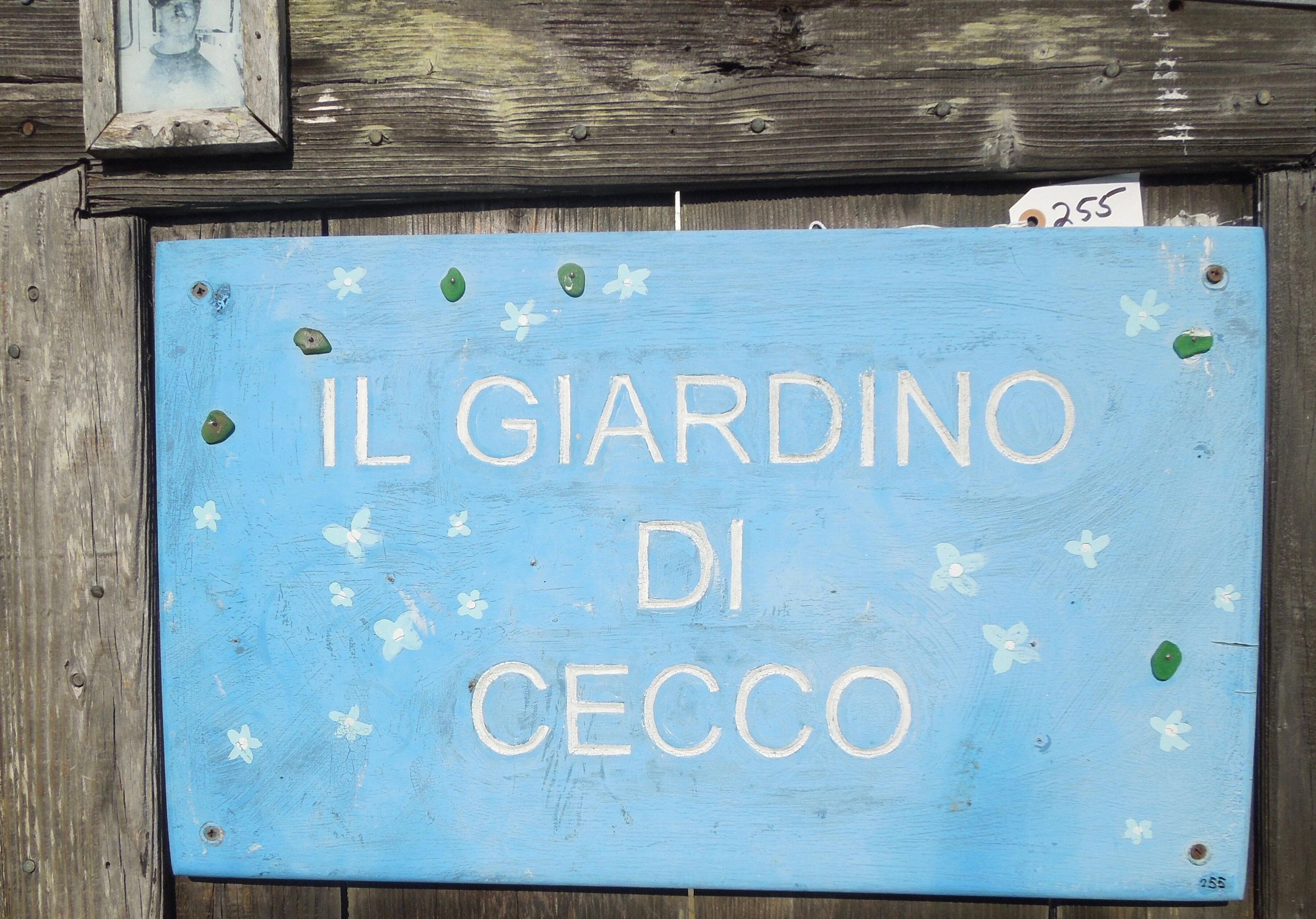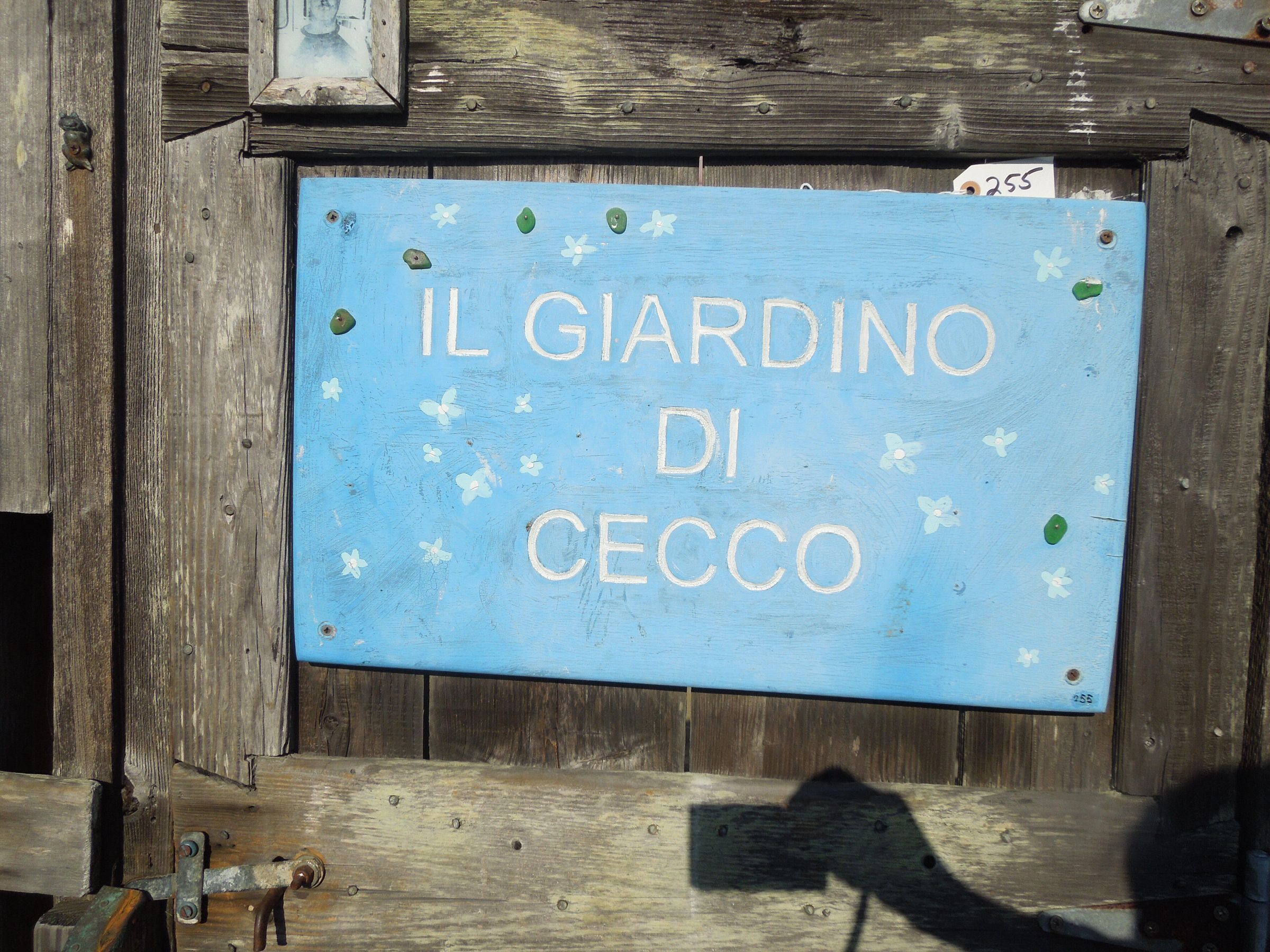 Photo fo Frank Mennucci in rough wood frame nailed to gate above and to left of sign.
