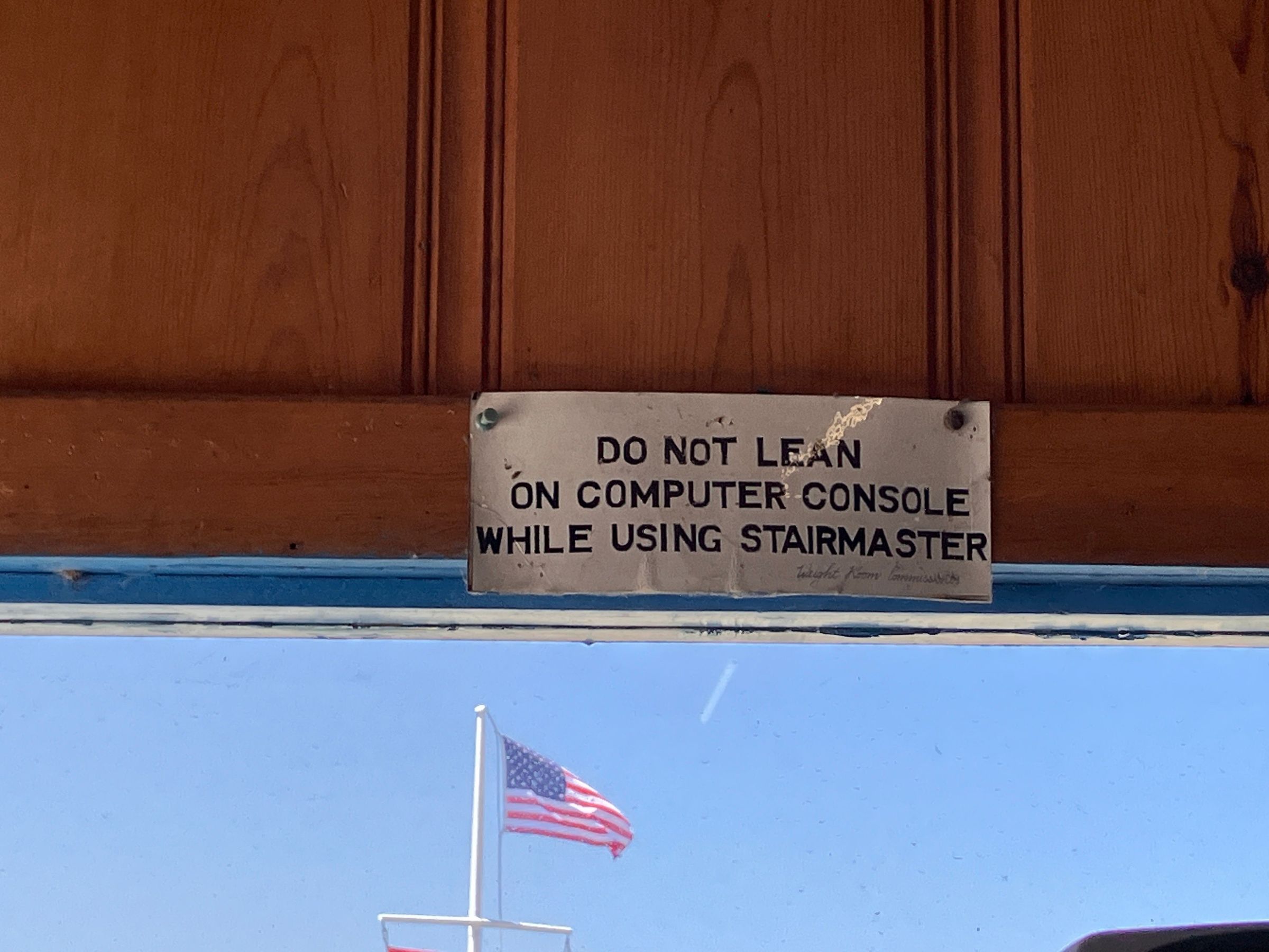 Stiff paper/cardboard sign on north wall of weight room by Stairmaster machines. White with black text: Do not lean - on computer console - while using Stairmaster - Weight Room Commissioners"