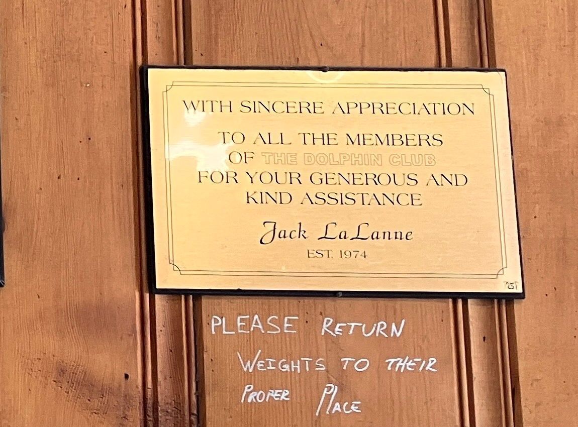 Text: With Sincere Appreciation - To All the Members - of the Dolphin Club - For Your Generous and - Kind Assistance - Jack La Lane - Est 1974Location