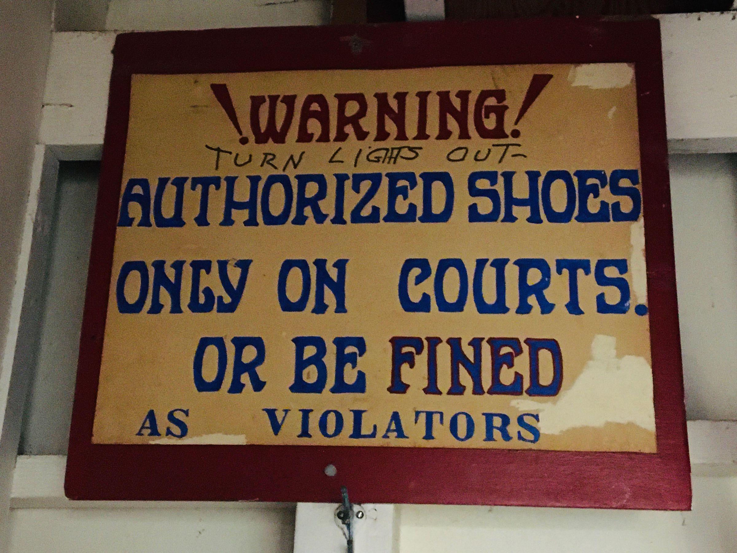 Wooden sign hanging above and to west of doorway to handball court. Painted letters (all in dark blue, except warning in red) state: "! Warning ! - Authorized shoes - Only on courts. - Or be fined - As violators."
