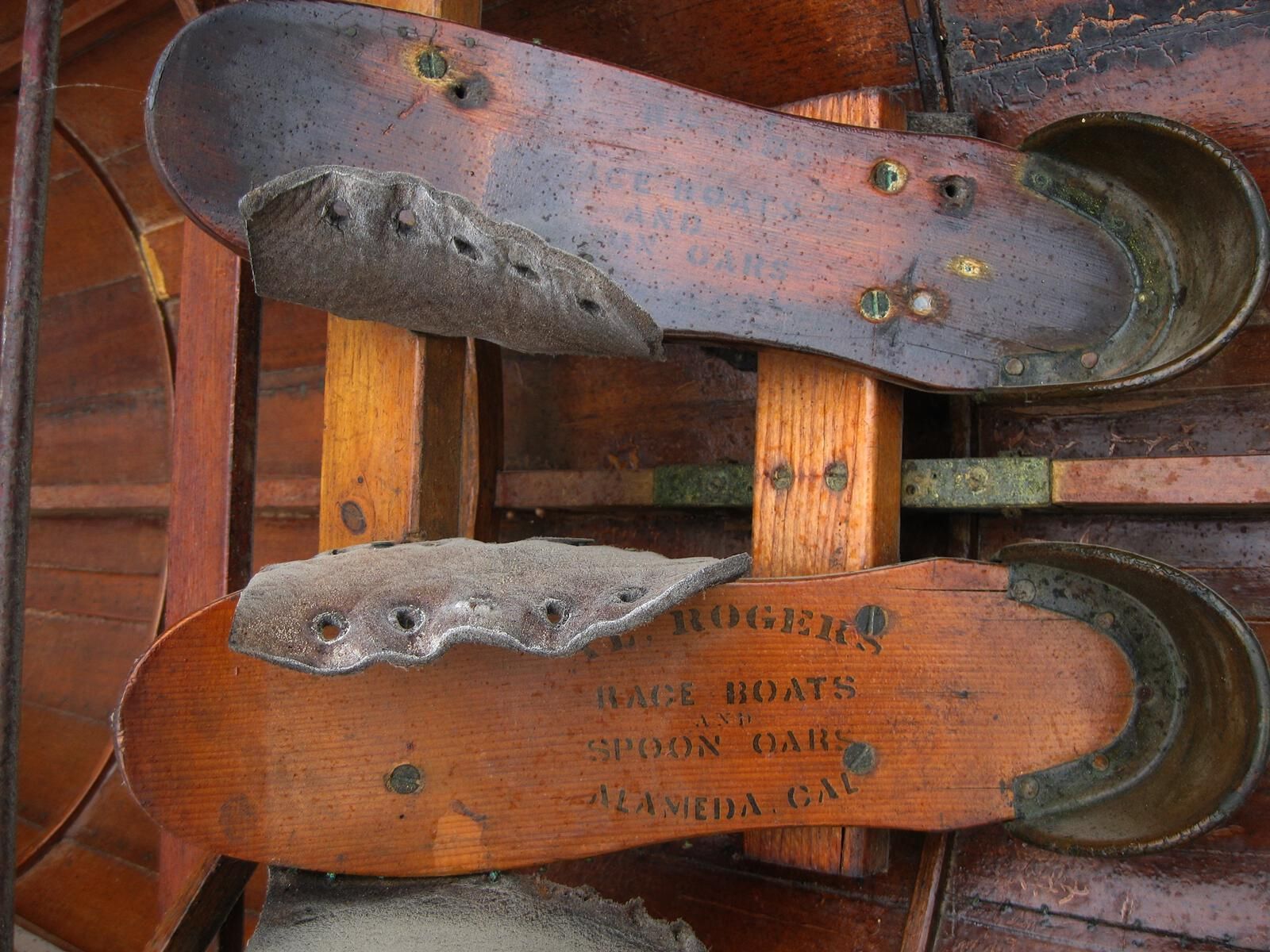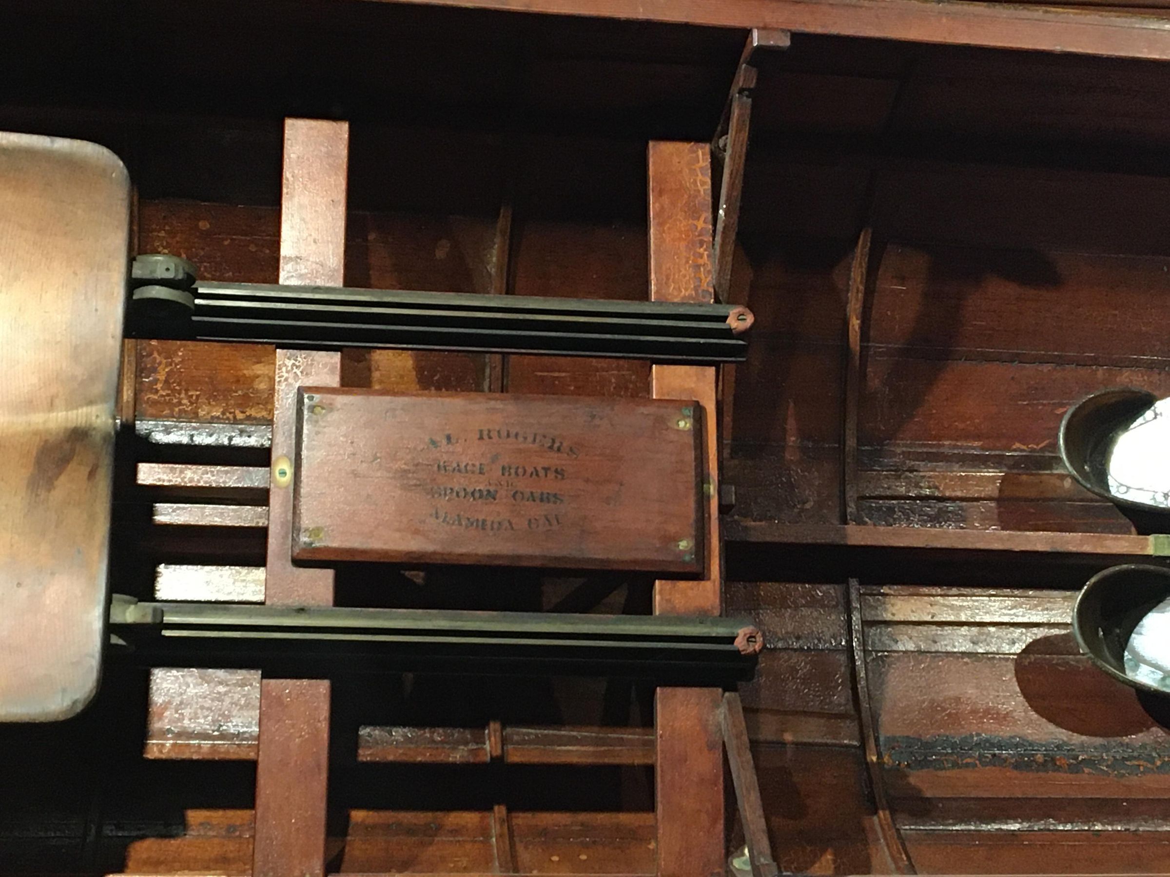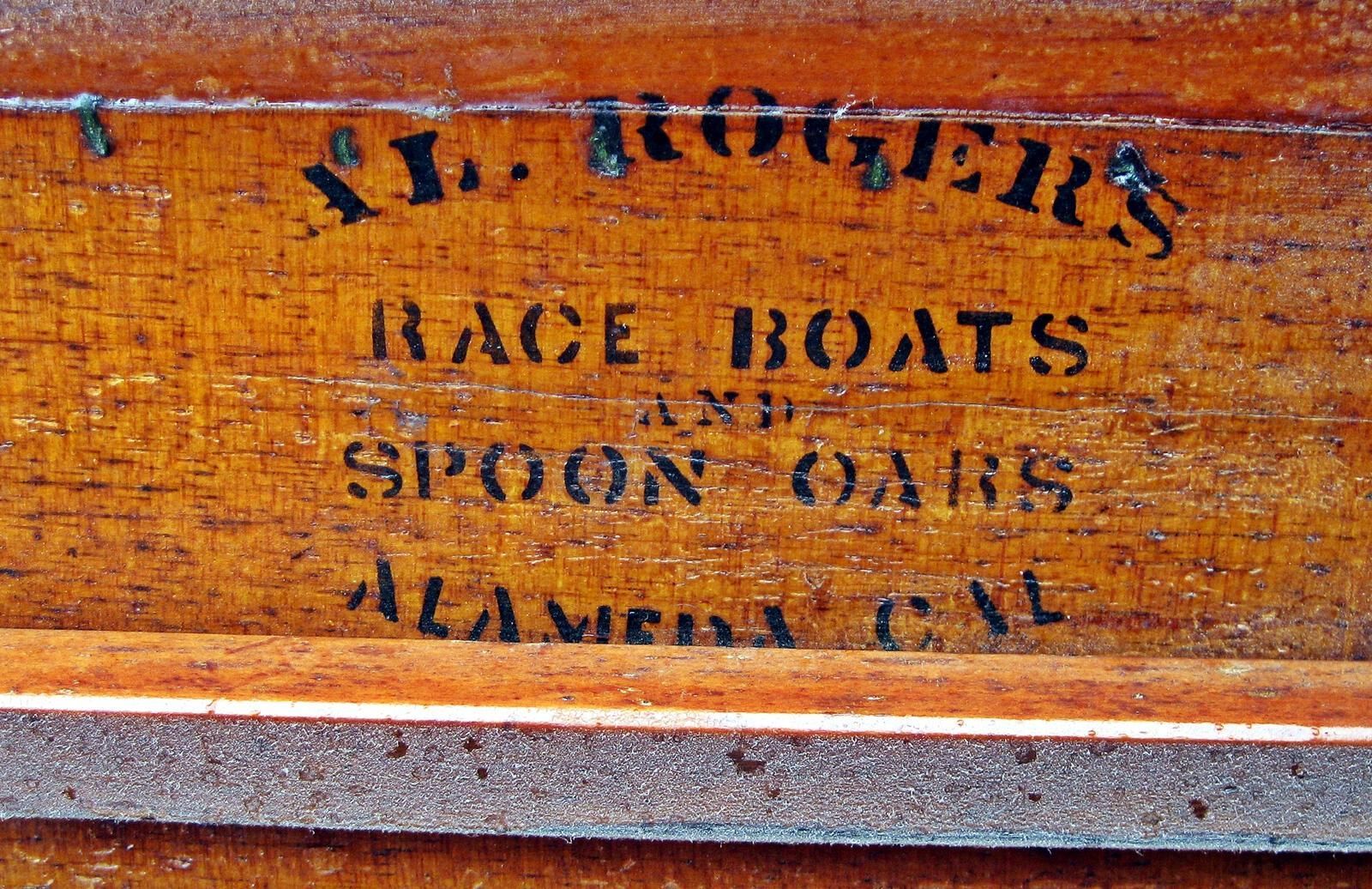 Text on board screwed inside between seat tracks: "A.L. Rogers - Race Boats - and - Spoon Oars - Alameda CAL"