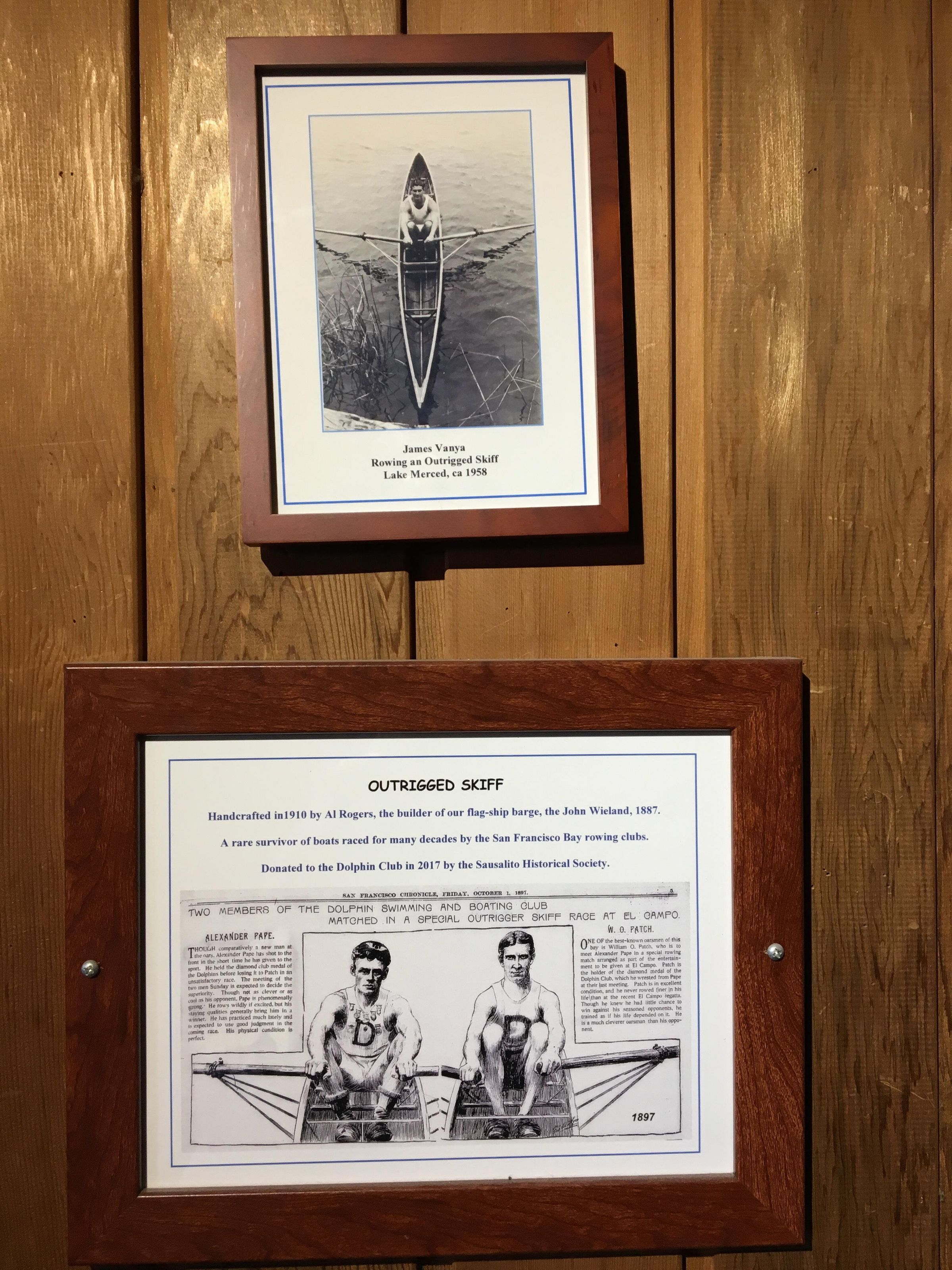 Boat built around 1910 by Al Roger who built the Wieland barge in 1887 and later, The South End barge. His boat shop was in Alameda. Likely there were various owners. The Sausalito Historical Society acquired the boat in 1980 from Harold/Russ Sommers. Since then it was displayed in the Sausalito Friends of the Library room. In early 2017 Richard Cooper of the Dolphin Club inquired about it. SHS decided they no longer could care or store the boat. They decided to donate it to the Dolphin Club. The transaction was facilitated by a $2000 donation to the SHS. On 9/13/2017 the skiff was carefully trucked to San Francisco, and two weeks later suspended from ceiling of the club entrance for display.