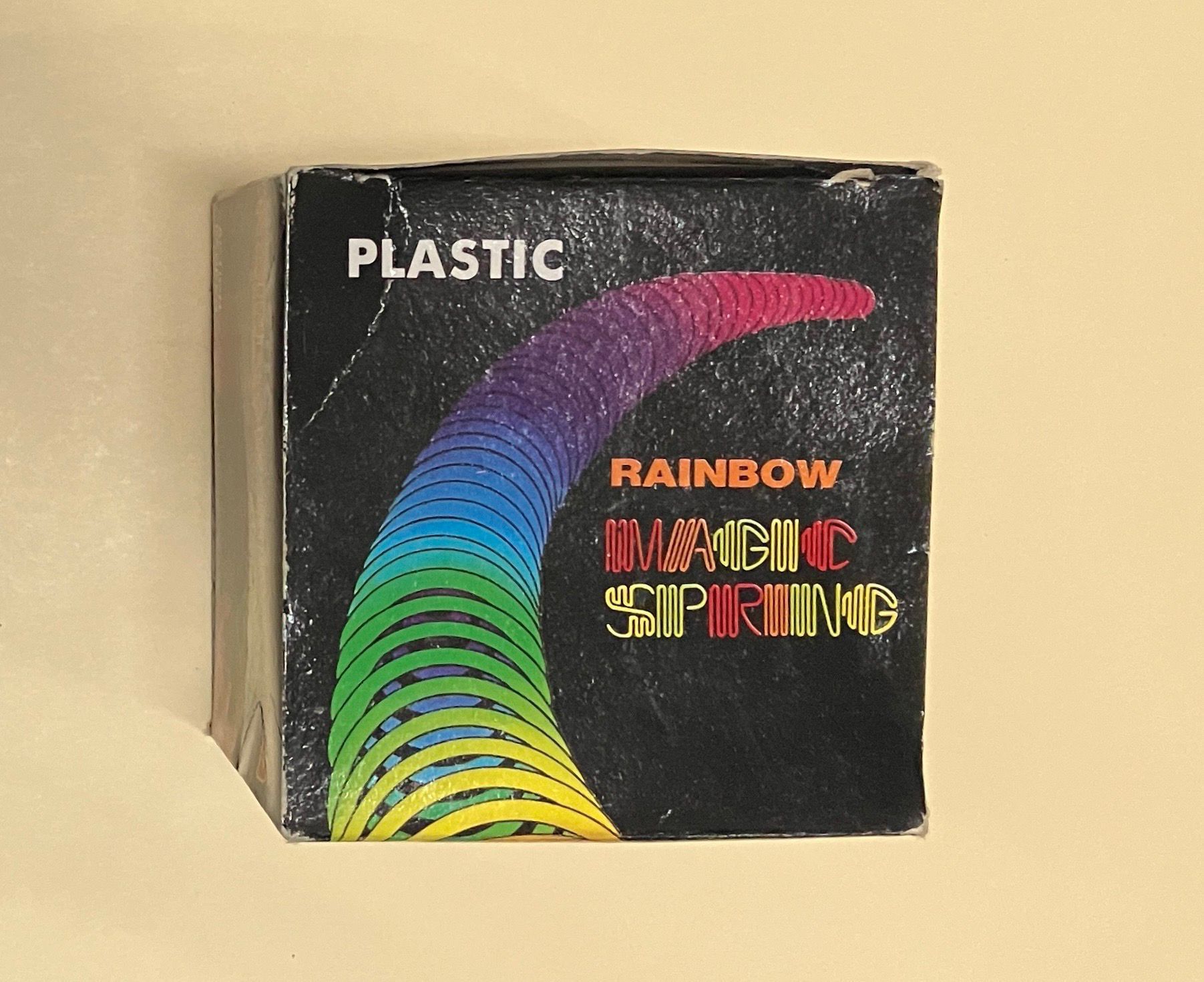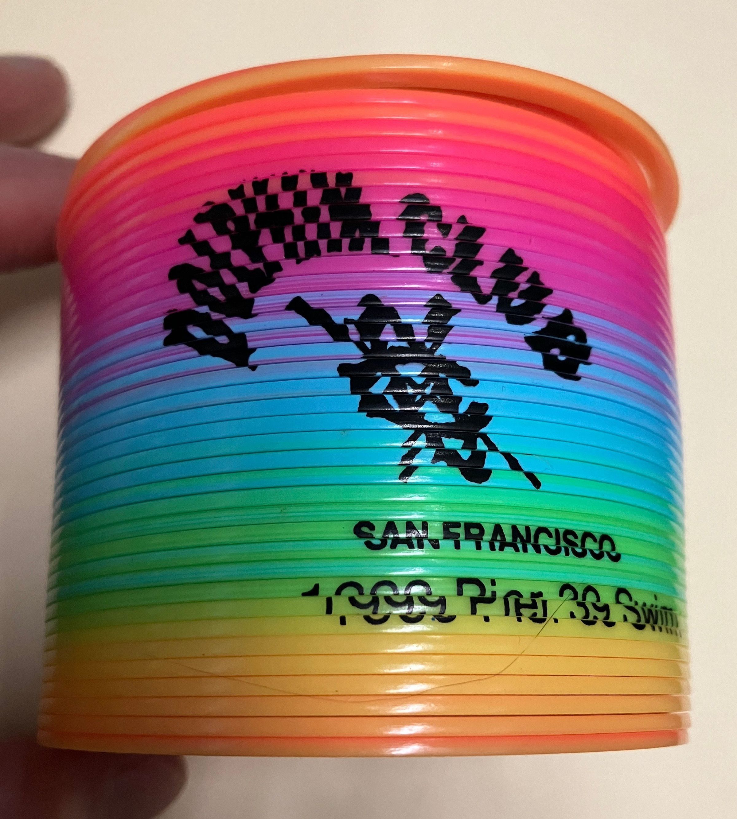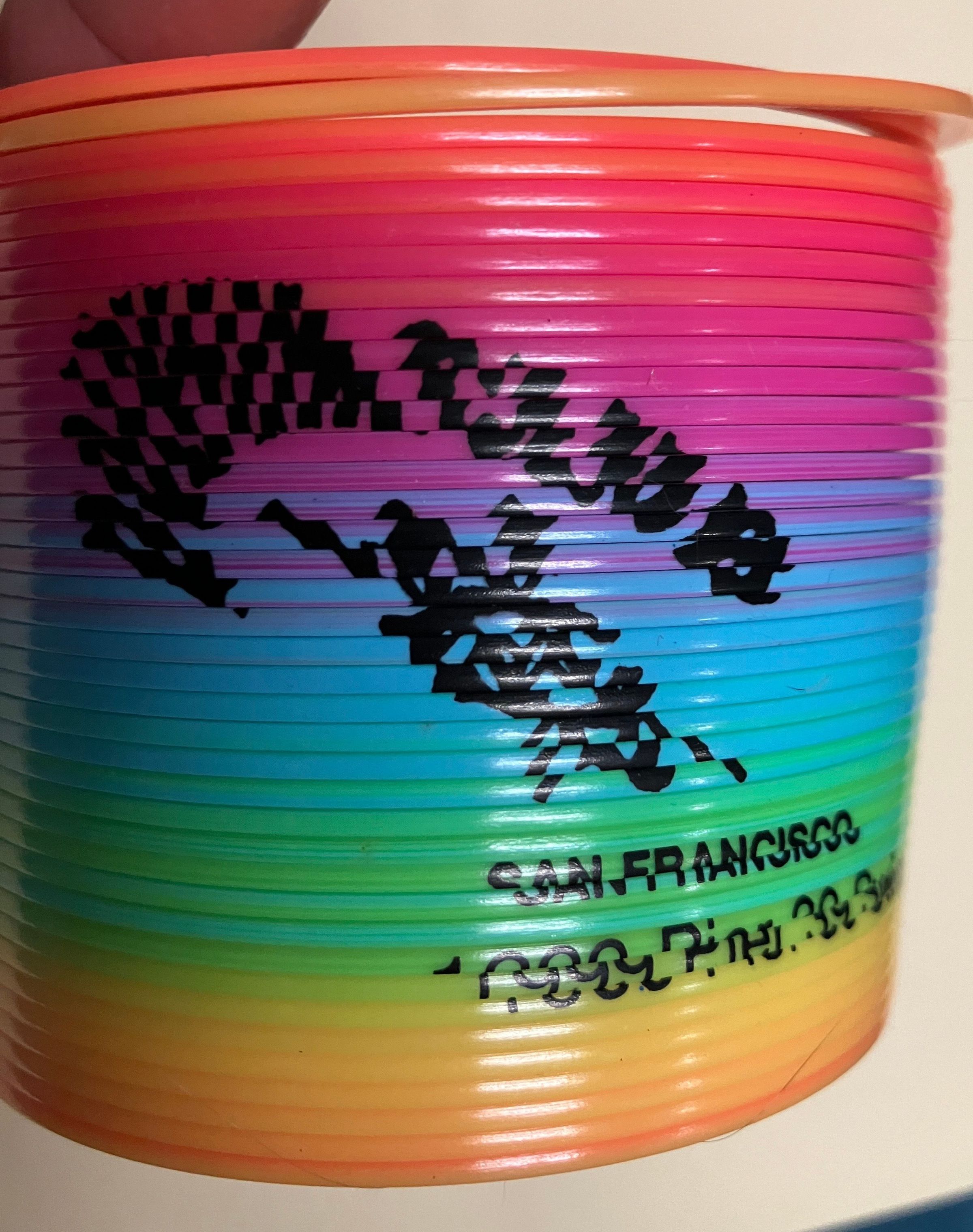 Rainbow colored plastic slinky.