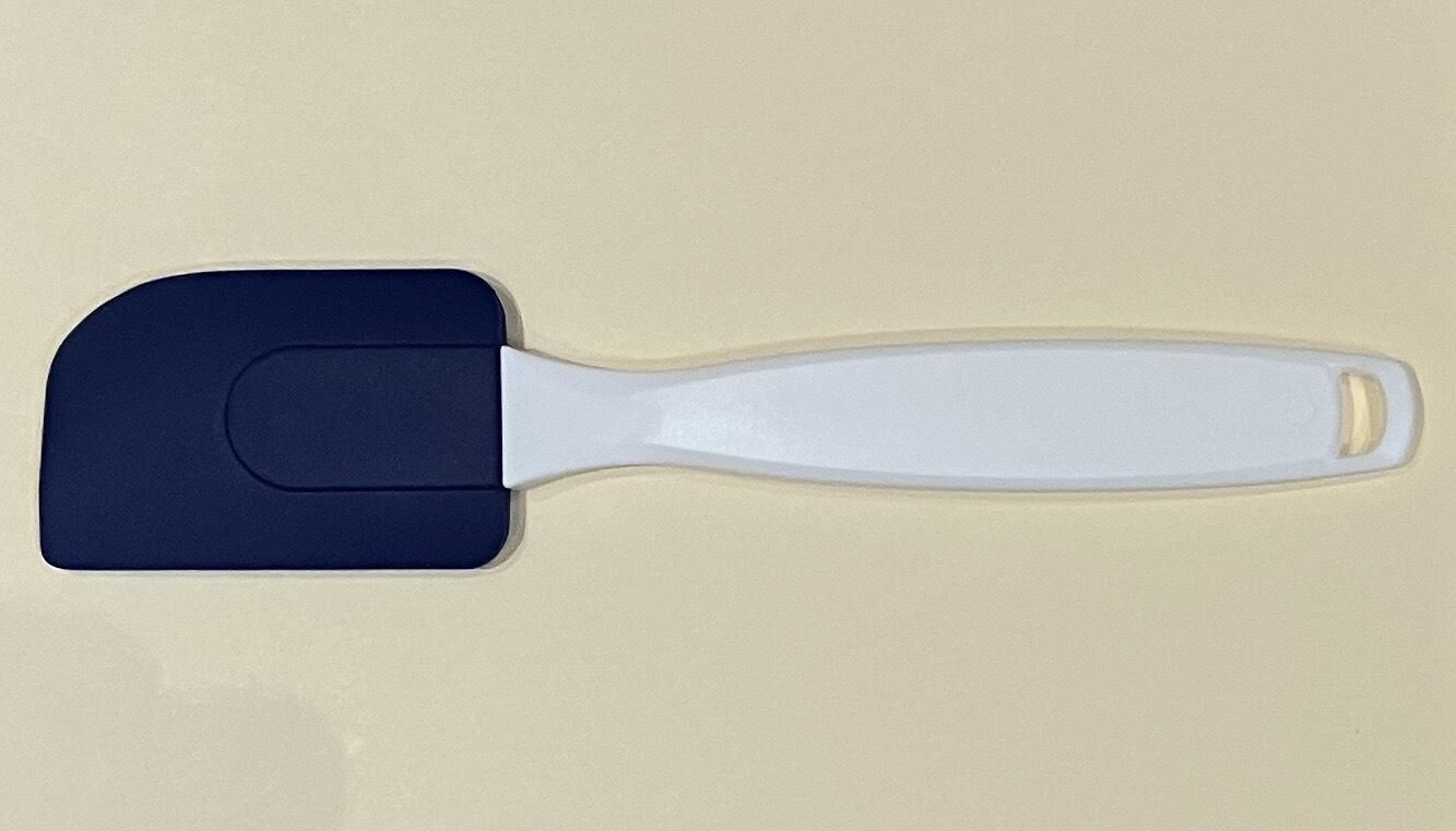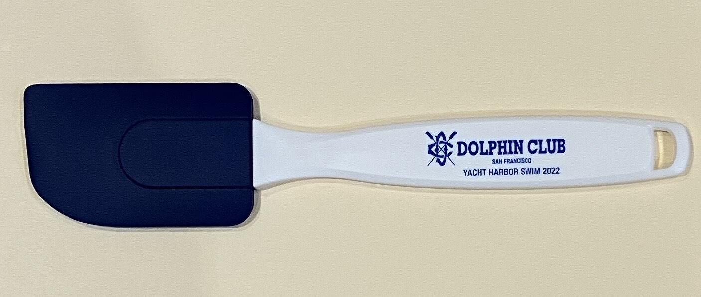 Spatula with white handle, dark blue blade, and blue writing on one side of handle. Text: DC crossed oar logo with "Dolphin Club - San Francisco - Yacht Harbor Swim 2022." (April 27, 2022)Use