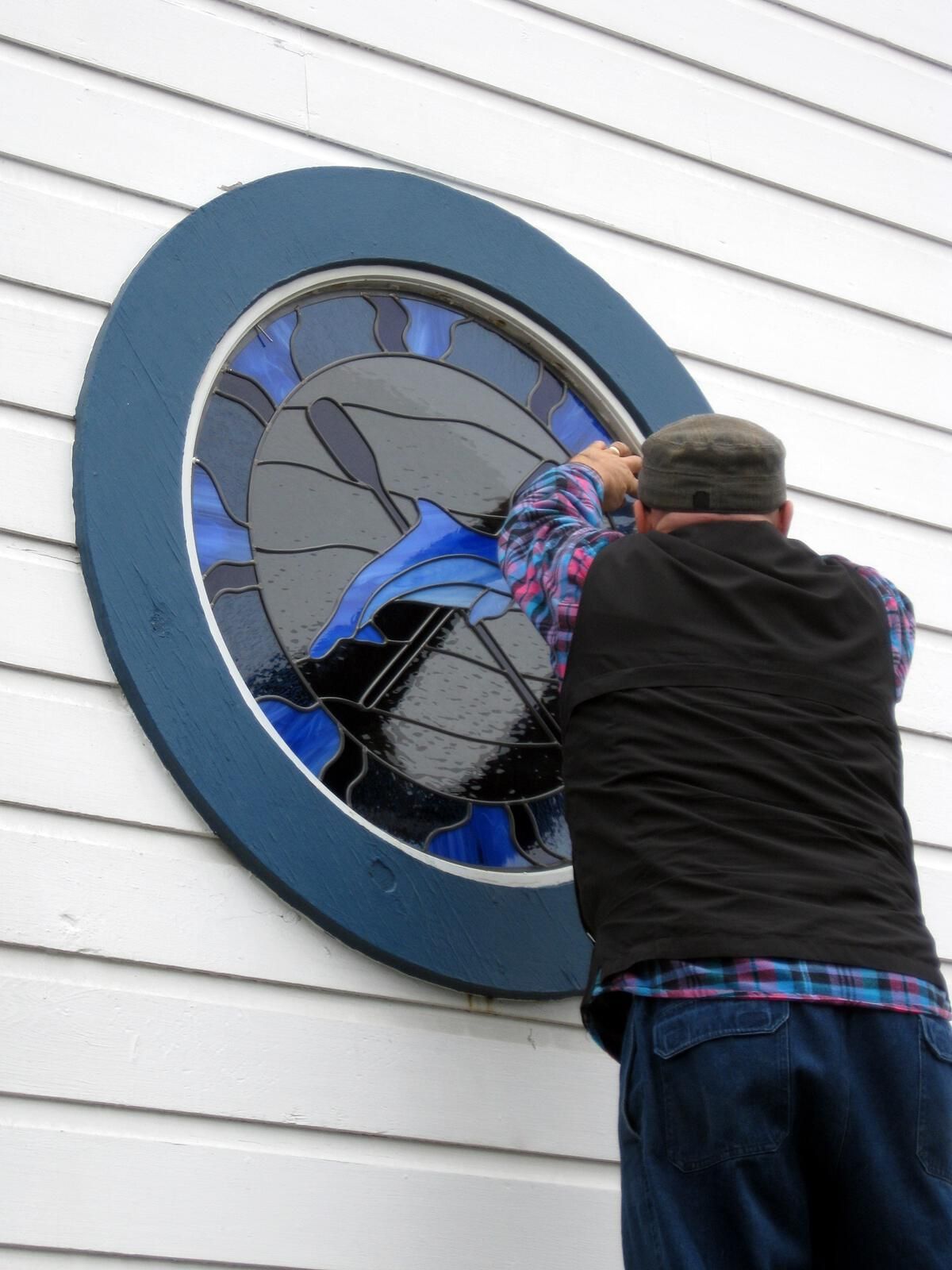 Installed August 8, 2017 in round window on front wall of Club. This is the middle of three round windows on the front of the building.