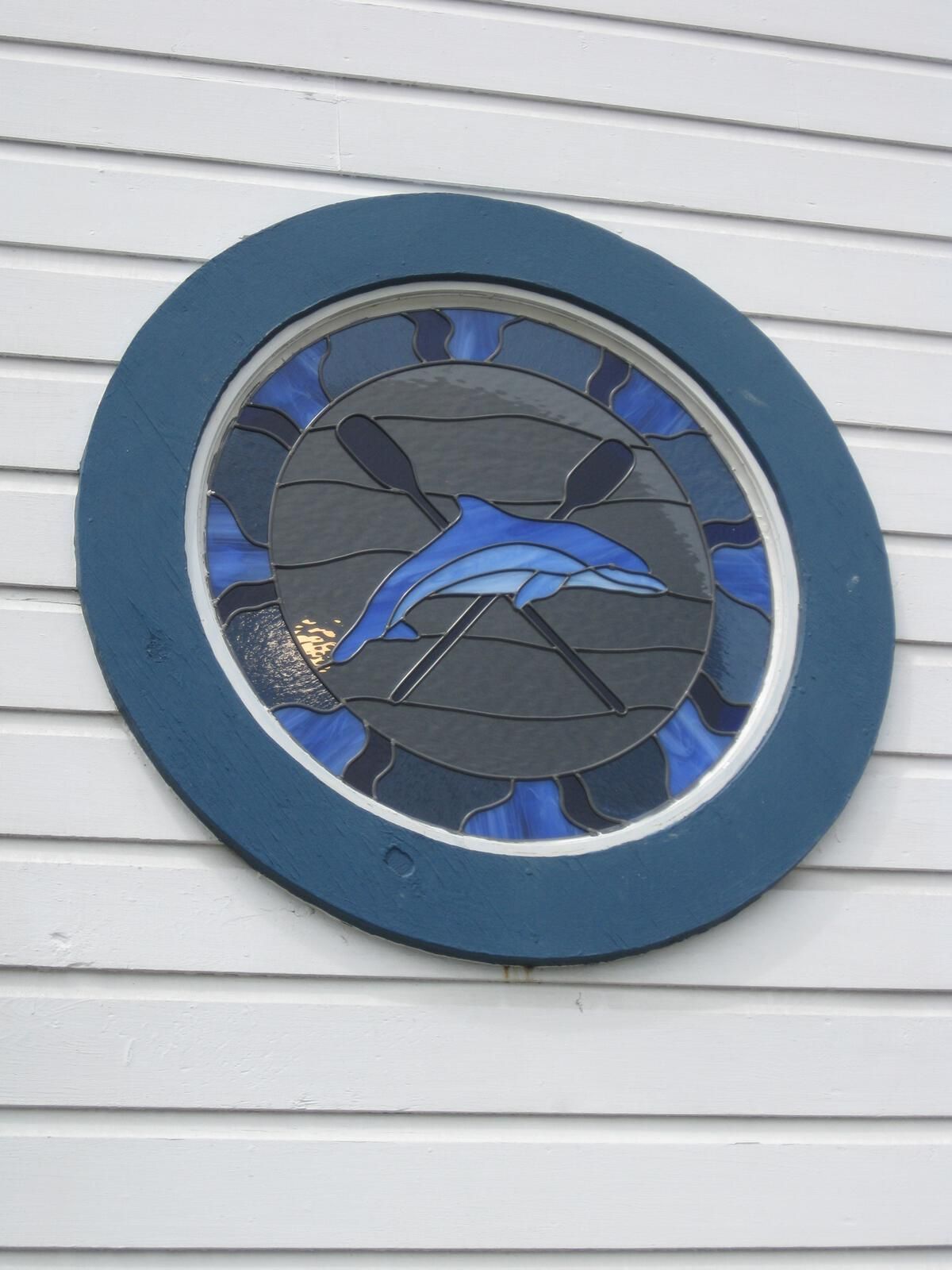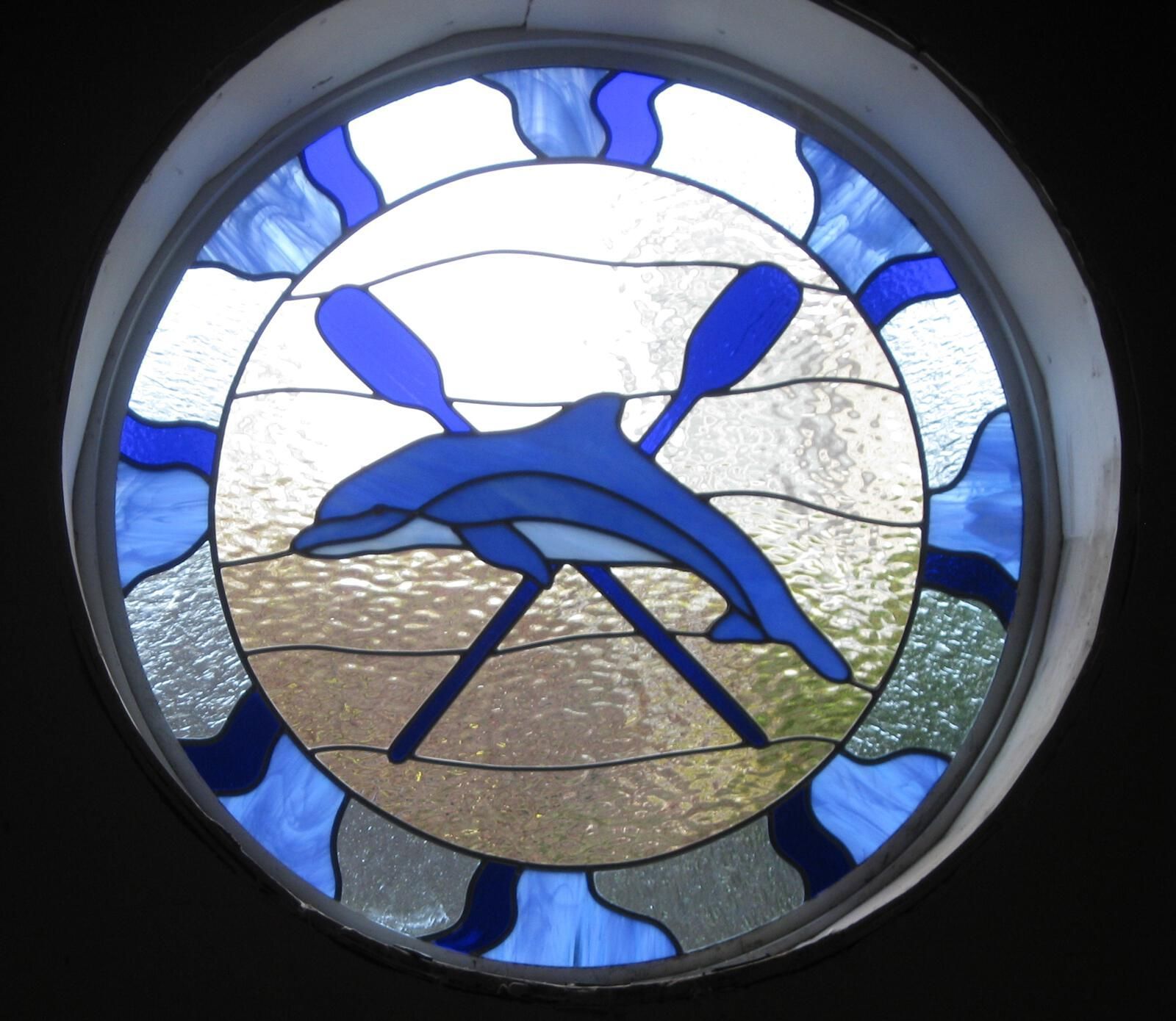 Round colored glass window. Different blue colored and clear glass in band around perimeter. Side view of dolphin in several blue colors of glass in center, with crossed dark blue oars behind it. Clear glass with horizontal metal partitions suggestive of water around the dolphin.