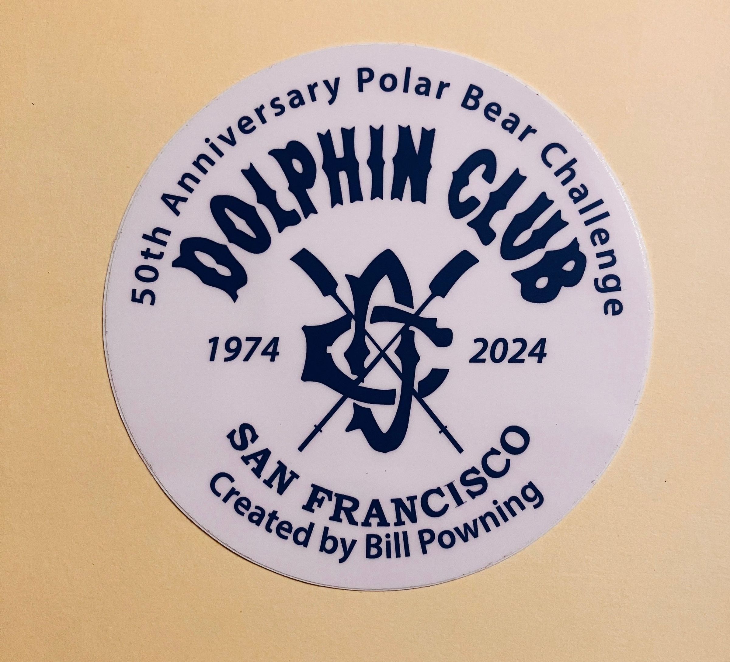 White pin with navy blue text: 50th Anniversary of Polar Bear Challenge - Dolphin club - Crossed oars logo - 1974-2024 - San Francisco - Created by Bill Powning"