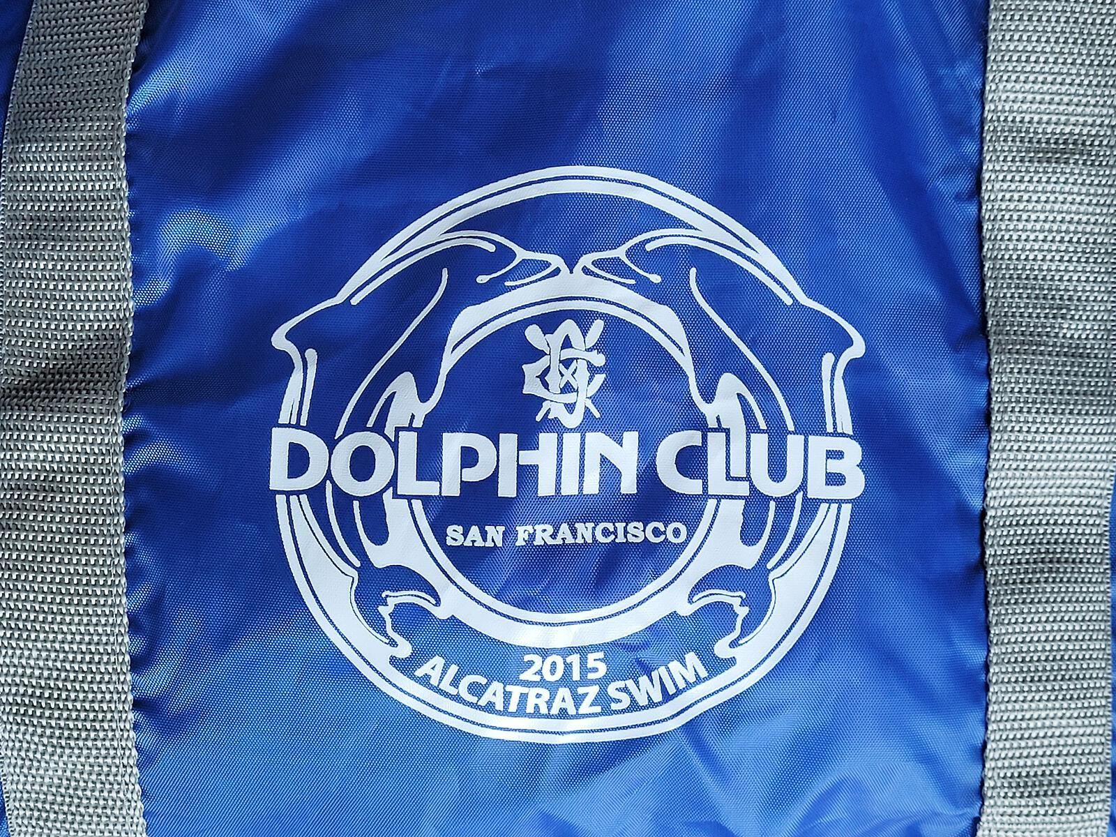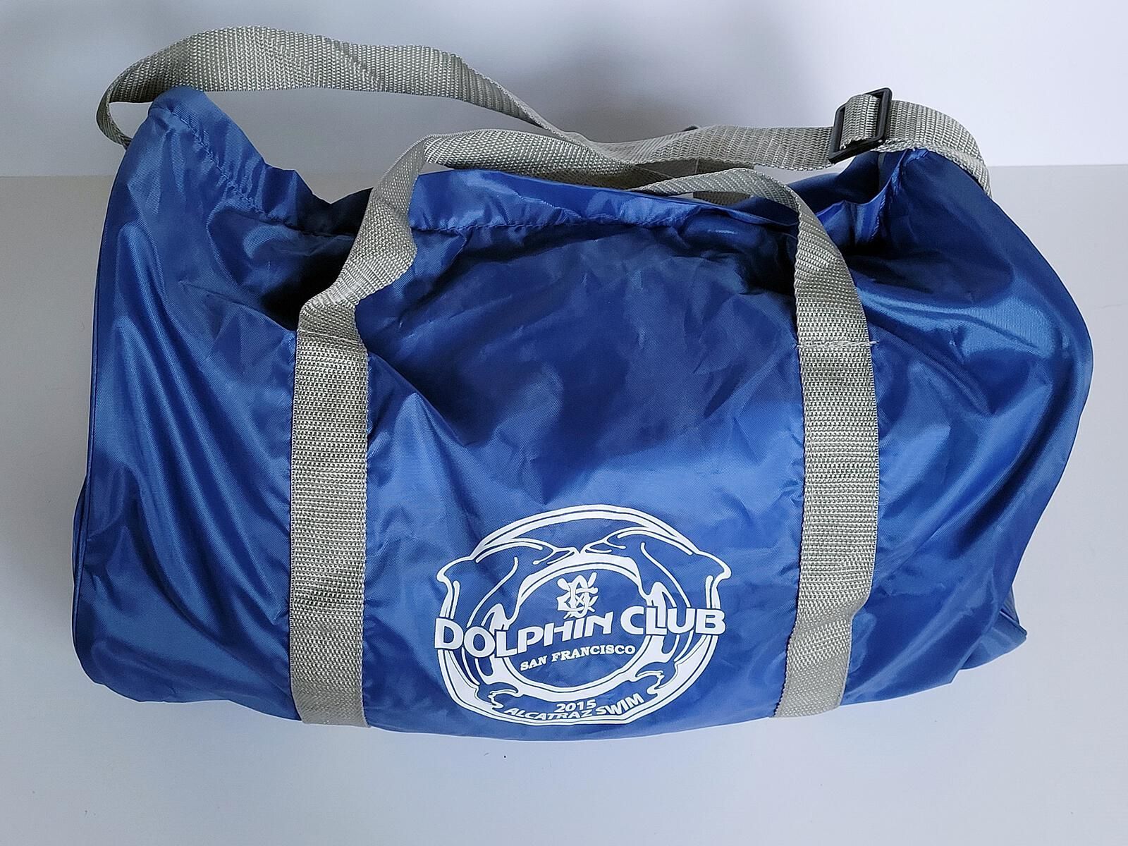 Light weight nylon blue duffle with zippered top. A white round emblem shows two dolphins, the club logo, Dolphin Club, and lettering 2015 Alcatraz Swim. There aren't any pockets. The bag has grey colored side straps and a shoulder strap.
